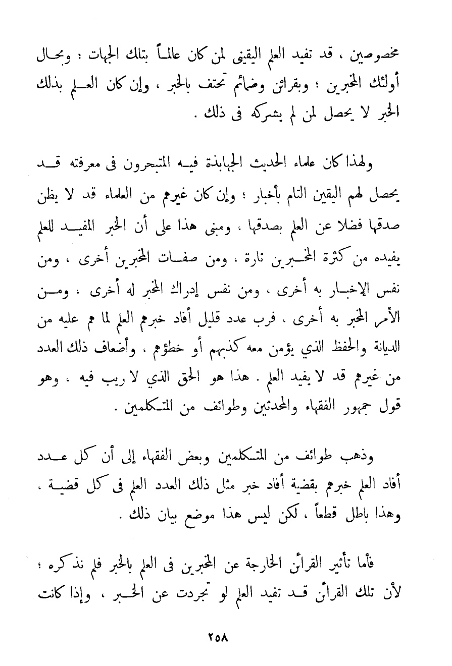 مَخْصُوصِينَ قَدْ تُفِيدُ الْعِلْمَ الْيَقِينِيَّ لِمَنْ كَانَ عَالِمًا بِتِلْكَ الْجِهَاتِ؛ وَبِحَالِ أُولَئِكَ الْمُخْبِرِينَ؛ وَبِقَرَائِنَ وضمائم تَحْتَفُّ بِالْخَبَرِ وَإِنْ كَانَ الْعِلْمُ بِذَلِكَ الْخَبَرِ لَا يَحْصُلُ لِمَنْ لَمْ يُشْرِكْهُ فِي ذَلِكَ. وَلِهَذَا كَانَ عُلَمَاءُ الْحَدِيثِ الْجَهَابِذَةُ فِيهِ الْمُتَبَحِّرُونَ فِي مَعْرِفَتِهِ قَدْ يَحْصُلُ لَهُمْ الْيَقِينُ التَّامُّ بِأَخْبَارٍ؛ وَإِنْ كَانَ غَيْرُهُمْ مِنْ الْعُلَمَاءِ قَدْ لَا يَظُنُّ صِدْقَهَا فَضْلًا عَنْ الْعِلْمِ بِصِدْقِهَا وَمَبْنَى هَذَا عَلَى أَنَّ الْخَبَرَ الْمُفِيدَ لِلْعِلْمِ يُفِيدُهُ مِنْ كَثْرَةِ الْمُخْبِرِينَ تَارَةً وَمِنْ صِفَاتِ الْمُخْبِرِينَ أُخْرَى وَمِنْ نَفْسِ الْإِخْبَارِ بِهِ أُخْرَى وَمِنْ نَفْسِ إدْرَاكِ الْمُخْبِرِ لَهُ أُخْرَى وَمِنْ الْأَمْرِ الْمُخْبَرِ بِهِ أُخْرَى فَرُبَّ عَدَدٍ قَلِيلٍ أَفَادَ خَبَرُهُمْ الْعِلْمَ لِمَا هُمْ عَلَيْهِ مِنْ الدِّيَانَةِ وَالْحِفْظِ الَّذِي يُؤْمَنُ مَعَهُ كَذِبُهُمْ أَوْ خَطَؤُهُمْ وَأَضْعَافُ ذَلِكَ الْعَدَدِ مِنْ غَيْرِهِمْ قَدْ لَا يُفِيدُ الْعِلْمَ. هَذَا هُوَ الْحَقُّ الَّذِي لَا رَيْبَ فِيهِ وَهُوَ قَوْلُ جُمْهُورِ الْفُقَهَاءِ وَالْمُحَدِّثِينَ وَطَوَائِفَ مِنْ الْمُتَكَلِّمِينَ. وَذَهَبَ طَوَائِفُ مِنْ الْمُتَكَلِّمِينَ وَبَعْضُ الْفُقَهَاءِ إلَى أَنَّ كُلَّ عَدَدٍ أَفَادَ الْعِلْمَ خَبَرُهُمْ بِقَضِيَّةِ أَفَادَ خَبَرُ مِثْلِ ذَلِكَ الْعَدَدِ الْعِلْمَ فِي كُلِّ قَضِيَّةٍ وَهَذَا بَاطِلٌ قَطْعًا لَكِنْ لَيْسَ هَذَا مَوْضِعَ بَيَانِ ذَلِكَ. فَأَمَّا تَأْثِيرُ الْقَرَائِنِ الْخَارِجَةِ عَنْ الْمُخْبِرِينَ فِي الْعِلْمِ بِالْخَبَرِ فَلَمْ نَذْكُرْهُ؛ لِأَنَّ تِلْكَ الْقَرَائِنَ قَدْ تُفِيدُ الْعِلْمَ لَوْ تَجَرَّدَتْ عَنْ الْخَبَرِ وَإِذَا كَانَتْ