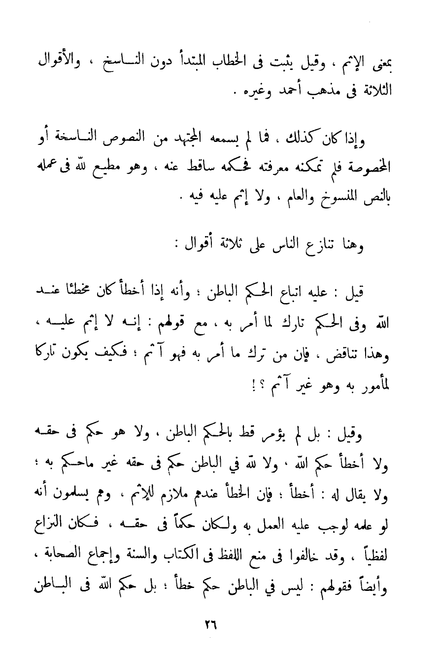 بِمَعْنَى الْإِثْمِ وَقِيلَ يَثْبُتُ فِي الْخِطَابِ الْمُبْتَدَأِ دُونَ النَّاسِخِ وَالْأَقْوَالُ الثَّلَاثَةُ فِي مَذْهَبِ أَحْمَد وَغَيْرِهِ. وَإِذَا كَانَ كَذَلِكَ فَمَا لَمْ يَسْمَعْهُ الْمُجْتَهِدُ مِنْ النُّصُوصِ النَّاسِخَةِ أَوْ الْمَخْصُوصَةِ فَلَمْ تُمْكِنْهُ مَعْرِفَتُهُ فَحُكْمُهُ سَاقِطٌ عَنْهُ وَهُوَ مُطِيعٌ لِلَّهِ فِي عَمَلِهِ بِالنَّصِّ الْمَنْسُوخِ وَالْعَامِّ وَلَا إثْمَ عَلَيْهِ فِيهِ. وَهُنَا تَنَازَعَ النَّاسُ عَلَى ثَلَاثَةِ أَقْوَالٍ: قِيلَ: عَلَيْهِ اتِّبَاعُ الْحُكْمِ الْبَاطِنِ؛ وَأَنَّهُ إذَا أَخْطَأَ كَانَ مُخْطِئًا عِنْدَ اللَّهِ وَفِي الْحُكْمِ تَارِكٌ لِمَا أُمِرَ بِهِ مَعَ قَوْلِهِمْ: إنَّهُ لَا إثْمَ عَلَيْهِ وَهَذَا تَنَاقُضٌ فَإِنَّ مَنْ تَرَكَ مَا أُمِرَ بِهِ فَهُوَ آثِمٌ؛ فَكَيْفَ يَكُونُ تَارِكًا لِمَأْمُورِ بِهِ وَهُوَ غَيْرُ آثِمٍ وَقِيلَ: بَلْ لَمْ يُؤْمَرْ قَطُّ بِالْحُكْمِ الْبَاطِنِ وَلَا هُوَ حُكْمٌ فِي حَقِّهِ وَلَا أَخْطَأَ حُكْمَ اللَّهِ وَلَا لِلَّهِ فِي الْبَاطِنِ حُكْمٌ فِي حَقِّهِ غَيْرَ مَا حَكَمَ بِهِ؛ وَلَا يُقَالُ لَهُ: أَخْطَأَ؛ فَإِنَّ الْخَطَأَ عِنْدَهُمْ مُلَازِمٌ لِلْإِثْمِ وَهُمْ يُسَلِّمُونَ أَنَّهُ لَوْ عَلِمَهُ لَوَجَبَ عَلَيْهِ الْعَمَلُ بِهِ وَلَكَانَ حُكْمًا فِي حَقِّهِ فَكَانَ النِّزَاعُ لَفْظِيًّا وَقَدْ خَالَفُوا فِي مَنْعِ اللَّفْظِ فِي الْكِتَابِ وَالسُّنَّةِ وَإِجْمَاعِ الصَّحَابَةِ وَأَيْضًا فَقَوْلُهُمْ: لَيْسَ فِي الْبَاطِنِ حُكْمٌ خَطَأٌ؛ بَلْ حُكْمُ اللَّهِ فِي الْبَاطِنِ