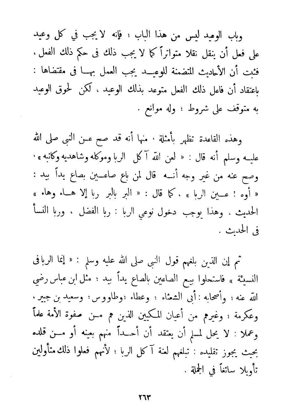 وَبَابُ الْوَعِيدِ لَيْسَ مِنْ هَذَا الْبَابِ؛ فَإِنَّهُ لَا يَجِبُ فِي كُلِّ وَعِيدٍ عَلَى فِعْلٍ أَنْ يُنْقَلَ نَقْلًا مُتَوَاتِرًا كَمَا لَا يَجِبُ ذَلِكَ فِي حُكْمِ ذَلِكَ الْفِعْلِ فَثَبَتَ أَنَّ الْأَحَادِيثَ الْمُتَضَمِّنَةَ لِلْوَعِيدِ يَجِبُ الْعَمَلُ بِهَا فِي مُقْتَضَاهَا: بِاعْتِقَادِ أَنَّ فَاعِلَ ذَلِكَ الْفِعْلِ مُتَوَعَّدٌ بِذَلِكَ الْوَعِيدِ لَكِنَّ لُحُوقَ الْوَعِيدِ بِهِ مُتَوَقِّفٌ عَلَى شُرُوطٍ؛ وَلَهُ مَوَانِعُ. وَهَذِهِ الْقَاعِدَةُ تَظْهَرُ بِأَمْثِلَةِ مِنْهَا أَنَّهُ قَدْ صَحَّ عَنْ النَّبِيِّ صَلَّى اللَّهُ عَلَيْهِ وَسَلَّمَ أَنَّهُ قَالَ: {لَعَنَ اللَّهُ آكِلَ الرِّبَا وَمُوكِلَهُ وَشَاهِدَيْهِ وَكَاتِبَهُ} وَصَحَّ عَنْهُ مِنْ غَيْرِ وَجْهٍ أَنَّهُ {قَالَ لِمَنْ بَاعَ صَاعَيْنِ بِصَاعِ يَدًا بِيَدِ: أُوهِ عَيْنُ الرِّبَا} كَمَا قَالَ: {الْبُرُّ بِالْبُرِّ رِبًا إلَّا هَاءً وَهَاءً} الْحَدِيثَ وَهَذَا يُوجِبُ دُخُولَ نَوْعَيْ الرِّبَا: رِبَا الْفَضْلِ وَرِبَا النسأ فِي الْحَدِيثِ. ثُمَّ إنَّ الَّذِينَ بَلَغَهُمْ {قَوْلُ النَّبِيِّ صَلَّى اللَّهُ عَلَيْهِ وَسَلَّمَ إنَّمَا الرِّبَا فِي النَّسِيئَةِ} فَاسْتَحَلُّوا بَيْعَ الصَّاعَيْنِ بِالصَّاعِ يَدًا بِيَدِ؛ مِثْلَ ابْنِ عَبَّاسٍ رَضِيَ اللَّهُ عَنْهُ وَأَصْحَابِهِ: أَبِي الشَّعْثَاءِ؛ وَعَطَاءٍ؛ وطاوس؛ وَسَعِيدِ بْنِ جُبَيْرٍ وَعِكْرِمَةَ؛ وَغَيْرِهِمْ مِنْ أَعْيَانِ الْمَكِّيِّينَ الَّذِينَ هُمْ مِنْ صَفْوَةِ الْأُمَّةِ عِلْمًا وَعَمَلًا: لَا يَحِلُّ لِمُسْلِمِ أَنْ يَعْتَقِدَ أَنَّ أَحَدًا مِنْهُمْ بِعَيْنِهِ أَوْ مَنْ قَلَّدَهُ بِحَيْثُ يَجُوزُ تَقْلِيدُهُ: تَبْلُغُهُمْ لَعْنَةُ آكِلِ الرِّبَا؛ لِأَنَّهُمْ فَعَلُوا ذَلِكَ مُتَأَوِّلِينَ تَأْوِيلًا سَائِغًا فِي الْجُمْلَةِ.