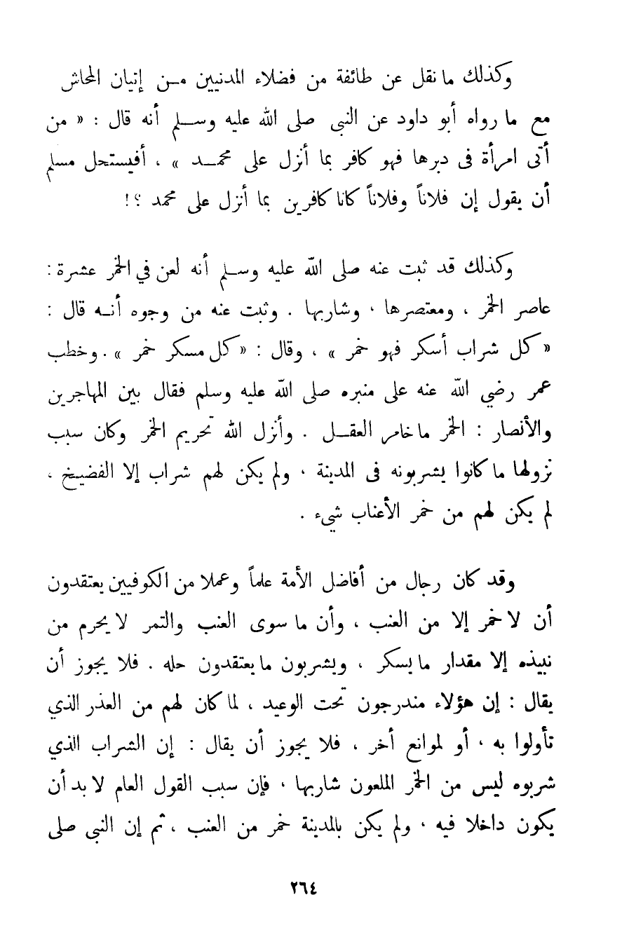 وَكَذَلِكَ مَا نُقِلَ عَنْ طَائِفَةٍ مِنْ فُضَلَاءِ الْمَدَنِيِّينَ مِنْ إتْيَانِ الْمُحَاشِ مَعَ مَا رَوَاهُ أَبُو دَاوُد عَنْ النَّبِيِّ صَلَّى اللَّهُ عَلَيْهِ وَسَلَّمَ أَنَّهُ قَالَ: {مَنْ أَتَى امْرَأَةً فِي دُبُرِهَا فَهُوَ كَافِرٌ بِمَا أُنْزِلَ عَلَى مُحَمَّدٍ} أَفَيَسْتَحِلُّ مُسْلِمٌ أَنْ يَقُولَ إنَّ فُلَانًا وَفُلَانًا كَانَا كَافِرَيْنِ بِمَا أُنْزِلَ عَلَى مُحَمَّدٍ وَكَذَلِكَ {قَدْ ثَبَتَ عَنْهُ صَلَّى اللَّهُ عَلَيْهِ وَسَلَّمَ أَنَّهُ لَعَنَ فِي الْخَمْرِ عَشَرَةً: عَاصِرَ الْخَمْرِ وَمُعْتَصِرَهَا وَشَارِبَهَا} . وَثَبَتَ عَنْهُ مِنْ وُجُوهٍ أَنَّهُ قَالَ: {كُلُّ شَرَابٍ أَسْكَرَ فَهُوَ خَمْرٌ} وَقَالَ: {كُلُّ مُسْكِرٍ خَمْرٌ} . وَخَطَبَ عُمَرُ رَضِيَ اللَّهُ عَنْهُ عَلَى مِنْبَرِهِ صَلَّى اللَّهُ عَلَيْهِ وَسَلَّمَ فَقَالَ بَيْنَ الْمُهَاجِرِينَ وَالْأَنْصَارِ: الْخَمْرُ مَا خَامَرَ الْعَقْلَ. وَأَنْزَلَ اللَّهُ تَحْرِيمَ الْخَمْرِ وَكَانَ سَبَبُ نُزُولِهَا مَا كَانُوا يَشْرَبُونَهُ فِي الْمَدِينَةِ وَلَمْ يَكُنْ لَهُمْ شَرَابٌ إلَّا الْفَضِيخُ لَمْ يَكُنْ لَهُمْ مِنْ خَمْرِ الْأَعْنَابِ شَيْءٌ. وَقَدْ كَانَ رِجَالٌ مِنْ أَفَاضِلِ الْأُمَّةِ عِلْمًا وَعَمَلًا مِنْ الْكُوفِيِّينَ يَعْتَقِدُونَ أَنْ لَا خَمْرَ إلَّا مِنْ الْعِنَبِ وَأَنَّ مَا سِوَى الْعِنَبِ وَالتَّمْرِ لَا يَحْرُمُ مِنْ نَبِيذِهِ إلَّا مِقْدَارُ مَا يُسْكِرُ وَيَشْرَبُونَ مَا يَعْتَقِدُونَ حِلَّهُ. فَلَا يَجُوزُ أَنْ يُقَالَ: إنَّ هَؤُلَاءِ مُنْدَرِجُونَ تَحْتَ الْوَعِيدِ لِمَا كَانَ لَهُمْ مِنْ الْعُذْرِ الَّذِي تَأَوَّلُوا بِهِ أَوْ لِمَوَانِعَ أُخَرَ فَلَا يَجُوزُ أَنْ يُقَالَ: إنَّ الشَّرَابَ الَّذِي شَرِبُوهُ لَيْسَ مِنْ الْخَمْرِ الْمَلْعُونِ شَارِبُهَا فَإِنَّ سَبَبَ الْقَوْلِ الْعَامِّ لَا بُدَّ أَنْ يَكُونَ دَاخِلًا فِيهِ وَلَمْ يَكُنْ بِالْمَدِينَةِ خَمْرٌ مِنْ الْعِنَبِ ثُمَّ {إنَّ النَّبِيَّ