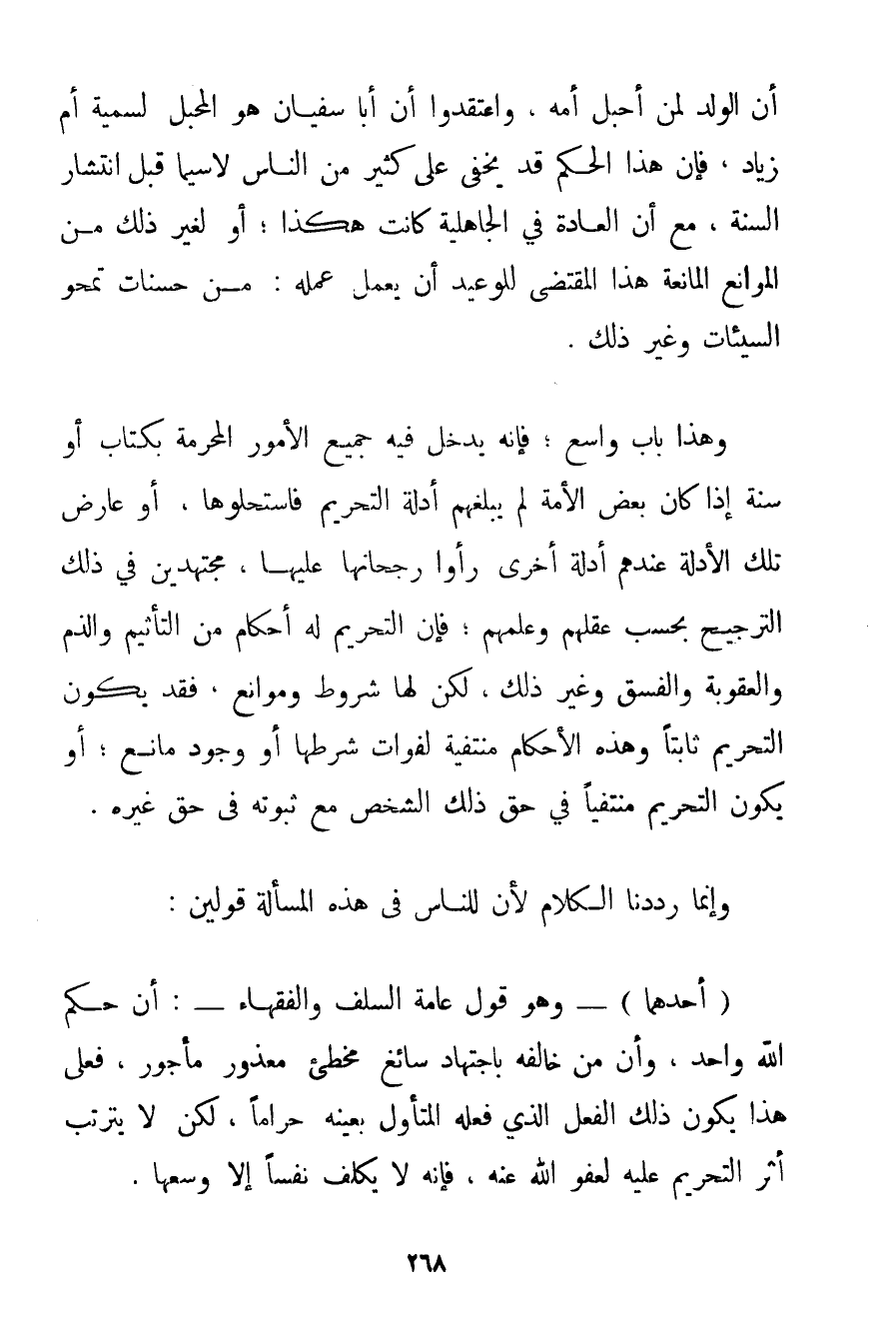 وَهَذَا بَابٌ وَاسِعٌ؛ فَإِنَّهُ يَدْخُلُ فِيهِ جَمِيعُ الْأُمُورِ الْمُحَرَّمَةِ بِكِتَابِ أَوْ سُنَّةٍ إذَا كَانَ بَعْضُ الْأُمَّةِ لَمْ يَبْلُغْهُمْ أَدِلَّةُ التَّحْرِيمِ فَاسْتَحَلُّوهَا أَوْ عَارَضَ تِلْكَ الْأَدِلَّةَ عِنْدَهُمْ أَدِلَّةٌ أُخْرَى رَأَوْا رُجْحَانَهَا عَلَيْهَا مُجْتَهِدِينَ فِي ذَلِكَ التَّرْجِيحِ بِحَسَبِ عَقْلِهِمْ وَعِلْمِهِمْ؛ فَإِنَّ التَّحْرِيمَ لَهُ أَحْكَامٌ مِنْ التَّأْثِيمِ وَالذَّمِّ وَالْعُقُوبَةِ وَالْفِسْقِ وَغَيْرِ ذَلِكَ لَكِنْ لَهَا شُرُوطٌ وَمَوَانِعُ فَقَدْ يَكُونُ التَّحْرِيمُ ثَابِتًا وَهَذِهِ الْأَحْكَامُ مُنْتَفِيَةٌ لِفَوَاتِ شَرْطِهَا أَوْ وُجُودِ مَانِعٍ؛ أَوْ يَكُونُ التَّحْرِيمُ مُنْتَفِيًا فِي حَقِّ ذَلِكَ الشَّخْصِ مَعَ ثُبُوتِهِ فِي حَقِّ غَيْرِهِ. وَإِنَّمَا رَدَدْنَا الْكَلَامَ لِأَنَّ لِلنَّاسِ فِي هَذِهِ الْمَسْأَلَةِ قَوْلَيْنِ: