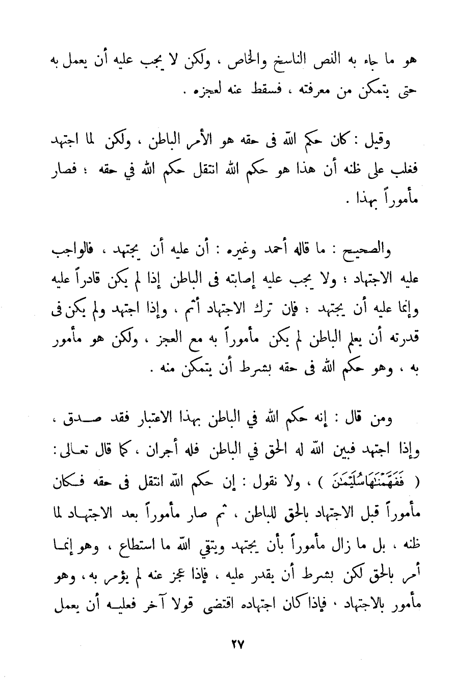 هُوَ مَا جَاءَ بِهِ النَّصُّ النَّاسِخُ وَالْخَاصُّ وَلَكِنْ لَا يَجِبُ عَلَيْهِ أَنْ يَعْمَلَ بِهِ حَتَّى يَتَمَكَّنَ مِنْ مَعْرِفَتِهِ فَسَقَطَ عَنْهُ لِعَجْزِهِ. وَقِيلَ: كَانَ حُكْمُ اللَّهِ فِي حَقِّهِ هُوَ الْأَمْرُ الْبَاطِنُ وَلَكِنْ لَمَّا اجْتَهَدَ فَغَلَبَ عَلَى ظَنِّهِ أَنَّ هَذَا هُوَ حُكْمُ اللَّهِ انْتَقَلَ حُكْمُ اللَّهِ فِي حَقِّهِ؛ فَصَارَ مَأْمُورًا بِهَذَا. وَالصَّحِيحُ: مَا قَالَهُ أَحْمَد وَغَيْرُهُ: أَنَّ عَلَيْهِ أَنْ يَجْتَهِدَ فَالْوَاجِبُ عَلَيْهِ الِاجْتِهَادُ؛ وَلَا يَجِبُ عَلَيْهِ إصَابَتُهُ فِي الْبَاطِنِ إذَا لَمْ يَكُنْ قَادِرًا عَلَيْهِ وَإِنَّمَا عَلَيْهِ أَنْ يَجْتَهِدَ؛ فَإِنْ تَرَكَ الِاجْتِهَادَ أَثِمَ وَإِذَا اجْتَهَدَ وَلَمْ يَكُنْ فِي قُدْرَتِهِ أَنْ يَعْلَمَ الْبَاطِنَ لَمْ يَكُنْ مَأْمُورًا بِهِ مَعَ الْعَجْزِ وَلَكِنْ هُوَ مَأْمُورٌ بِهِ وَهُوَ حُكْمُ اللَّهِ فِي حَقِّهِ بِشَرْطِ أَنْ يَتَمَكَّنَ مِنْهُ. وَمَنْ قَالَ: إنَّهُ حُكْمُ اللَّهِ فِي الْبَاطِنِ بِهَذَا الِاعْتِبَارِ فَقَدْ صَدَقَ وَإِذَا اجْتَهَدَ فَبَيَّنَ اللَّهُ لَهُ الْحَقَّ فِي الْبَاطِنِ فَلَهُ أَجْرَانِ كَمَا قَالَ تَعَالَى: {فَفَهَّمْنَاهَا سُلَيْمَانَ} وَلَا نَقُولُ: إنَّ حُكْمَ اللَّهِ انْتَقَلَ فِي حَقِّهِ فَكَانَ مَأْمُورًا قَبْلَ الِاجْتِهَادِ بِالْحَقِّ لِلْبَاطِنِ ثُمَّ صَارَ مَأْمُورًا بَعْدَ الِاجْتِهَادِ لِمَا ظَنَّهُ بَلْ مَا زَالَ مَأْمُورًا بِأَنْ يَجْتَهِدَ وَيَتَّقِيَ اللَّهَ مَا اسْتَطَاعَ وَهُوَ إنَّمَا أُمِرَ بِالْحَقِّ لَكِنْ بِشَرْطِ أَنْ يَقْدِرَ عَلَيْهِ. فَإِذَا عَجَزَ عَنْهُ لَمْ يُؤْمَرْ بِهِ وَهُوَ مَأْمُورٌ بِالِاجْتِهَادِ فَإِذَا كَانَ اجْتِهَادُهُ اقْتَضَى قَوْلًا آخَرَ فَعَلَيْهِ أَنْ يَعْمَلَ
