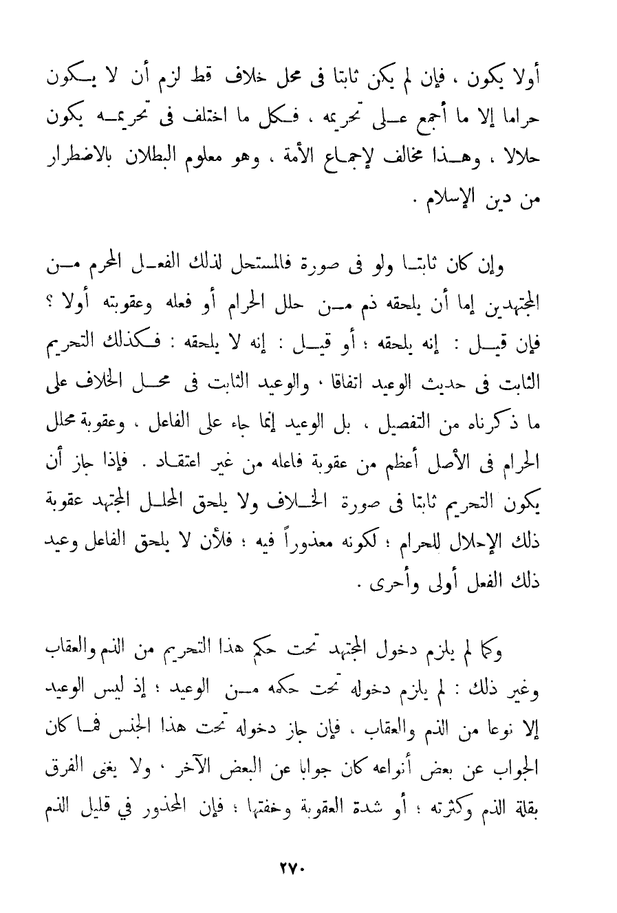 أَوْ لَا يَكُونَ فَإِنْ لَمْ يَكُنْ ثَابِتًا فِي مَحَلِّ خِلَافٍ قَطُّ لَزِمَ أَنْ لَا يَكُونَ حَرَامًا إلَّا مَا أُجْمِعَ عَلَى تَحْرِيمِهِ فَكُلُّ مَا اُخْتُلِفَ فِي تَحْرِيمِهِ يَكُونُ حَلَالًا وَهَذَا مُخَالِفٌ لِإِجْمَاعِ الْأُمَّةِ وَهُوَ مَعْلُومُ الْبُطْلَانِ بِالِاضْطِرَارِ مِنْ دِينِ الْإِسْلَامِ. وَإِنْ كَانَ ثَابِتًا وَلَوْ فِي صُورَةٍ فَالْمُسْتَحِلُّ لِذَلِكَ الْفِعْلِ الْمُحَرَّمِ مِنْ الْمُجْتَهِدِينَ إمَّا أَنْ يَلْحَقَهُ ذَمَّ مَنْ حَلَّلَ الْحَرَامَ أَوْ فَعَلَهُ وَعُقُوبَتُهُ أَوْ لَا؟ فَإِنْ قِيلَ: إنَّهُ يَلْحَقُهُ؛ أَوْ قِيلَ: إنَّهُ لَا يَلْحَقُهُ: فَكَذَلِكَ التَّحْرِيمُ الثَّابِتُ فِي حَدِيثِ الْوَعِيدِ اتِّفَاقًا وَالْوَعِيدُ الثَّابِتُ فِي مَحَلِّ الْخِلَافِ عَلَى مَا ذَكَرْنَاهُ مِنْ التَّفْصِيلِ بَلْ الْوَعِيدُ إنَّمَا جَاءَ عَلَى الْفَاعِلِ وَعُقُوبَةُ مُحَلِّلِ الْحَرَامِ فِي الْأَصْلِ أَعْظَمُ مِنْ عُقُوبَةِ فَاعِلِهِ مِنْ غَيْرِ اعْتِقَادٍ، فَإِذَا جَازَ أَنْ يَكُونَ التَّحْرِيمُ ثَابِتًا فِي صُورَةِ الْخِلَافِ وَلَا يَلْحَقُ الْمُحَلِّلَ الْمُجْتَهِدَ عُقُوبَةُ ذَلِكَ الْإِحْلَالِ لِلْحَرَامِ؛ لِكَوْنِهِ مَعْذُورًا فِيهِ؛ فَلِأَنْ لَا يَلْحَقَ الْفَاعِلَ وَعِيدُ ذَلِكَ الْفِعْلِ أَوْلَى وَأَحْرَى. وَكَمَا لَمْ يَلْزَمْ دُخُولُ الْمُجْتَهِدِ تَحْتَ حُكْمِ هَذَا التَّحْرِيمِ مِنْ الذَّمِّ وَالْعِقَابِ وَغَيْرِ ذَلِكَ: لَمْ يَلْزَمْ دُخُولُهُ تَحْتَ حُكْمِهِ مِنْ الْوَعِيدِ؛ إذْ لَيْسَ الْوَعِيدُ إلَّا نَوْعًا مِنْ الذَّمِّ وَالْعِقَابِ فَإِنْ جَاز دُخُولُهُ تَحْتَ هَذَا الْجِنْسِ فَمَا كَانَ الْجَوَابُ عَنْ بَعْضِ أَنْوَاعِهِ كَانَ جَوَابًا عَنْ الْبَعْضِ الْآخَرِ وَلَا يُغْنِي الْفَرْقُ بِقِلَّةِ الذَّمِّ وَكَثْرَتِهِ؛ أَوْ شِدَّةِ الْعُقُوبَةِ وَخِفَّتِهَا؛ فَإِنَّ الْمَحْذُورَ فِي قَلِيلِ الذَّمِّ