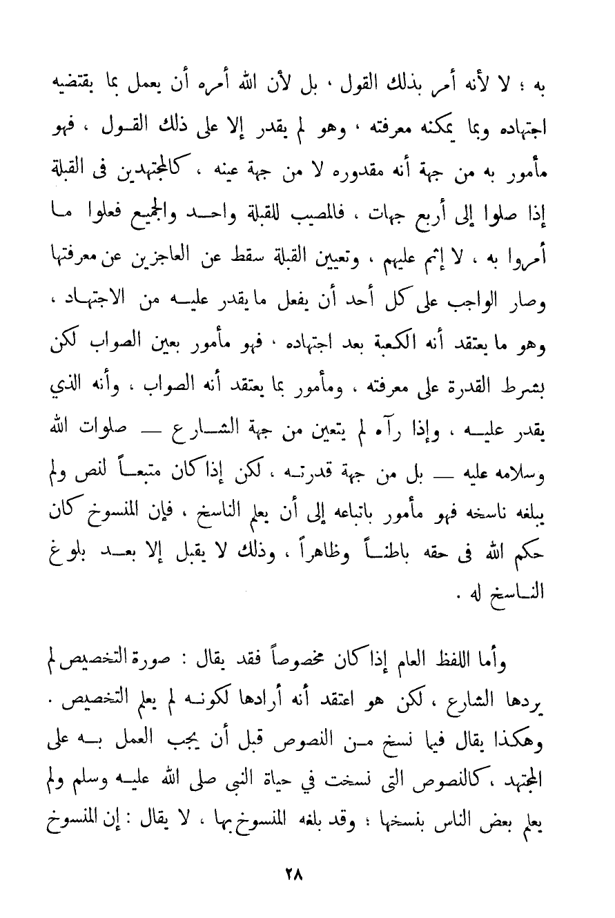 بِهِ؛ لَا لِأَنَّهُ أُمِرَ بِذَلِكَ الْقَوْلِ بَلْ لِأَنَّ اللَّهَ أَمَرَهُ أَنْ يَعْمَلَ بِمَا يَقْتَضِيهِ اجْتِهَادُهُ وَبِمَا يُمْكِنُهُ مَعْرِفَتُهُ وَهُوَ لَمْ يَقْدِرْ إلَّا عَلَى ذَلِكَ الْقَوْلِ فَهُوَ مَأْمُورٌ بِهِ مِنْ جِهَةِ أَنَّهُ مَقْدُورُهُ لَا مِنْ جِهَةِ عَيْنِهِ كَالْمُجْتَهِدِينَ فِي الْقِبْلَةِ إذَا صَلَّوْا إلَى أَرْبَعِ جِهَاتٍ فَالْمُصِيبُ لِلْقِبْلَةِ وَاحِدٌ وَالْجَمِيعُ فَعَلُوا مَا أُمِرُوا بِهِ لَا إثْمَ عَلَيْهِمْ وَتَعْيِينُ الْقِبْلَةِ سَقَطَ عَنْ الْعَاجِزِينَ عَنْ مَعْرِفَتِهَا وَصَارَ الْوَاجِبُ عَلَى كُلِّ أَحَدٍ أَنْ يَفْعَلَ مَا يَقْدِرَ عَلَيْهِ مِنْ الِاجْتِهَادِ وَهُوَ مَا يَعْتَقِدُ أَنَّهُ الْكَعْبَةُ بَعْدَ اجْتِهَادِهِ فَهُوَ مَأْمُورٌ بِعَيْنِ الصَّوَابِ لَكِنْ بِشَرْطِ الْقُدْرَةِ عَلَى مَعْرِفَتِهِ وَمَأْمُورٌ بِمَا يَعْتَقِدُ أَنَّهُ الصَّوَابُ وَأَنَّهُ الَّذِي يَقْدِرُ عَلَيْهِ وَإِذَا رَآهُ لَمْ يَتَعَيَّنْ مِنْ جِهَةِ الشَّارِعِ - صَلَوَاتُ اللَّهِ وَسَلَامُهُ عَلَيْهِ - بَلْ مِنْ جِهَةِ قُدْرَتِهِ لَكِنْ إذَا كَانَ مُتَّبِعًا لِنَصِّ وَلَمْ يَبْلُغْهُ نَاسِخُهُ فَهُوَ مَأْمُورٌ بِاتِّبَاعِهِ إلَى أَنْ يَعْلَمَ النَّاسِخَ فَإِنَّ الْمَنْسُوخَ كَانَ حُكْمُ اللَّهِ فِي حَقِّهِ بَاطِنًا وَظَاهِرًا وَذَلِكَ لَا يُقْبَلُ إلَّا بَعْدَ بُلُوغِ النَّاسِخِ لَهُ. وَأَمَّا اللَّفْظُ الْعَامُّ إذَا كَانَ مَخْصُوصًا فَقَدْ يُقَالُ: صُورَةُ التَّخْصِيصِ لَمْ يُرِدْهَا الشَّارِعُ لَكِنْ هُوَ اعْتَقَدَ أَنَّهُ أَرَادَهَا لِكَوْنِهِ لَمْ يَعْلَمْ التَّخْصِيصَ. وَهَكَذَا يُقَالُ فِيمَا نُسِخَ مِنْ النُّصُوصِ قَبْلَ أَنْ يَجِبَ الْعَمَلُ بِهِ عَلَى الْمُجْتَهِدِ كَالنُّصُوصِ الَّتِي نُسِخَتْ فِي حَيَاةِ النَّبِيِّ صَلَّى اللَّهُ عَلَيْهِ وَسَلَّمَ وَلَمْ يَعْلَمْ بَعْضُ النَّاسِ بِنَسْخِهَا؛ وَقَدْ بَلَغَهُ الْمَنْسُوخُ بِهَا لَا يُقَالُ: إنَّ الْمَنْسُوخَ
