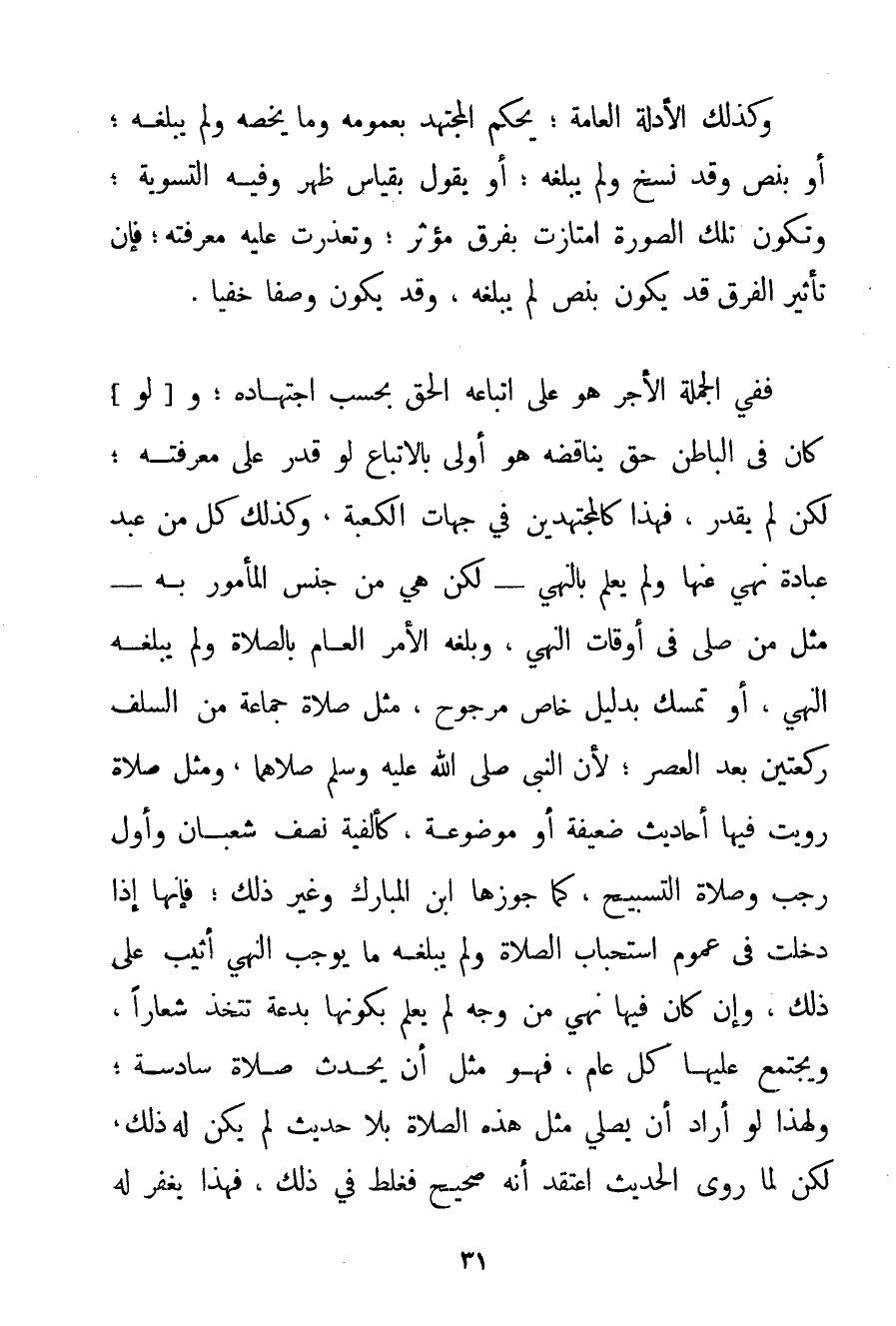 وَكَذَلِكَ الْأَدِلَّةُ الْعَامَّةُ؛ يَحْكُمُ الْمُجْتَهِدُ بِعُمُومِهِ وَمَا يَخُصُّهُ وَلَمْ يَبْلُغْهُ؛ أَوْ بِنَصِّ وَقَدْ نُسِخَ وَلَمْ يَبْلُغْهُ؛ أَوْ يَقُولُ بِقِيَاسِ ظَهَرَ وَفِيهِ التَّسْوِيَةُ؛ وَتَكُونُ تِلْكَ الصُّورَةُ امْتَازَتْ بِفَرْقِ مُؤَثِّرٍ؛ وَتَعَذَّرَتْ عَلَيْهِ مَعْرِفَتُهُ؛ فَإِنَّ تَأْثِيرَ الْفَرْقِ قَدْ يَكُونُ بِنَصِّ لَمْ يَبْلُغْهُ وَقَدْ يَكُونُ وَصْفًا خَفِيًّا. فَفِي الْجُمْلَةِ الْأَجْرُ هُوَ عَلَى اتِّبَاعِهِ الْحَقَّ بِحَسَبِ اجْتِهَادِهِ؛ وَلَوْ كَانَ فِي الْبَاطِنِ حَقٌّ يُنَاقِضُهُ هُوَ أَوْلَى بِالِاتِّبَاعِ لَوْ قَدَرَ عَلَى مَعْرِفَتِهِ؛ لَكِنْ لَمْ يَقْدِرْ فَهَذَا كَالْمُجْتَهِدِينَ فِي جِهَاتِ الْكَعْبَةِ وَكَذَلِكَ كُلُّ مَنْ عَبَدَ عِبَادَةً نُهِيَ عَنْهَا وَلَمْ يَعْلَمْ بِالنَّهْيِ - لَكِنْ هِيَ مِنْ جِنْسِ الْمَأْمُورِ بِهِ - مِثْلَ مَنْ صَلَّى فِي أَوْقَاتِ النَّهْيِ وَبَلَغَهُ الْأَمْرُ الْعَامُّ بِالصَّلَاةِ وَلَمْ يَبْلُغْهُ النَّهْيُ أَوْ تَمَسَّكَ بِدَلِيلِ خَاصٍّ مَرْجُوحٍ مِثْلَ صَلَاةِ جَمَاعَةٍ مِنْ السَّلَفِ رَكْعَتَيْنِ بَعْدَ الْعَصْرِ؛ لِأَنَّ النَّبِيَّ صَلَّى اللَّهُ عَلَيْهِ وَسَلَّمَ صَلَّاهُمَا وَمِثْلَ صَلَاةٍ رُوِيَتْ فِيهَا أَحَادِيثُ ضَعِيفَةٌ أَوْ مَوْضُوعَةٌ كَأَلْفِيَّةِ نِصْفِ شَعْبَانَ وَأَوَّلِ رَجَبَ وَصَلَاةِ التَّسْبِيحِ كَمَا جَوَّزَهَا ابْنُ الْمُبَارَكِ وَغَيْرِ ذَلِكَ؛ فَإِنَّهَا إذَا دَخَلَتْ فِي عُمُومِ اسْتِحْبَابِ الصَّلَاةِ وَلَمْ يَبْلُغْهُ مَا يُوجِبُ النَّهْيَ أُثِيبَ عَلَى ذَلِكَ وَإِنْ كَانَ فِيهَا نَهْيٌ مِنْ وَجْهٍ لَمْ يَعْلَمْ بِكَوْنِهَا بِدْعَةً تُتَّخَذُ شِعَارًا وَيَجْتَمِعُ عَلَيْهَا كُلَّ عَامٍ فَهُوَ مِثْلَ أَنْ يُحْدِثَ صَلَاةً سَادِسَةً؛ وَلِهَذَا لَوْ أَرَادَ أَنْ يُصَلِّيَ مِثْلَ هَذِهِ الصَّلَاةِ بِلَا حَدِيثٍ لَمْ يَكُنْ لَهُ ذَلِكَ لَكِنْ لَمَّا رُوِيَ الْحَدِيثُ اعْتَقَدَ أَنَّهُ صَحِيحٌ فَغَلِطَ فِي ذَلِكَ فَهَذَا يُغْفَرُ لَهُ