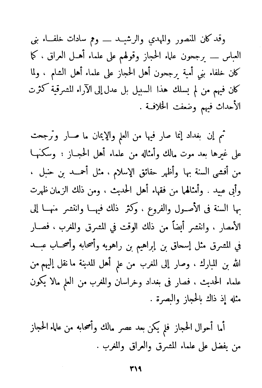 وَقَدْ كَانَ الْمَنْصُورُ وَالْمَهْدِيُّ وَالرَّشِيدُ - وَهُمْ سَادَاتُ خُلَفَاءِ بَنِي الْعَبَّاسِ - يُرَجِّحُونَ عُلَمَاءَ الْحِجَازِ وَقَوْلَهُمْ عَلَى عُلَمَاءِ أَهْلِ الْعِرَاقِ كَمَا كَانَ خُلَفَاءُ بَنِي أُمَيَّةَ يُرَجِّحُونَ أَهْلَ الْحِجَازِ عَلَى عُلَمَاءِ أَهْلِ الشَّامِ وَلَمَّا كَانَ فِيهِمْ مَنْ لَمْ يَسْلُكْ هَذَا السَّبِيلَ بَلْ عَدَلَ إلَى الْآرَاءِ الْمَشْرِقِيَّةِ كَثُرَتْ الْأَحْدَاثُ فِيهِمْ وَضَعُفَتْ الْخِلَافَةُ. ثُمَّ إنَّ بَغْدَادَ إنَّمَا صَارَ فِيهَا مِنْ الْعِلْمِ وَالْإِيمَانِ مَا صَارَ وَتَرَجَّحَتْ عَلَى غَيْرِهَا بَعْدَ مَوْتِ مَالِكٍ وَأَمْثَالِهِ مِنْ عُلَمَاءِ أَهْلِ الْحِجَازِ؛ وَسَكَنَهَا مَنْ أَفْشَى السُّنَّةَ بِهَا وَأَظْهَرَ حَقَائِقَ الْإِسْلَامِ مِثْلُ أَحْمَد بْنِ حَنْبَلٍ وَأَبِي عُبَيْدٍ وَأَمْثَالِهِمَا مِنْ فُقَهَاءِ أَهْلِ الْحَدِيثِ وَمِنْ ذَلِكَ الزَّمَانِ ظَهَرَتْ بِهَا السُّنَّةُ فِي الْأُصُولِ وَالْفُرُوعِ وَكَثُرَ ذَلِكَ فِيهَا وَانْتَشَرَ مِنْهَا إلَى الْأَمْصَارِ وَانْتَشَرَ أَيْضًا مِنْ ذَلِكَ الْوَقْتِ فِي الْمَشْرِقِ وَالْمَغْرِبِ فَصَارَ فِي الْمَشْرِقِ مِثْلُ إسْحَاقَ بْنِ إبْرَاهِيمَ بْنِ رَاهَوَيْه وَأَصْحَابِهِ وَأَصْحَابِ عَبْدِ اللَّهِ بْنِ الْمُبَارَكِ وَصَارَ إلَى الْمَغْرِبِ مِنْ عِلْمِ أَهْلِ الْمَدِينَةِ مَا نُقِلَ إلَيْهِمْ مِنْ عُلَمَاءِ الْحَدِيثِ فَصَارَ فِي بَغْدَادَ وَخُرَاسَانَ وَالْمَغْرِبِ مِنْ الْعِلْمِ مَا لَا يَكُونُ مِثْلُهُ إذْ ذَاكَ بِالْحِجَازِ وَالْبَصْرَةِ. أَمَّا أَحْوَالُ الْحِجَازِ فَلَمْ يَكُنْ بَعْدَ عَصْرِ مَالِكٍ وَأَصْحَابِهِ مِنْ عُلَمَاءِ الْحِجَازِ مَنْ يُفَضَّلُ عَلَى عُلَمَاءِ الْمَشْرِقِ وَالْعِرَاقِ وَالْمَغْرِبِ.