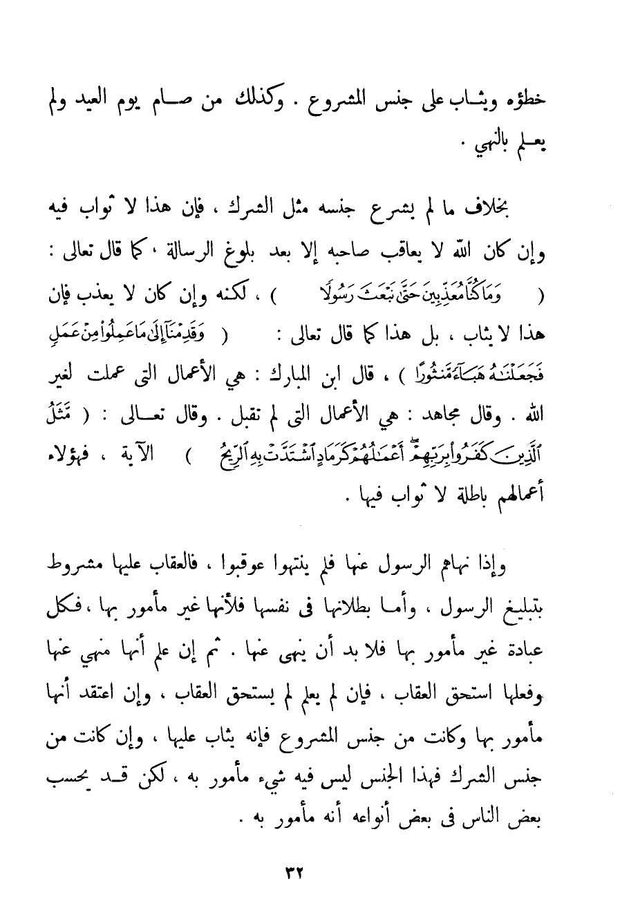 خَطَؤُهُ وَيُثَابُ عَلَى جِنْسِ الْمَشْرُوعِ. وَكَذَلِكَ مَنْ صَامَ يَوْمَ الْعِيدِ وَلَمْ يَعْلَمْ بِالنَّهْيِ. بِخِلَافِ مَا لَمْ يُشْرَعْ جِنْسُهُ مِثْلَ الشِّرْكِ فَإِنَّ هَذَا لَا ثَوَابَ فِيهِ وَإِنْ كَانَ اللَّهُ لَا يُعَاقِبُ صَاحِبَهُ إلَّا بَعْدَ بُلُوغِ الرِّسَالَةِ كَمَا قَالَ تَعَالَى: {وَمَا كُنَّا مُعَذِّبِينَ حَتَّى نَبْعَثَ رَسُولًا} لَكِنَّهُ وَإِنْ كَانَ لَا يُعَذِّبُ فَإِنَّ هَذَا لَا يُثَابُ بَلْ هَذَا كَمَا قَالَ تَعَالَى: {وَقَدِمْنَا إلَى مَا عَمِلُوا مِنْ عَمَلٍ فَجَعَلْنَاهُ هَبَاءً مَنْثُورًا} قَالَ ابْنُ الْمُبَارَكِ: هِيَ الْأَعْمَالُ الَّتِي عُمِلَتْ لِغَيْرِ اللَّهِ. وَقَالَ مُجَاهِدٌ: هِيَ الْأَعْمَالُ الَّتِي لَمْ تُقْبَلْ. وَقَالَ تَعَالَى: {مَثَلُ الَّذِينَ كَفَرُوا بِرَبِّهِمْ أَعْمَالُهُمْ كَرَمَادٍ اشْتَدَّتْ بِهِ الرِّيحُ} الْآيَةَ فَهَؤُلَاءِ أَعْمَالُهُمْ بَاطِلَةٌ لَا ثَوَابَ فِيهَا. وَإِذَا نَهَاهُمْ الرَّسُولُ عَنْهَا فَلَمْ يَنْتَهُوا عُوقِبُوا فَالْعِقَابُ عَلَيْهَا مَشْرُوطٌ بِتَبْلِيغِ الرَّسُولِ وَأَمَّا بُطْلَانُهَا فِي نَفْسِهَا فَلِأَنَّهَا غَيْرُ مَأْمُورٍ بِهَا فَكُلُّ عِبَادَةٍ غَيْرُ مَأْمُورٍ بِهَا فَلَا بُدَّ أَنْ يُنْهَى عَنْهَا. ثُمَّ إنْ عَلِمَ أَنَّهَا مَنْهِيٌّ عَنْهَا وَفَعَلَهَا اسْتَحَقَّ الْعِقَابَ فَإِنْ لَمْ يَعْلَمْ لَمْ يَسْتَحِقَّ الْعِقَابَ وَإِنْ اعْتَقَدَ أَنَّهَا مَأْمُورٌ بِهَا وَكَانَتْ مِنْ جِنْسِ الْمَشْرُوعِ فَإِنَّهُ يُثَابُ عَلَيْهَا وَإِنْ كَانَتْ مِنْ جِنْسِ الشِّرْكِ فَهَذَا الْجِنْسُ لَيْسَ فِيهِ شَيْءٌ مَأْمُورٌ بِهِ لَكِنْ قَدْ يَحْسَبُ بَعْضُ النَّاسِ فِي بَعْضِ أَنْوَاعِهِ أَنَّهُ مَأْمُورٌ بِهِ. وَهَذَا لَا يَكُونُ مُجْتَهِدًا؛ لِأَنَّ الْمُجْتَهِدَ لَا بُدَّ أَنْ يَتَّبِعَ دَلِيلًا شَرْعِيًّا وَهَذِهِ لَا يَكُونُ عَلَيْهَا دَلِيلٌ شَرْعِيٌّ لَكِنْ قَدْ يَفْعَلُهَا بِاجْتِهَادِ مِثْلِهِ: وَهُوَ تَقْلِيدُهُ لِمَنْ فَعَلَ ذَلِكَ مِنْ الشُّيُوخِ وَالْعُلَمَاءِ وَاَلَّذِينَ فَعَلُوا ذَلِكَ قَدْ فَعَلُوهُ لِأَنَّهُمْ رَأَوْهُ يَنْفَعُ؛ أَوْ لِحَدِيثِ كَذِبٍ سَمِعُوهُ. فَهَؤُلَاءِ إذَا لَمْ تَقُمْ عَلَيْهِمْ الْحُجَّةُ بِالنَّهْيِ لَا يُعَذَّبُونَ وَأَمَّا الثَّوَابُ فَإِنَّهُ قَدْ يَكُونُ ثَوَابُهُمْ أَنَّهُمْ أَرْجَحُ مِنْ أَهْلِ جِنْسِهِمْ وَأَمَّا الثَّوَابُ بِالتَّقَرُّبِ إلَى اللَّهِ فَلَا يَكُونُ بِمِثْلِ هَذِهِ الْأَعْمَالِ.