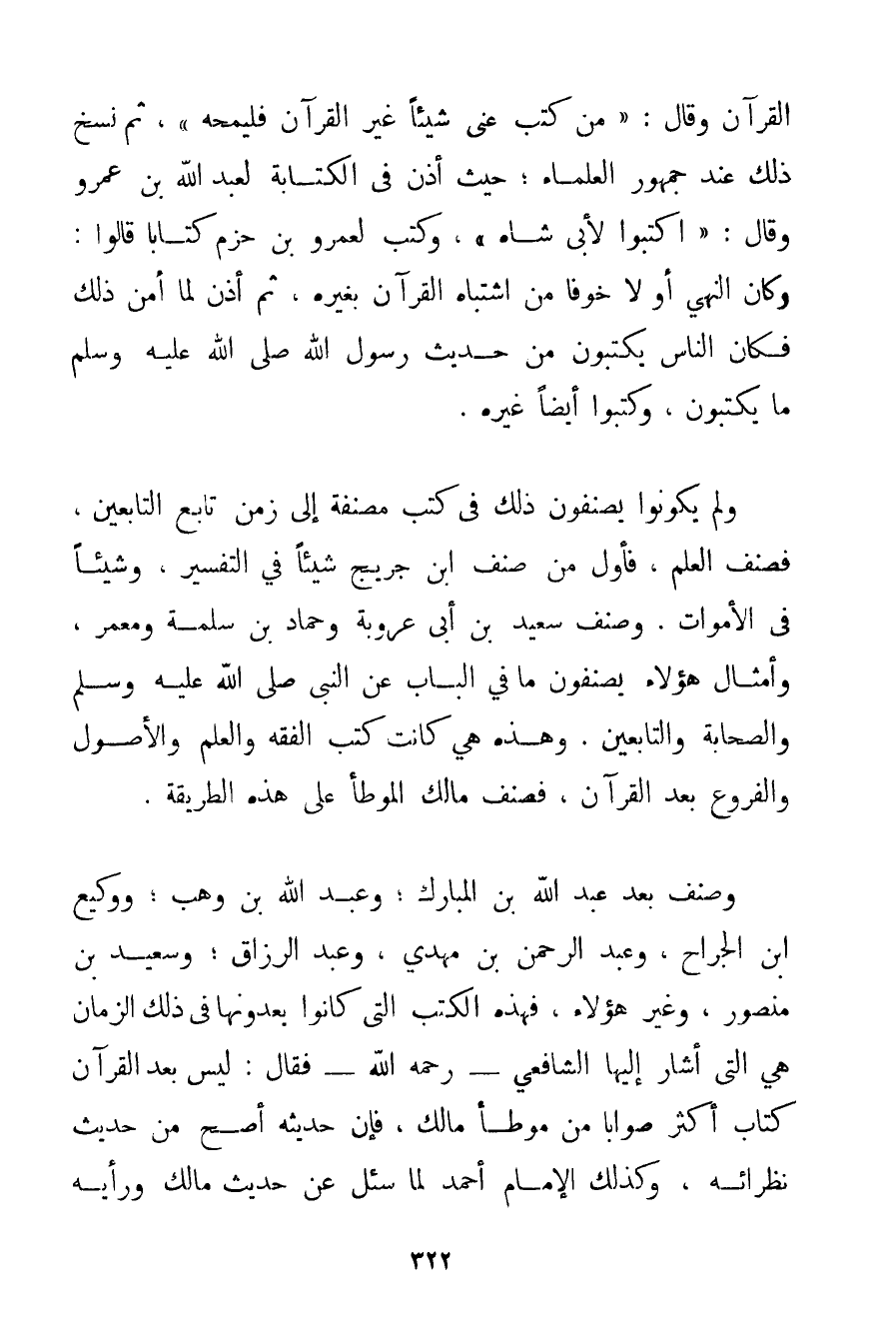 الْقُرْآنِ وَقَالَ: {مَنْ كَتَبَ عَنِّي شَيْئًا غَيْرَ الْقُرْآنِ فَلْيَمْحُهُ} ثُمَّ نُسِخَ ذَلِكَ عِنْدَ جُمْهُورِ الْعُلَمَاءِ؛ حَيْثُ {أَذِنَ فِي الْكِتَابَةِ لِعَبْدِ اللَّهِ بْنِ عَمْرٍو وَقَالَ: اُكْتُبُوا لِأَبِي شَاهٍ} وَكَتَبَ لِعَمْرِو بْنِ حَزْمٍ كِتَابًا قَالُوا: وَكَانَ النَّهْيُ أَوَّلًا خَوْفًا مِنْ اشْتِبَاهِ الْقُرْآنِ بِغَيْرِهِ ثُمَّ أَذِنَ لَمَّا أُمِنَ ذَلِكَ فَكَانَ النَّاسُ يَكْتُبُونَ مِنْ حَدِيثِ رَسُولِ اللَّهِ صَلَّى اللَّهُ عَلَيْهِ وَسَلَّمَ مَا يَكْتُبُونَ وَكَتَبُوا أَيْضًا غَيْرَهُ. وَلَمْ يَكُونُوا يُصَنِّفُونَ ذَلِكَ فِي كُتُبٍ مُصَنَّفَةٍ إلَى زَمَنِ تَابِعِ التَّابِعِينَ فَصُنِّفَ الْعِلْمُ فَأَوَّلُ مَنْ صَنَّفَ ابْنُ جريج شَيْئًا فِي التَّفْسِيرِ وَشَيْئًا فِي الْأَمْوَاتِ. وَصَنَّفَ سَعِيدُ بْنُ أَبِي عَرُوبَةَ وَحَمَّادُ بْنُ سَلَمَةَ وَمَعْمَرٌ وَأَمْثَالُ هَؤُلَاءِ يُصَنِّفُونَ مَا فِي الْبَابِ عَنْ النَّبِيِّ صَلَّى اللَّهُ عَلَيْهِ وَسَلَّمَ وَالصَّحَابَةِ وَالتَّابِعِينَ. وَهَذِهِ هِيَ كَانَتْ كُتُبَ الْفِقْهِ وَالْعِلْمِ وَالْأُصُولِ وَالْفُرُوعِ بَعْدَ الْقُرْآنِ فَصَنَّفَ مَالِكٌ الْمُوَطَّأَ عَلَى هَذِهِ الطَّرِيقَةِ. وَصَنَّفَ بَعْدُ عَبْدُ اللَّهِ بْنُ الْمُبَارَكِ؛ وَعَبْدُ اللَّهِ بْنُ وَهْبٍ؛ وَوَكِيعُ بْنُ الْجَرَّاحِ وَعَبْدُ الرَّحْمَنِ بْنُ مَهْدِيٍّ وَعَبْدُ الرَّزَّاقِ وَسَعِيدُ بْنُ مَنْصُورٍ وَغَيْرُ هَؤُلَاءِ فَهَذِهِ الْكُتُبُ الَّتِي كَانُوا يَعُدُّونَهَا فِي ذَلِكَ الزَّمَانِ هِيَ الَّتِي أَشَارَ إلَيْهَا الشَّافِعِيُّ - رَحِمَهُ اللَّهُ - فَقَالَ: لَيْسَ بَعْدَ الْقُرْآنِ كِتَابٌ أَكْثَرُ صَوَابًا مِنْ مُوَطَّأِ مَالِكٍ فَإِنَّ حَدِيثَهُ أَصَحُّ مِنْ حَدِيثِ نُظَرَائِهِ وَكَذَلِكَ الْإِمَامُ أَحْمَد لَمَّا سُئِلَ عَنْ حَدِيثِ مَالِكٍ وَرَأْيِهِ