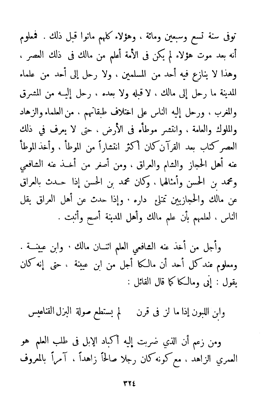 وَأَجَلُّ مَنْ أَخَذَ عَنْهُ الشَّافِعِيُّ الْعِلْمَ اثْنَانِ مَالِكٌ وَابْنُ عُيَيْنَة. وَمَعْلُومٌ عِنْدَ كُلِّ أَحَدٍ أَنَّ مَالِكًا أَجَلُّ مِنْ ابْنِ عُيَيْنَة حَتَّى إنَّهُ كَانَ يَقُولُ: