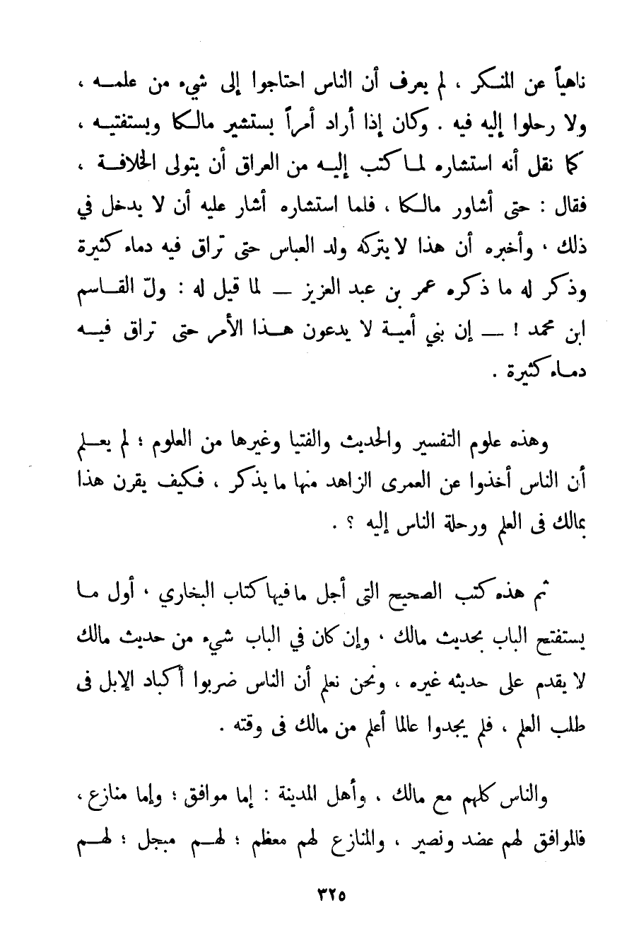 نَاهِيًا عَنْ الْمُنْكَرِ لَمْ يُعْرَفْ أَنَّ النَّاسَ احْتَاجُوا إلَى شَيْءٍ مِنْ عِلْمِهِ وَلَا رَحَلُوا إلَيْهِ فِيهِ. وَكَانَ إذَا أَرَادَ أَمْرًا يَسْتَشِيرُ مَالِكًا وَيَسْتَفْتِيهِ كَمَا نُقِلَ أَنَّهُ اسْتَشَارَهُ لَمَّا كَتَبَ إلَيْهِ مِنْ الْعِرَاقِ أَنْ يَتَوَلَّى الْخِلَافَةَ فَقَالَ: حَتَّى أُشَاوِرَ مَالِكًا فَلَمَّا اسْتَشَارَهُ أَشَارَ عَلَيْهِ أَنْ لَا يَدْخُلَ فِي ذَلِكَ وَأَخْبَرَهُ أَنَّ هَذَا لَا يَتْرُكُهُ وَلَدُ الْعَبَّاسِ حَتَّى تُرَاقَ فِيهِ دِمَاءٌ كَثِيرَةٌ وَذَكَرَ لَهُ مَا ذَكَرَهُ عُمَرُ بْنُ عَبْدِ الْعَزِيزِ - لَمَّا قِيلَ لَهُ: وَلِّ الْقَاسِمَ بْنَ مُحَمَّدٍ - أَنَّ بَنِي أُمَيَّةَ لَا يَدَعُونَ هَذَا الْأَمْرَ حَتَّى تُرَاقَ فِيهِ دِمَاءٌ كَثِيرَةٌ. وَهَذِهِ عُلُومُ التَّفْسِيرِ وَالْحَدِيثِ وَالْفُتْيَا وَغَيْرِهَا مِنْ الْعُلُومِ؛ لَمْ يُعْلَمْ أَنَّ النَّاسَ أَخَذُوا عَنْ الْعُمَرِيِّ الزَّاهِدِ مِنْهَا مَا يُذْكَرُ فَكَيْفَ يُقْرَنُ هَذَا بِمَالِكِ فِي الْعِلْمِ وَرِحْلَةِ النَّاسِ إلَيْهِ؟ . ثُمَّ هَذِهِ كُتُبُ الصَّحِيحِ الَّتِي أَجَلُّ مَا فِيهَا كِتَابُ الْبُخَارِيِّ أَوَّلُ مَا يَسْتَفْتِحُ الْبَابَ بِحَدِيثِ مَالِكٍ وَإِنْ كَانَ فِي الْبَابِ شَيْءٌ مِنْ حَدِيثِ مَالِكٍ لَا يُقَدِّمُ عَلَى حَدِيثِهِ غَيْرَهُ وَنَحْنُ نَعْلَمُ أَنَّ النَّاسَ ضَرَبُوا أَكْبَادَ الْإِبِلِ فِي طَلَبِ الْعِلْمِ فَلَمْ يَجِدُوا عَالِمًا أَعْلَمَ مِنْ مَالِكٍ فِي وَقْتِهِ. وَالنَّاسُ كُلُّهُمْ مَعَ مَالِكٍ وَأَهْلِ الْمَدِينَةِ: إمَّا مُوَافِقٌ؛ وَإِمَّا مُنَازِعٌ فَالْمُوَافِقُ لَهُمْ عَضُدٌ وَنَصِيرٌ وَالْمُنَازِعُ لَهُمْ مُعَظِّمٌ لَهُمْ مُبَجِّلٌ لَهُمْ