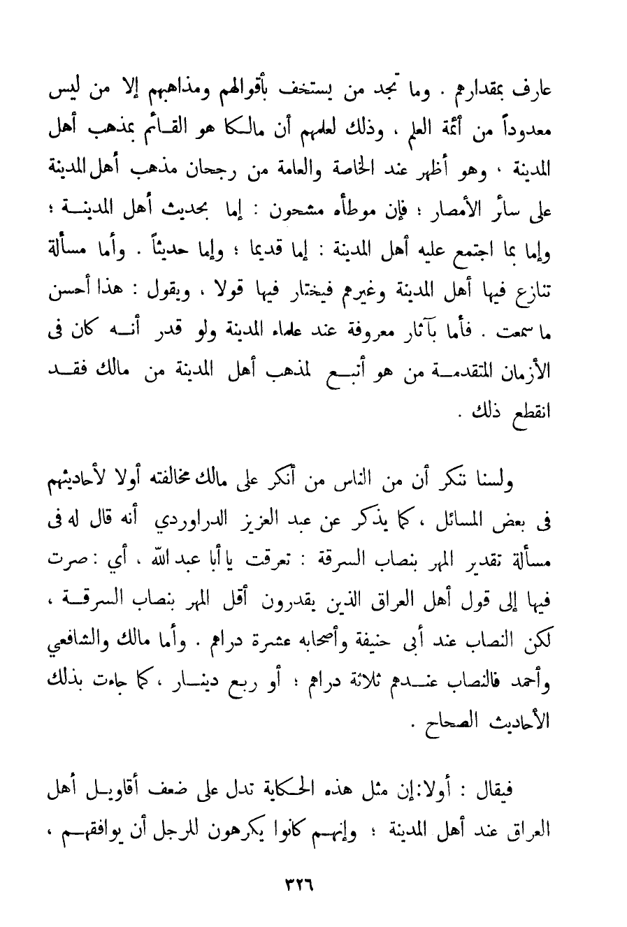 عَارِفٌ بِمِقْدَارِهِمْ. وَمَا تَجِدُ مَنْ يَسْتَخِفُّ بِأَقْوَالِهِمْ وَمَذَاهِبِهِمْ إلَّا مَنْ لَيْسَ مَعْدُودًا مِنْ أَئِمَّةِ الْعِلْمِ وَذَلِكَ لِعِلْمِهِمْ أَنَّ مَالِكًا هُوَ الْقَائِمُ بِمَذْهَبِ أَهْلِ الْمَدِينَةِ وَهُوَ أَظْهَرُ عِنْدَ الْخَاصَّةِ وَالْعَامَّةِ مِنْ رُجْحَانِ مَذْهَبِ أَهْلِ الْمَدِينَةِ عَلَى سَائِرِ الْأَمْصَارِ؛ فَإِنَّ مُوَطَّأَهُ مَشْحُونٌ: إمَّا بِحَدِيثِ أَهْلِ الْمَدِينَةِ؛ وَإِمَّا بِمَا اجْتَمَعَ عَلَيْهِ أَهْلُ الْمَدِينَةِ: إمَّا قَدِيمًا؛ وَإِمَّا حَدِيثًا. وَإِمَّا مَسْأَلَةٌ تَنَازَعَ فِيهَا أَهْلُ الْمَدِينَةِ وَغَيْرُهُمْ فَيَخْتَارُ فِيهَا قَوْلًا وَيَقُولُ: هَذَا أَحْسَنُ مَا سَمِعْت. فَأَمَّا بِآثَارِ مَعْرُوفَةٍ عِنْدَ عُلَمَاءِ الْمَدِينَةِ وَلَوْ قُدِّرَ أَنَّهُ كَانَ فِي الْأَزْمَانِ الْمُتَقَدِّمَةِ مَنْ هُوَ أَتْبَعُ لِمَذْهَبِ أَهْلِ الْمَدِينَةِ مِنْ مَالِكٍ فَقَدْ انْقَطَعَ ذَلِكَ. وَلَسْنَا نُنْكِرُ أَنَّ مِنْ النَّاسِ مَنْ أَنْكَرَ عَلَى مَالِكٍ مُخَالَفَتَهُ أَوَّلًا لِأَحَادِيثِهِمْ فِي بَعْضِ الْمَسَائِلِ كَمَا يُذْكَرُ عَنْ عَبْدِ الْعَزِيزِ الدراوردي أَنَّهُ قَالَ لَهُ فِي مَسْأَلَةِ تَقْدِيرِ الْمَهْرِ بِنِصَابِ السَّرِقَةِ: تعرقت يَا أَبَا عَبْدِ اللَّهِ أَيْ: صِرْت فِيهَا إلَى قَوْلِ أَهْلِ الْعِرَاقِ الَّذِينَ يُقَدِّرُونَ أَقَلَّ الْمَهْرِ بِنِصَابِ السَّرِقَةِ لَكِنَّ النِّصَابَ عِنْدَ أَبِي حَنِيفَةَ وَأَصْحَابِهِ عَشَرَةُ دَرَاهِمَ. وَأَمَّا مَالِكٌ وَالشَّافِعِيُّ وَأَحْمَد فَالنِّصَابُ عِنْدَهُمْ ثَلَاثَةُ دَرَاهِمَ؛ أَوْ رُبُعُ دِينَارٍ كَمَا جَاءَتْ بِذَلِكَ الْأَحَادِيثُ الصِّحَاحُ. فَيُقَالُ: أَوَّلًا: إنَّ مِثْلَ هَذِهِ الْحِكَايَةِ تَدُلُّ عَلَى ضَعْفِ أَقَاوِيلِ أَهْلِ الْعِرَاقِ عِنْدَ أَهْلِ الْمَدِينَةِ؛ وَإِنَّهُمْ كَانُوا يَكْرَهُونَ لِلرَّجُلِ أَنْ يُوَافِقَهُمْ