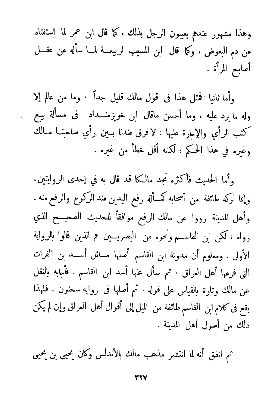 وَهَذَا مَشْهُورٌ عِنْدَهُمْ يَعِيبُونَ الرَّجُلَ بِذَلِكَ كَمَا قَالَ ابْنُ عُمَرَ لَمَّا اسْتَفْتَاهُ عَنْ دَمِ الْبَعُوضِ وَكَمَا قَالَ ابْنُ الْمُسَيِّبِ لِرَبِيعَةَ لَمَّا سَأَلَهُ عَنْ عَقْلِ أَصَابِعِ الْمَرْأَةِ. وَأَمَّا ثَانِيًا: فَمِثْلُ هَذَا فِي قَوْلِ مَالِكٍ قَلِيلٌ جِدًّا وَمَا مِنْ عَالِمٍ إلَّا وَلَهُ مَا يُرَدُّ عَلَيْهِ وَمَا أَحْسَنَ مَا قَالَ ابْنُ خويز منداد فِي مَسْأَلَةِ بَيْعِ كُتُبِ الرَّأْيِ وَالْإِجَارَةِ عَلَيْهَا: لَا فَرْقَ عِنْدَنَا بَيْنَ رَأْيِ صَاحِبِنَا مَالِكٍ وَغَيْرِهِ فِي هَذَا الْحُكْمِ؛ لَكِنَّهُ أَقَلُّ خَطَأً مِنْ غَيْرِهِ. وَأَمَّا الْحَدِيثُ فَأَكْثَرُهُ نَجِدُ مَالِكًا قَدْ قَالَ بِهِ فِي إحْدَى الرِّوَايَتَيْنِ وَإِنَّمَا تَرَكَهُ طَائِفَةٌ مِنْ أَصْحَابِهِ كَمَسْأَلَةِ رَفْعِ الْيَدَيْنِ عِنْدَ الرُّكُوعِ وَالرَّفْعِ مِنْهُ. وَأَهْلُ الْمَدِينَةِ رَوَوْا عَنْ مَالِكٍ الرَّفْعَ مُوَافِقًا لِلْحَدِيثِ الصَّحِيحِ الَّذِي رَوَاهُ؛ لَكِنَّ ابْنَ الْقَاسِمِ وَنَحْوَهُ مِنْ الْبَصْرِيِّينَ هَمّ الَّذِينَ قَالُوا بِالرِّوَايَةِ الْأُولَى وَمَعْلُومٌ أَنَّ مُدَوَّنَةَ ابْنِ الْقَاسِمِ أَصْلُهَا مَسَائِلُ أَسَدِ بْنِ الْفُرَاتِ الَّتِي فَرَّعَهَا أَهْلُ الْعِرَاقِ ثُمَّ سَأَلَ عَنْهَا أَسَدٌ ابْنَ الْقَاسِمِ. فَأَجَابَهُ بِالنَّقْلِ عَنْ مَالِكٍ وَتَارَةً بِالْقِيَاسِ عَلَى قَوْلِهِ ثُمَّ أَصْلُهَا فِي رِوَايَةِ سحنون فَلِهَذَا يَقَعُ فِي كَلَامِ ابْنِ الْقَاسِمِ طَائِفَةٌ مِنْ الْمَيْلِ إلَى أَقْوَالِ أَهْلِ الْعِرَاقِ وَإِنْ لَمْ يَكُنْ ذَلِكَ مِنْ أُصُولِ أَهْلِ الْمَدِينَةِ. ثُمَّ اتَّفَقَ أَنَّهُ لَمَّا انْتَشَرَ مَذْهَبُ مَالِكٍ بِالْأَنْدَلُسِ وَكَانَ يَحْيَى بْنُ يَحْيَى