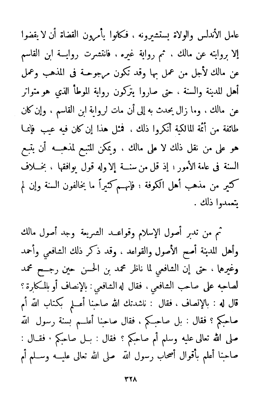 ثُمَّ مَنْ تَدَبَّرَ أُصُولَ الْإِسْلَامِ وَقَوَاعِدَ الشَّرِيعَةِ وَجَدَ أُصُولَ مَالِكٍ وَأَهْلِ الْمَدِينَةِ أَصَحَّ الْأُصُولِ وَالْقَوَاعِدِ وَقَدْ ذَكَرَ ذَلِكَ الشَّافِعِيُّ وَأَحْمَد وَغَيْرُهُمَا حَتَّى إنَّ الشَّافِعِيَّ لَمَّا نَاظَرَ مُحَمَّدَ بْنَ الْحَسَنِ حِينَ رَجَّحَ مُحَمَّدٌ لِصَاحِبِهِ عَلَى صَاحِبِ الشَّافِعِيِّ فَقَالَ لَهُ الشَّافِعِيُّ: بِالْإِنْصَافِ أَوْ بِالْمُكَابَرَةِ؟ قَالَ لَهُ: بِالْإِنْصَافِ فَقَالَ: نَاشَدْتُك اللَّهَ صَاحِبُنَا أَعْلَمُ بِكِتَابِ اللَّهِ أَمْ صَاحِبُكُمْ؟ فَقَالَ: بَلْ صَاحِبُكُمْ فَقَالَ صَاحِبُنَا أَعْلَمُ بِسُنَّةِ رَسُولِ اللَّهِ صَلَّى اللَّهُ تَعَالَى عَلَيْهِ وَسَلَّمَ أَمْ صَاحِبُكُمْ؟ فَقَالَ: بَلْ صَاحِبُكُمْ فَقَالَ: صَاحِبُنَا أَعْلَمُ بِأَقْوَالِ أَصْحَابِ رَسُولِ اللَّهِ صَلَّى اللَّهُ تَعَالَى عَلَيْهِ وَسَلَّمَ أَمْ
