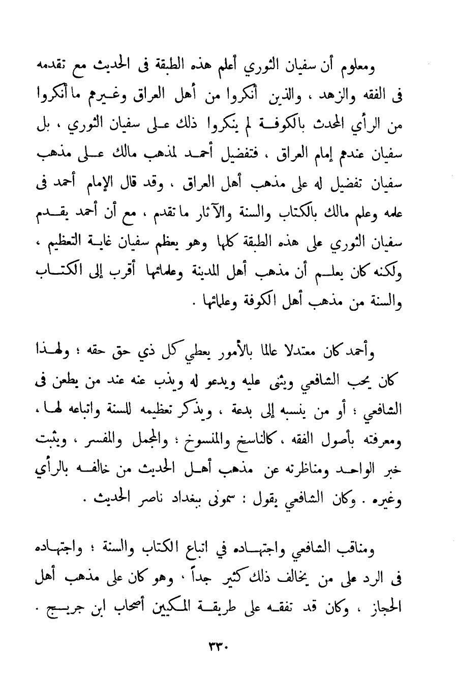 وَمَعْلُومٌ أَنَّ سُفْيَانَ الثَّوْرِيَّ أَعْلَمُ هَذِهِ الطَّبَقَةِ فِي الْحَدِيثِ مَعَ تَقَدُّمِهِ فِي الْفِقْهِ وَالزُّهْدِ وَاَلَّذِينَ أَنْكَرُوا مِنْ أَهْلِ الْعِرَاقِ وَغَيْرِهِمْ مَا أَنْكَرُوا مِنْ الرَّأْيِ الْمُحْدَثِ بِالْكُوفَةِ لَمْ يُنْكِرُوا ذَلِكَ عَلَى سُفْيَانَ الثَّوْرِيِّ بَلْ سُفْيَانُ عِنْدَهُمْ أَمَامُ الْعِرَاقِ فَتَفْضِيلُ أَحْمَد لِمَذْهَبِ مَالِكٍ عَلَى مَذْهَبِ سُفْيَانَ تَفْضِيلٌ لَهُ عَلَى مَذْهَبِ أَهْلِ الْعِرَاقِ وَقَدْ قَالَ الْإِمَامُ أَحْمَد فِي عِلْمِهِ وَعِلْمِ مَالِكٍ بِالْكِتَابِ وَالسُّنَّةِ وَالْآثَارِ مَا تَقَدَّمَ مَعَ أَنَّ أَحْمَد يُقَدِّمُ سُفْيَانَ الثَّوْرِيَّ عَلَى هَذِهِ الطَّبَقَةِ كُلِّهَا وَهُوَ يُعَظِّمُ سُفْيَانَ غَايَةَ التَّعْظِيمِ وَلَكِنَّهُ كَانَ يَعْلَمُ أَنَّ مَذْهَبَ أَهْلِ الْمَدِينَةِ وَعُلَمَائِهَا أَقْرَبُ إلَى الْكِتَابِ وَالسُّنَّةِ مِنْ مَذْهَبِ أَهْلِ الْكُوفَةِ وَعُلَمَائِهَا. وَأَحْمَد كَانَ مُعْتَدِلًا عَالِمًا بِالْأُمُورِ يُعْطِي كُلَّ ذِي حَقٍّ حَقَّهُ؛ وَلِهَذَا كَانَ يُحِبُّ الشَّافِعِيَّ وَيُثْنِي عَلَيْهِ وَيَدْعُو لَهُ وَيَذُبُّ عَنْهُ عِنْدَ مَنْ يَطْعَنُ فِي الشَّافِعِيِّ؛ أَوْ مَنْ يَنْسُبُهُ إلَى بِدْعَةٍ وَيَذْكُرُ تَعْظِيمَهُ لِلسُّنَّةِ وَاتِّبَاعَهُ لَهَا وَمَعْرِفَتَهُ بِأُصُولِ الْفِقْهِ كَالنَّاسِخِ وَالْمَنْسُوخِ؛ وَالْمُجْمَلِ وَالْمُفَسَّرِ وَيُثْبِتُ خَبَرَ الْوَاحِدِ وَمُنَاظَرَتَهُ عَنْ مَذْهَبِ أَهْلِ الْحَدِيثِ مَنْ خَالَفَهُ بِالرَّأْيِ وَغَيْرَهُ. وَكَانَ الشَّافِعِيُّ يَقُولُ: سَمَّوْنِي بِبَغْدَادَ نَاصِرَ الْحَدِيثِ. وَمَنَاقِبُ الشَّافِعِيِّ وَاجْتِهَادُهُ فِي اتِّبَاعِ الْكِتَابِ وَالسُّنَّةِ؛ وَاجْتِهَادُهُ فِي الرَّدِّ عَلَى مَنْ يُخَالِفُ ذَلِكَ كَثِيرٌ جِدًّا وَهُوَ كَانَ عَلَى مَذْهَبِ أَهْلِ الْحِجَازِ وَكَانَ قَدْ تَفَقَّهَ عَلَى طَرِيقَةِ الْمَكِّيِّينَ أَصْحَابُ ابْنُ جريج