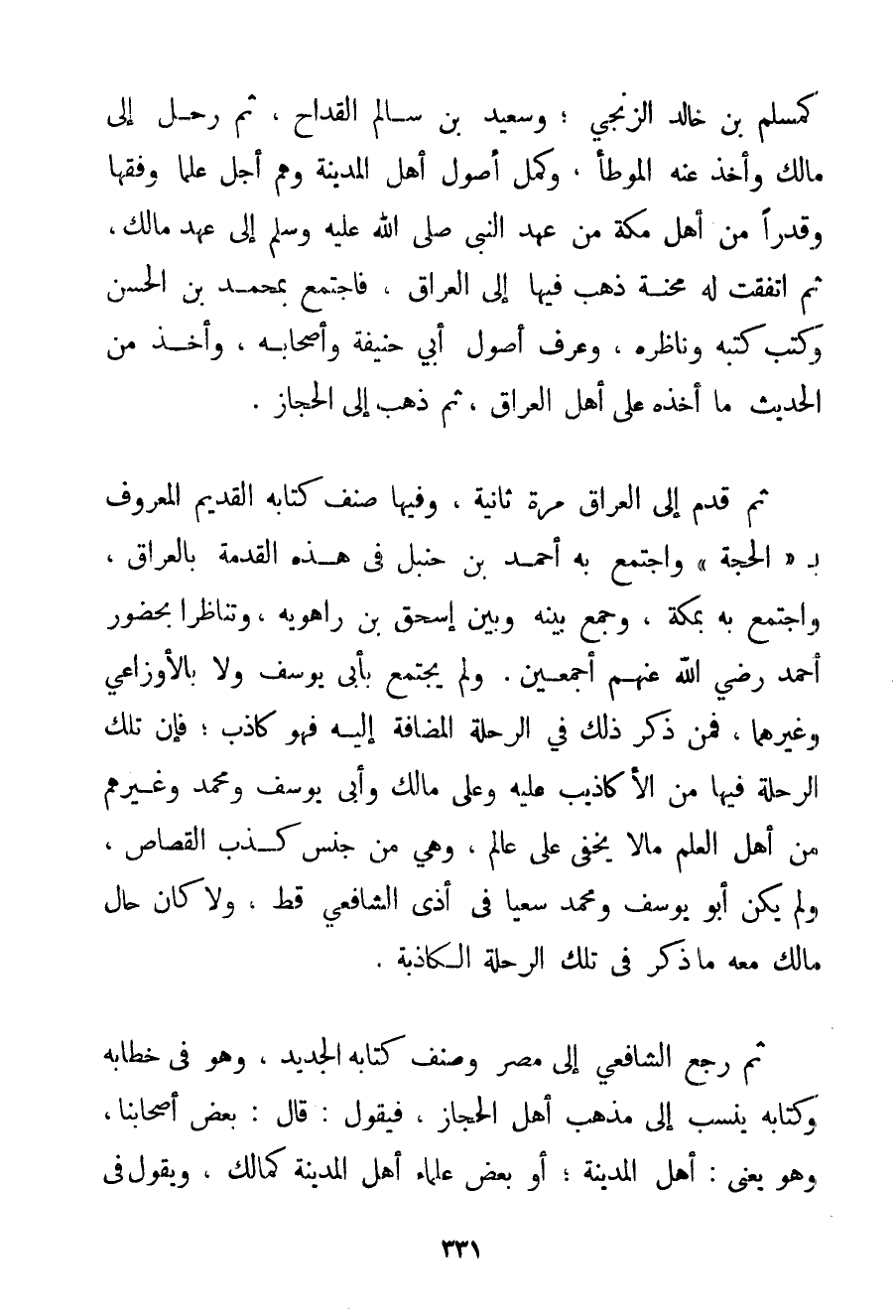 كَمُسْلِمِ بْنِ خَالِدٍ الزِّنْجِيِّ؛ وَسَعِيدِ بْنِ سَالِمٍ الْقَدَّاحِ ثُمَّ رَحَلَ إلَى مَالِكٍ وَأَخَذَ عَنْهُ الْمُوَطَّأَ وَكَمَّلَ أُصُولَ أَهْلِ الْمَدِينَةِ وَهُمْ أَجَلُّ عِلْمًا وَفِقْهًا وَقَدْرًا مِنْ أَهْلِ مَكَّةَ مِنْ عَهْدِ النَّبِيِّ صَلَّى اللَّهُ عَلَيْهِ وَسَلَّمَ إلَى عَهْدِ مَالِكٍ ثُمَّ اتَّفَقَتْ لَهُ مِحْنَةٌ ذَهَبَ فِيهَا إلَى الْعِرَاقِ فَاجْتَمَعَ بِمُحَمَّدِ بْنِ الْحَسَنِ وَكَتَبَ كُتُبَهُ وَنَاظَرَهُ وَعَرَفَ أُصُولَ أَبِي حَنِيفَةَ وَأَصْحَابِهِ وَأَخَذَ مِنْ الْحَدِيثِ مَا أَخَذَهُ عَلَى أَهْلِ الْعِرَاقِ ثُمَّ ذَهَبَ إلَى الْحِجَازِ. ثُمَّ قَدِمَ إلَى الْعِرَاقِ مَرَّةً ثَانِيَةً وَفِيهَا صَنَّفَ كِتَابَهُ الْقَدِيمَ الْمَعْرُوفَ بِ " الْحُجَّةِ " وَاجْتَمَعَ بِهِ أَحْمَد بْنُ حَنْبَلٍ فِي هَذِهِ الْقَدْمَةِ بِالْعِرَاقِ وَاجْتَمَعَ بِهِ بِمَكَّةَ وَجَمَعَ بَيْنَهُ وَبَيْنَ إسْحَاقَ بْنِ رَاهَوَيْه وَتَنَاظَرَا بِحُضُورِ أَحْمَد رَضِيَ اللَّهُ عَنْهُمْ أَجْمَعِينَ. وَلَمْ يَجْتَمِعْ بِأَبِي يُوسُفَ وَلَا بالأوزاعي وَغَيْرِهِمَا فَمَنْ ذَكَرَ ذَلِكَ فِي الرِّحْلَةِ الْمُضَافَةِ إلَيْهِ فَهُوَ كَاذِبٌ؛ فَإِنَّ تِلْكَ الرِّحْلَةَ فِيهَا مِنْ الْأَكَاذِيبِ عَلَيْهِ وَعَلَى مَالِكٍ وَأَبِي يُوسُفَ وَمُحَمَّدٍ وَغَيْرِهِمْ مِنْ أَهْلِ الْعِلْمِ مَا لَا يَخْفَى عَلَى عَالِمٍ وَهِيَ مِنْ جِنْسِ كَذِبِ الْقِصَاصِ وَلَمْ يَكُنْ أَبُو يُوسُفَ وَمُحَمَّدٌ سَعَيَا فِي أَذَى الشَّافِعِيِّ قَطُّ وَلَا كَانَ حَالُ مَالِكٍ مَعَهُ مَا ذَكَرَ فِي تِلْكَ الرِّحْلَةِ الْكَاذِبَةِ. ثُمَّ رَجَعَ الشَّافِعِيُّ إلَى مِصْرَ وَصَنَّفَ كِتَابَهُ الْجَدِيدَ وَهُوَ فِي خِطَابِهِ وَكِتَابُهُ يُنْسَبُ إلَى مَذْهَبِ أَهْلِ الْحِجَازِ فَيَقُولُ: قَالَ: بَعْضُ أَصْحَابِنَا وَهُوَ يَعْنِي: أَهْلَ الْمَدِينَةِ؛ أَوْ بَعْضَ عُلَمَاءِ أَهْلِ الْمَدِينَةِ كَمَالِكِ وَيَقُولُ فِي