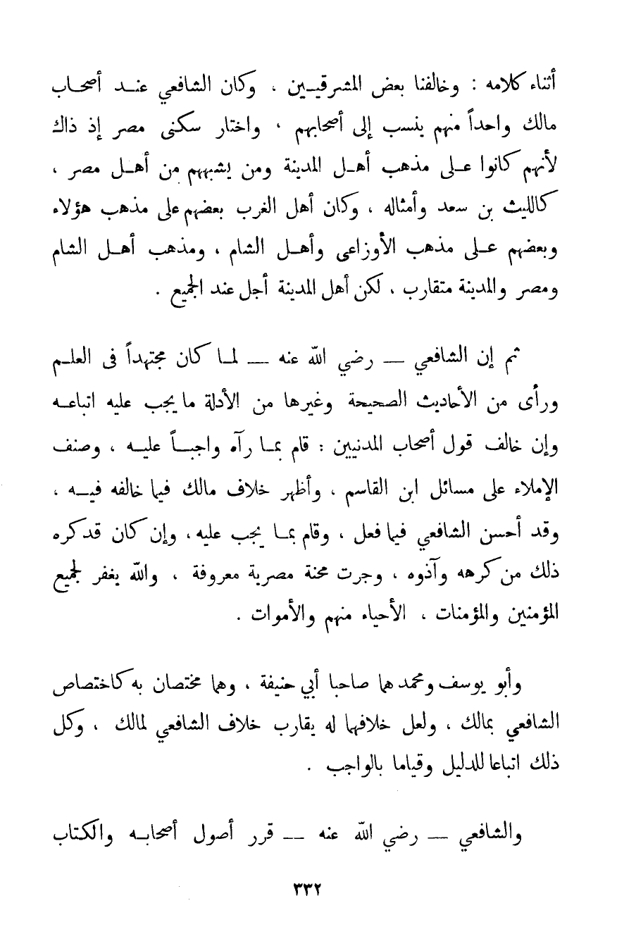 أَثْنَاءِ كَلَامِهِ: وَخَالَفْنَا بَعْضَ الْمَشْرِقِيِّينَ وَكَانَ الشَّافِعِيُّ عِنْدَ أَصْحَابِ مَالِكٍ وَاحِدًا مِنْهُمْ يُنْسَبُ إلَى أَصْحَابِهِمْ وَاخْتَارَ سُكْنَى مِصْرَ إذْ ذَاكَ لِأَنَّهُمْ كَانُوا عَلَى مَذْهَبِ أَهْلِ الْمَدِينَةِ وَمَنْ يُشْبِهُهُمْ مِنْ أَهْلِ مِصْرَ كَاللَّيْثِ بْنِ سَعْدٍ وَأَمْثَالِهِ وَكَانَ أَهْلُ الْغَرْبِ بَعْضُهُمْ عَلَى مَذْهَبِ هَؤُلَاءِ وَبَعْضُهُمْ عَلَى مَذْهَبِ الأوزاعي وَأَهْلِ الشَّامِ وَمَذْهَبُ أَهْلِ الشَّامِ وَمِصْرَ وَالْمَدِينَةِ مُتَقَارِبٌ لَكِنَّ أَهْلَ الْمَدِينَةِ أَجَلُّ عِنْدَ الْجَمِيعِ. ثُمَّ إنَّ الشَّافِعِيَّ - رَضِيَ اللَّهُ عَنْهُ - لَمَّا كَانَ مُجْتَهِدًا فِي الْعِلْمِ وَرَأَى مِنْ الْأَحَادِيثِ الصَّحِيحَةِ وَغَيْرِهَا مِنْ الْأَدِلَّةِ مَا يَجِبُ عَلَيْهِ اتِّبَاعُهُ وَإِنْ خَالَفَ قَوْلَ أَصْحَابِ الْمَدَنِيِّينَ؛ قَامَ بِمَا رَآهُ وَاجِبًا عَلَيْهِ وَصَنَّفَ الْإِمْلَاءَ عَلَى مَسَائِلِ ابْنِ الْقَاسِمِ وَأَظْهَرَ خِلَافَ مَالِكٍ فِيمَا خَالَفَهُ فِيهِ وَقَدْ أَحْسَنَ الشَّافِعِيُّ فِيمَا فَعَلَ وَقَامَ بِمَا يَجِبُ عَلَيْهِ وَإِنْ كَانَ قَدْ كَرِهَ ذَلِكَ مَنْ كَرِهَهُ وَآذَوْهُ وَجَرَتْ مِحْنَةٌ مِصْرِيَّةٌ مَعْرُوفَةٌ وَاَللَّهُ يَغْفِرُ لِجَمِيعِ الْمُؤْمِنِينَ وَالْمُؤْمِنَاتِ الْأَحْيَاءِ مِنْهُمْ وَالْأَمْوَاتِ. وَأَبُو يُوسُفَ وَمُحَمَّدٌ هُمَا صَاحِبَا أَبِي حَنِيفَةَ وَهُمَا مُخْتَصَّانِ بِهِ كَاخْتِصَاصِ الشَّافِعِيِّ بِمَالِكِ وَلَعَلَّ خِلَافَهُمَا لَهُ يُقَارِبُ خِلَافَ الشَّافِعِيِّ لِمَالِكِ وَكُلُّ ذَلِكَ اتِّبَاعًا لِلدَّلِيلِ وَقِيَامًا بِالْوَاجِبِ. وَالشَّافِعِيُّ - رَضِيَ اللَّهُ عَنْهُ - قَرَّرَ أُصُولَ أَصْحَابِهِ وَالْكِتَابَ
