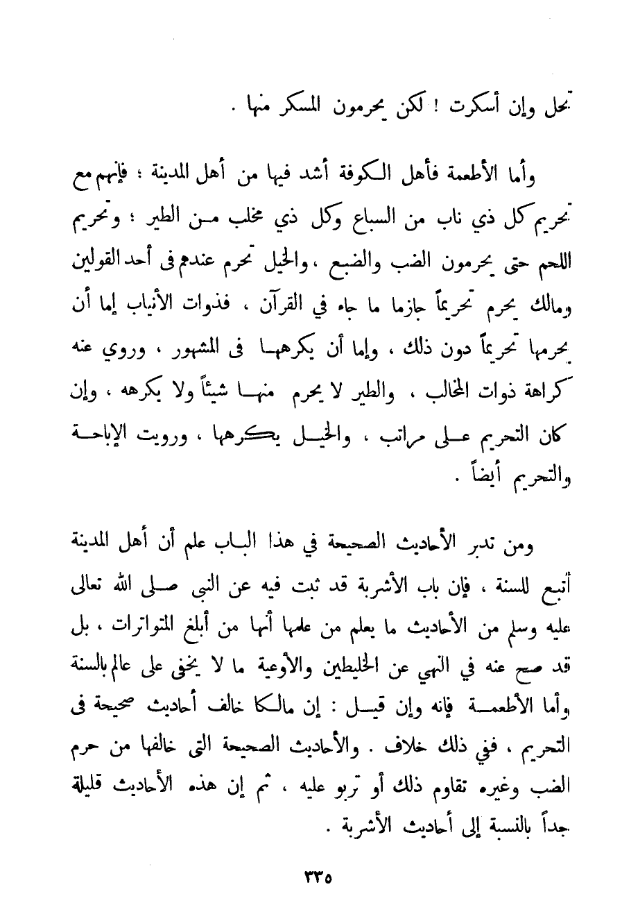 تَحُلُّ وَإِنْ أَسْكَرَتْ لَكِنْ يُحَرِّمُونَ الْمُسْكِرَ مِنْهَا. وَأَمَّا الْأَطْعِمَةُ فَأَهْلُ الْكُوفَةِ أَشَدُّ فِيهَا مِنْ أَهْلِ الْمَدِينَةِ؛ فَإِنَّهُمْ مَعَ تَحْرِيمِ كُلِّ ذِي نَابٍ مِنْ السِّبَاعِ وَكُلِّ ذِي مِخْلَبٍ مِنْ الطَّيْرِ؛ وَتَحْرِيمِ اللَّحْمِ حَتَّى يُحَرِّمُونَ الضَّبَّ وَالضَّبُعَ وَالْخَيْلَ تَحْرُمُ عِنْدَهُمْ فِي أَحَدِ الْقَوْلَيْنِ وَمَالِكٌ يُحَرِّمُ تَحْرِيمًا جَازِمًا مَا جَاءَ فِي الْقُرْآنِ فَذَوَاتُ الْأَنْيَابِ إمَّا أَنْ يُحَرِّمَهَا تَحْرِيمًا دُونَ ذَلِكَ وَإِمَّا أَنْ يَكْرَهَهَا فِي الْمَشْهُورِ وَرُوِيَ عَنْهُ كَرَاهَةُ ذَوَاتِ الْمَخَالِبِ وَالطَّيْرُ لَا يُحَرِّمُ مِنْهَا شَيْئًا وَلَا يَكْرَهُهُ وَإِنْ كَانَ التَّحْرِيمُ عَلَى مَرَاتِبَ وَالْخَيْلُ يَكْرَهُهَا وَرُوِيَتْ الْإِبَاحَةُ وَالتَّحْرِيمُ أَيْضًا. وَمَنْ تَدَبَّرَ الْأَحَادِيثَ الصَّحِيحَةَ فِي هَذَا الْبَابِ عَلِمَ أَنَّ أَهْلَ الْمَدِينَةِ أَتْبَعُ لِلسُّنَّةِ فَإِنَّ بَابَ الْأَشْرِبَةِ قَدْ ثَبَتَ فِيهِ عَنْ النَّبِيِّ صَلَّى اللَّهُ تَعَالَى عَلَيْهِ وَسَلَّمَ مِنْ الْأَحَادِيثِ مَا يَعْلَمُ مَنْ عَلِمَهَا أَنَّهَا مِنْ أَبْلَغِ الْمُتَوَاتِرَاتِ بَلْ قَدْ صَحَّ عَنْهُ فِي النَّهْيِ عَنْ الْخَلِيطَيْنِ وَالْأَوْعِيَةِ مَا لَا يَخْفَى عَلَى عَالِمٍ بِالسُّنَّةِ وَأَمَّا الْأَطْعِمَةُ فَإِنَّهُ وَإِنْ قِيلَ: إنَّ مَالِكًا خَالَفَ أَحَادِيثَ صَحِيحَةً فِي التَّحْرِيمِ فَفِي ذَلِكَ خِلَافٌ. وَالْأَحَادِيثُ الصَّحِيحَةُ الَّتِي خَالَفَهَا مَنْ حَرَّمَ الضَّبَّ وَغَيْرَهُ تُقَاوِمُ ذَلِكَ أَوْ تَرْبُو عَلَيْهِ ثُمَّ إنَّ هَذِهِ الْأَحَادِيثَ قَلِيلَةٌ جِدًّا بِالنِّسْبَةِ إلَى أَحَادِيثِ الْأَشْرِبَةِ.