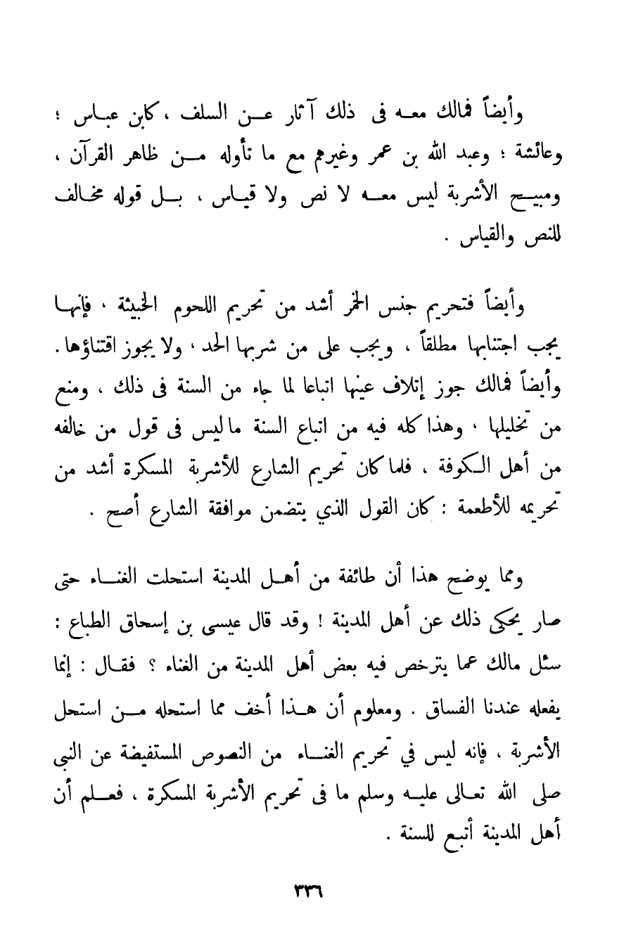 وَأَيْضًا فَمَالِكٌ مَعَهُ فِي ذَلِكَ آثَارٌ عَنْ السَّلَفِ كَابْنِ عَبَّاسٍ؛ وَعَائِشَةَ؛ وَعَبْدِ اللَّهِ بْنِ عُمَرَ وَغَيْرِهِمْ مَعَ مَا تَأَوَّلَهُ مِنْ ظَاهِرِ الْقُرْآنِ وَمُبِيحُ الْأَشْرِبَةِ لَيْسَ مَعَهُ لَا نَصٌّ وَلَا قِيَاسٌ بَلْ قَوْلُهُ مُخَالِفٌ لِلنَّصِّ وَالْقِيَاسِ. وَأَيْضًا فَتَحْرِيمُ جِنْسِ الْخَمْرِ أَشَدُّ مِنْ تَحْرِيمِ اللُّحُومِ الْخَبِيثَةِ فَإِنَّهَا يَجِبُ اجْتِنَابُهَا مُطْلَقًا وَيَجِبُ عَلَى مَنْ شَرِبَهَا الْحَدُّ وَلَا يَجُوزُ اقْتِنَاؤُهَا. وَأَيْضًا فَمَالِكٌ جَوَّزَ إتْلَافَ عَيْنِهَا اتِّبَاعًا لِمَا جَاءَ مِنْ السُّنَّةِ فِي ذَلِكَ وَمَنَعَ مِنْ تَخْلِيلِهَا وَهَذَا كُلُّهُ فِيهِ مِنْ اتِّبَاعِ السُّنَّةِ مَا لَيْسَ فِي قَوْلِ مَنْ خَالَفَهُ مِنْ أَهْلِ الْكُوفَةِ فَلَمَّا كَانَ تَحْرِيمُ الشَّارِعِ لِلْأَشْرِبَةِ الْمُسْكِرَةِ أَشَدَّ مِنْ تَحْرِيمِهِ لِلْأَطْعِمَةِ: كَانَ الْقَوْلُ الَّذِي يَتَضَمَّنُ مُوَافَقَةَ الشَّارِعِ أَصَحَّ. وَمِمَّا يُوَضِّحُ هَذَا أَنَّ طَائِفَةً مِنْ أَهْلِ الْمَدِينَةِ اسْتَحَلَّتْ الْغِنَاءَ حَتَّى صَارَ يُحْكَى ذَلِكَ عَنْ أَهْلِ الْمَدِينَةِ وَقَدْ قَالَ عِيسَى بْنُ إسْحَاقَ الطَّبَّاعُ: سُئِلَ مَالِكٌ عَمًّا يَتَرَخَّصُ فِيهِ بَعْضُ أَهْلِ الْمَدِينَةِ مِنْ الْغِنَاءِ؟ فَقَالَ: إنَّمَا يَفْعَلُهُ عِنْدَنَا الْفُسَّاقُ. وَمَعْلُومٌ أَنَّ هَذَا أَخَفُّ مِمَّا اسْتَحَلَّهُ مَنْ اسْتَحَلَّ الْأَشْرِبَةَ فَإِنَّهُ لَيْسَ فِي تَحْرِيمِ الْغِنَاءِ مِنْ النُّصُوصِ الْمُسْتَفِيضَةِ عَنْ النَّبِيِّ صَلَّى اللَّهُ تَعَالَى عَلَيْهِ وَسَلَّمَ مَا فِي تَحْرِيمِ الْأَشْرِبَةِ الْمُسْكِرَةِ فَعُلِمَ أَنَّ أَهْلَ الْمَدِينَةِ أَتْبَعُ لِلسُّنَّةِ.