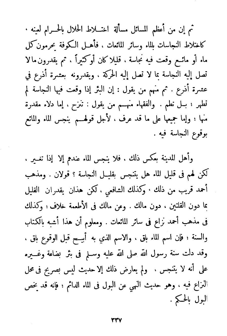 ثُمَّ إنَّ مِنْ أَعْظَمِ الْمَسَائِلِ مَسْأَلَةُ اخْتِلَاطِ الْحَلَالِ بِالْحَرَامِ لِعَيْنِهِ كَاخْتِلَاطِ النَّجَاسَاتِ بِالْمَاءِ وَسَائِرِ الْمَائِعَاتِ فَأَهْلُ الْكُوفَةِ يُحَرِّمُونَ كُلَّ مَاءٍ أَوْ مَائِعٍ وَقَعَتْ فِيهِ نَجَاسَةٌ قَلِيلًا كَانَ أَوْ كَثِيرًا ثُمَّ يُقَدِّرُونَ مَا لَا تَصِلُ إلَيْهِ النَّجَاسَةُ بِمَا لَا تَصِلُ إلَيْهِ الْحَرَكَةُ وَيُقَدِّرُونَهُ بِعَشَرَةِ أَذْرُعٍ فِي عَشَرَةِ أَذْرُعٍ. ثُمَّ مِنْهُمْ مَنْ يَقُولُ: إنَّ الْبِئْرَ إذَا وَقَعَتْ فِيهَا النَّجَاسَةُ لَمْ تَطْهُرْ؛ بَلْ تَطُمُّ. وَالْفُقَهَاءُ مِنْهُمْ مَنْ يَقُولُ: تُنْزَحُ إمَّا دِلَاءٌ مُقَدَّرَةٌ مِنْهَا؛ وَإِمَّا جَمِيعُهَا عَلَى مَا قَدْ عُرِفَ لِأَجْلِ قَوْلِهِمْ يَنْجُسُ الْمَاءُ وَالْمَائِعُ بِوُقُوعِ النَّجَاسَةِ فِيهِ. وَأَهْلُ الْمَدِينَةِ بِعَكْسِ ذَلِكَ فَلَا يَنْجُسُ الْمَاءُ عِنْدَهُمْ إلَّا إذَا تَغَيَّرَ لَكِنْ لَهُمْ فِي قَلِيلِ الْمَاءِ هَلْ يَتَنَجَّسُ بِقَلِيلِ النَّجَاسَةِ؟ قَوْلَانِ. وَمَذْهَبُ أَحْمَد قَرِيبٌ مِنْ ذَلِكَ وَكَذَلِكَ الشَّافِعِيُّ لَكِنْ هَذَانِ يُقَدِّرَانِ الْقَلِيلَ بِمَا دُونَ الْقُلَّتَيْنِ دُونَ مَالِكٍ. وَعَنْ مَالِكٍ فِي الْأَطْعِمَةِ خِلَافٌ؛ وَكَذَلِكَ فِي مَذْهَبِ أَحْمَد نِزَاعٌ فِي سَائِرِ الْمَائِعَاتِ. وَمَعْلُومٌ أَنَّ هَذَا أَشْبَهُ بِالْكِتَابِ وَالسُّنَّةِ؛ فَإِنَّ اسْمَ الْمَاءِ بَاقٍ وَالِاسْمُ الَّذِي بِهِ أُبِيحَ قَبْلَ الْوُقُوعِ بَاقٍ وَقَدْ دَلَّتْ سُنَّةُ رَسُولِ اللَّهِ صَلَّى اللَّهُ عَلَيْهِ وَسَلَّمَ فِي بِئْرِ بضاعة وَغَيْرِهِ عَلَى أَنَّهُ لَا يَتَنَجَّسُ وَلَمْ يُعَارِضْ ذَلِكَ الْأَحَادِيثَ لَيْسَ بِصَرِيحِ فِي مَحَلِّ النِّزَاعِ فِيهِ وَهُوَ حَدِيثُ النَّهْيِ عَنْ الْبَوْلِ فِي الْمَاءِ الدَّائِمِ؛ فَإِنَّهُ قَدْ يَخُصُّ الْبَوْلَ بِالْحُكْمِ.