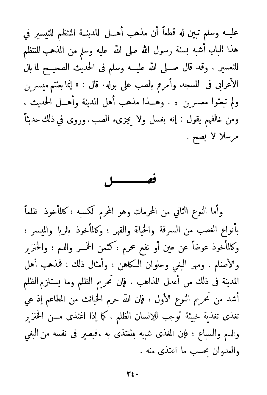 صَلَّى اللَّهُ عَلَيْهِ وَسَلَّمَ تَبَيَّنَ لَهُ قَطْعًا أَنَّ مَذْهَبَ أَهْلِ الْمَدِينَةِ الْمُنْتَظِمَ لِلتَّيْسِيرِ فِي هَذَا الْبَابِ أَشْبَهُ بِسُنَّةِ رَسُولِ اللَّهِ صَلَّى اللَّهُ عَلَيْهِ وَسَلَّمَ مِنْ الْمَذْهَبِ الْمُنْتَظِمِ لِلتَّعْسِيرِ وَقَدْ قَالَ صَلَّى اللَّهُ عَلَيْهِ وَسَلَّمَ فِي الْحَدِيثِ الصَّحِيحِ لَمَّا بَالَ الْأَعْرَابِيُّ فِي الْمَسْجِدِ وَأَمَرَهُمْ بِالصَّبِّ عَلَى بَوْلِهِ قَالَ: {إنَّمَا بُعِثْتُمْ مُيَسِّرِينَ وَلَمْ تُبْعَثُوا مُعَسِّرِينَ} . وَهَذَا مَذْهَبُ أَهْلِ الْمَدِينَةِ وَأَهْلِ الْحَدِيثِ وَمَنْ خَالَفَهُمْ يَقُولُ: إنَّهُ يُغْسَلُ وَلَا يُجْزِئُ الصَّبُّ وَرَوَى فِي ذَلِكَ حَدِيثًا مُرْسَلًا لَا يَصِحُّ.