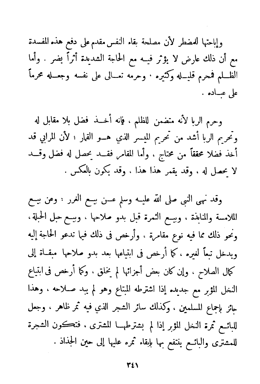 وَإِبَاحَتُهَا لِلْمُضْطَرِّ لِأَنَّ مَصْلَحَةَ بَقَاءِ النَّفْسِ مُقَدَّمٌ عَلَى دَفْعِ هَذِهِ الْمَفْسَدَةِ مَعَ أَنَّ ذَلِكَ عَارِضٌ لَا يُؤَثِّرُ فِيهِ مَعَ الْحَاجَةِ الشَّدِيدَةِ أَثَرًا يَضُرُّ. وَأَمَّا الظُّلْمُ فَمُحَرَّمٌ قَلِيلُهُ وَكَثِيرُهُ وَحَرَّمَهُ تَعَالَى عَلَى نَفْسِهِ وَجَعَلَهُ مُحَرَّمًا عَلَى عِبَادِهِ. وَحَرَّمَ الرِّبَا لِأَنَّهُ مُتَضَمِّنٌ لِلظُّلْمِ فَإِنَّهُ أَخْذُ فَضْلٍ بِلَا مُقَابِلٍ لَهُ وَتَحْرِيمُ الرِّبَا أَشَدُّ مِنْ تَحْرِيمِ الْمَيْسِرِ الَّذِي هُوَ الْقِمَارُ؛ لِأَنَّ الْمُرَابِيَ قَدْ أَخَذَ فَضْلًا مُحَقَّقًا مِنْ مُحْتَاجٍ وَأَمَّا الْمُقَامِرُ فَقَدْ يَحْصُلُ لَهُ فَضْلٌ وَقَدْ لَا يَحْصُلُ لَهُ وَقَدْ يَقْمُرُ هَذَا هَذَا وَقَدْ يَكُونُ بِالْعَكْسِ.