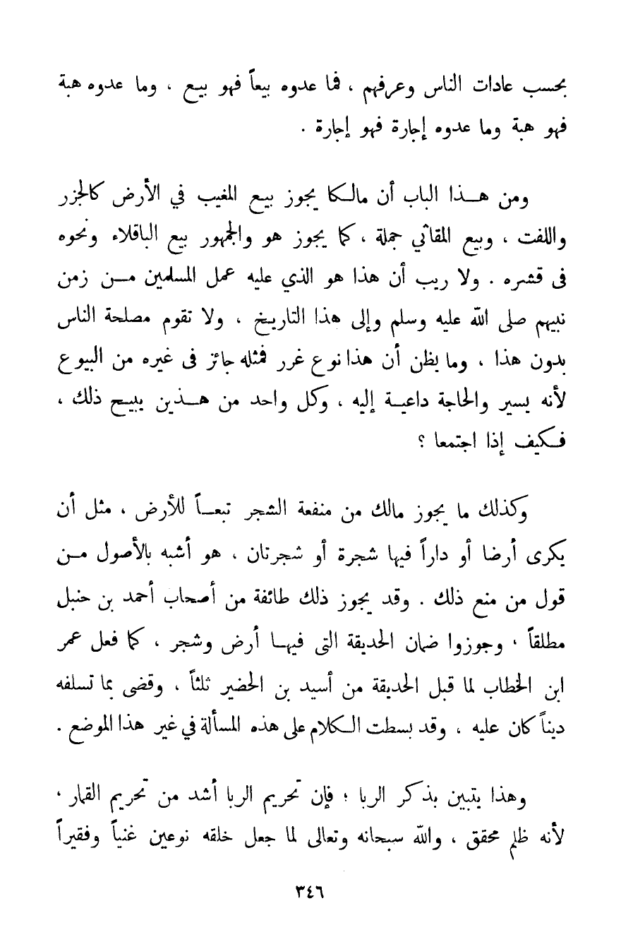 بِحَسَبِ عَادَاتِ النَّاسِ وَعُرْفِهِمْ فَمَا عَدُّوهُ بَيْعًا فَهُوَ بَيْعٌ وَمَا عَدُّوهُ هِبَةً فَهُوَ هِبَةٌ وَمَا عَدُّوهُ إجَارَةً فَهُوَ إجَارَةٌ. وَمِنْ هَذَا الْبَابِ أَنَّ مَالِكًا يُجَوِّزُ بَيْعَ الْمُغَيَّبِ فِي الْأَرْضِ كَالْجَزَرِ وَاللِّفْتِ وَبَيْعِ المقاثي جُمْلَةً كَمَا يُجَوِّزُ هُوَ وَالْجُمْهُورُ بَيْعَ الْبَاقِلَاءِ وَنَحْوَهُ فِي قِشْرِهِ. وَلَا رَيْبَ أَنَّ هَذَا هُوَ الَّذِي عَلَيْهِ عَمَلُ الْمُسْلِمِينَ مِنْ زَمَنِ نَبِيِّهِمْ صَلَّى اللَّهُ عَلَيْهِ وَسَلَّمَ وَإِلَى هَذَا التَّارِيخِ وَلَا تَقُومُ مَصْلَحَةُ النَّاسِ بِدُونِ هَذَا وَمَا يُظَنُّ أَنَّ هَذَا نَوْعُ غَرَرٍ فَمِثْلُهُ جَائِزٌ فِي غَيْرِهِ مِنْ الْبُيُوعِ لِأَنَّهُ يَسِيرٌ وَالْحَاجَةِ دَاعِيَةٌ إلَيْهِ وَكُلُّ وَاحِدٍ مِنْ هَذَيْنِ يُبِيحُ ذَلِكَ فَكَيْفَ إذَا اجْتَمَعَا؟ وَكَذَلِكَ مَا يُجَوِّزُ مَالِكٌ مِنْ مَنْفَعَةِ الشَّجَرِ تَبَعًا لِلْأَرْضِ مِثْلَ أَنْ يَكْرِيَ أَرْضًا أَوْ دَارًا فِيهَا شَجَرَةٌ أَوْ شَجَرَتَانِ هُوَ أَشْبَهُ بِالْأُصُولِ مِنْ قَوْلِ مَنْ مَنَعَ ذَلِكَ. وَقَدْ يُجَوِّزُ ذَلِكَ طَائِفَةٌ مِنْ أَصْحَابِ أَحْمَدَ بْنِ حَنْبَلٍ مُطْلَقًا وَجَوَّزُوا ضَمَانَ الْحَدِيقَةِ الَّتِي فِيهَا أَرْضٌ وَشَجَرٌ كَمَا فَعَلَ عُمَرُ بْنُ الْخَطَّابِ لَمَّا قَبِلَ الْحَدِيقَةَ مِنْ أسيد بْنِ الحضير ثُلُثًا وَقَضَى بِمَا تَسَلَّفَهُ دَيْنًا كَانَ عَلَيْهِ وَقَدْ بَسَطْت الْكَلَامَ عَلَى هَذِهِ الْمَسْأَلَةِ فِي غَيْرِ هَذَا الْمَوْضِعِ.