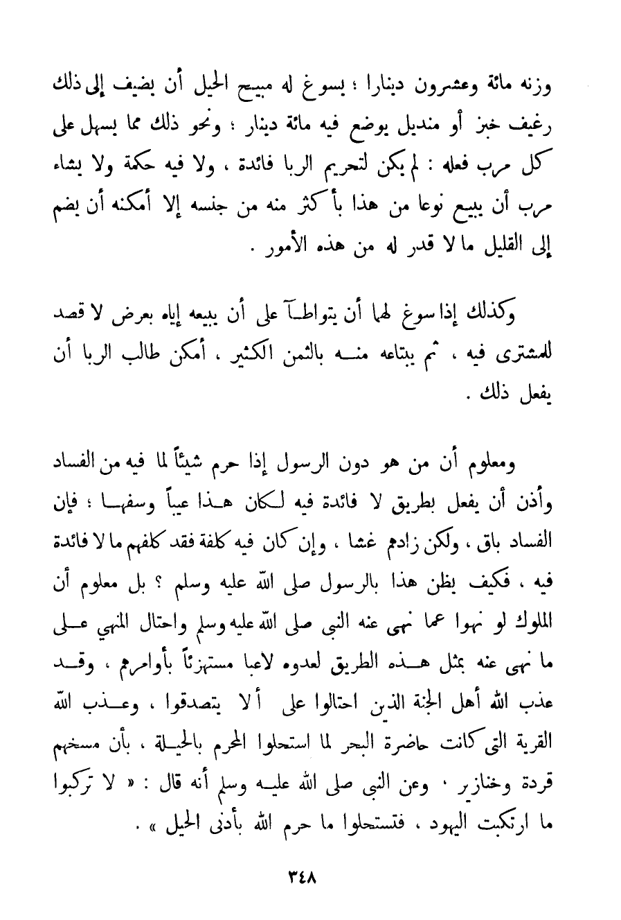 وَمَعْلُومٌ أَنَّ مَنْ هُوَ دُونَ الرَّسُولِ إذَا حَرَّمَ شَيْئًا لِمَا فِيهِ مِنْ الْفَسَادِ وَأَذِنَ أَنْ يُفْعَلَ بِطَرِيقِ لَا فَائِدَةَ فِيهِ لَكَانَ هَذَا عَيْبًا وَسَفَهًا؛ فَإِنَّ الْفَسَادَ بَاقٍ وَلَكِنْ زَادَهُمْ غِشًّا وَإِنْ كَانَ فِيهِ كُلْفَةٌ فَقَدْ كَلَّفَهُمْ مَا لَا فَائِدَةَ فِيهِ فَكَيْفَ يُظَنُّ هَذَا بِالرَّسُولِ صَلَّى اللَّهُ عَلَيْهِ وَسَلَّمَ؟ بَلْ مَعْلُومٌ أَنَّ الْمُلُوكَ لَوْ نَهَوْا عَمَّا نَهَى عَنْهُ النَّبِيُّ صَلَّى اللَّهُ عَلَيْهِ وَسَلَّمَ وَاحْتَالَ الْمَنْهِيُّ عَلَى مَا نُهِيَ عَنْهُ بِمِثْلِ هَذِهِ الطَّرِيقِ لَعَدُّوهُ لَاعِبًا مُسْتَهْزِئًا بِأَوَامِرِهِمْ وَقَدْ عَذَّبَ اللَّهُ أَهْلَ الْجَنَّةِ الَّذِينَ احْتَالُوا عَلَى أَلَّا يَتَصَدَّقُوا وَعَذَّبَ اللَّهُ الْقَرْيَةَ الَّتِي كَانَتْ حَاضِرَةَ الْبَحْرِ لَمَّا اسْتَحَلُّوا الْمُحَرَّمَ بِالْحِيلَةِ بِأَنْ مَسَخَهُمْ قِرَدَةً وَخَنَازِيرَ وَعَنْ النَّبِيِّ صَلَّى اللَّهُ عَلَيْهِ وَسَلَّمَ أَنَّهُ قَالَ: {لَا تَرْكَبُوا مَا ارْتَكَبَتْ الْيَهُودُ فَتَسْتَحِلُّوا مَا حَرَّمَ اللَّهُ بِأَدْنَى الْحِيَلِ} .