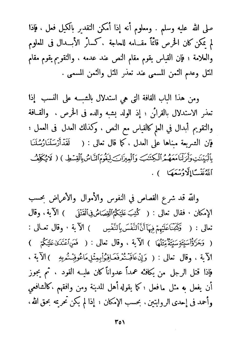 وَاَللَّهُ قَدْ شَرَعَ الْقِصَاصَ فِي النُّفُوسِ وَالْأَمْوَالِ وَالْأَعْرَاضِ بِحَسَبِ الْإِمْكَانِ فَقَالَ تَعَالَى: {كُتِبَ عَلَيْكُمُ الْقِصَاصُ فِي الْقَتْلَى} الْآيَةَ وَقَالَ تَعَالَى: {وَكَتَبْنَا عَلَيْهِمْ فِيهَا أَنَّ النَّفْسَ بِالنَّفْسِ} الْآيَةَ وَقَالَ تَعَالَى: {وَجَزَاءُ سَيِّئَةٍ سَيِّئَةٌ مِثْلُهَا} الْآيَةَ وَقَالَ تَعَالَى: {فَمَنِ اعْتَدَى عَلَيْكُمْ} الْآيَةَ وَقَالَ تَعَالَى: {وَإِنْ عَاقَبْتُمْ فَعَاقِبُوا بِمِثْلِ مَا عُوقِبْتُمْ بِهِ} الْآيَةَ فَإِذَا قَتَلَ الرَّجُلُ مَنْ يُكَافِئُهُ عَمْدًا عُدْوَانًا كَانَ عَلَيْهِ الْقَوَدُ ثُمَّ يَجُوزُ أَنْ يُفْعَلَ بِهِ مِثْلُ مَا فَعَلَ؛ كَمَا يَقُولُهُ أَهْلُ الْمَدِينَةِ وَمَنْ وَافَقَهُمْ كَالشَّافِعِيِّ وَأَحْمَد فِي إحْدَى الرِّوَايَتَيْنِ بِحَسَبِ الْإِمْكَانِ؛ إذَا لَمْ يَكُنْ تَحْرِيمُهُ بِحَقِّ اللَّهِ