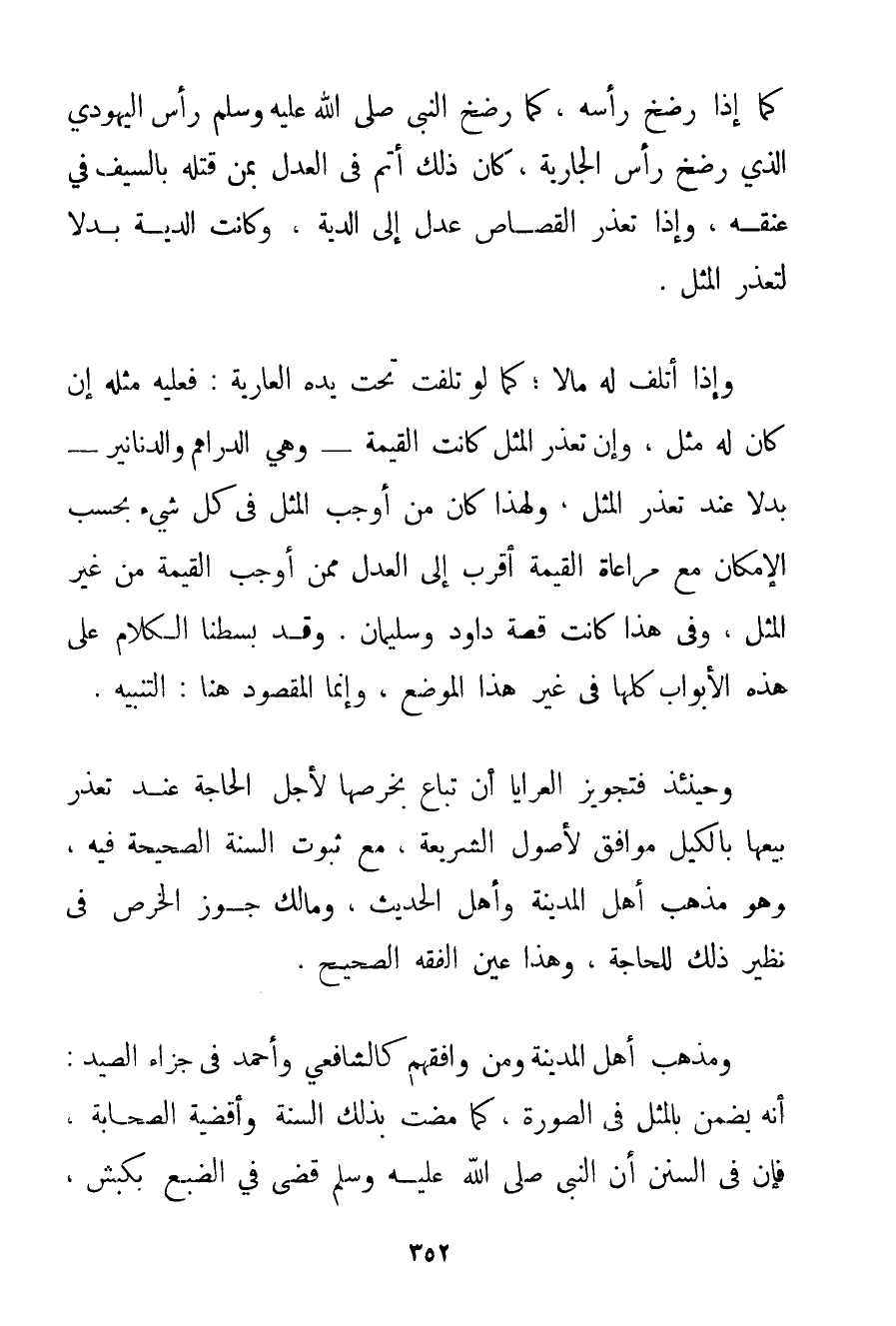 كَمَا إذَا رَضَخَ رَأْسَهُ كَمَا {رَضَخَ النَّبِيُّ صَلَّى اللَّهُ عَلَيْهِ وَسَلَّمَ رَأْسَ الْيَهُودِيِّ الَّذِي رَضَخَ رَأْسَ الْجَارِيَةِ} كَانَ ذَلِكَ أَتَمَّ فِي الْعَدْلِ بِمَنْ قَتَلَهُ بِالسَّيْفِ فِي عُنُقِهِ وَإِذَا تَعَذَّرَ الْقِصَاصُ عُدِلَ إلَى الدِّيَةِ وَكَانَتْ الدِّيَةُ بَدَلًا لِتَعَذُّرِ الْمِثْلِ. وَإِذَا أَتْلَفَ لَهُ مَالًا؛ كَمَا لَوْ تَلِفَتْ تَحْتَ يَدِهِ الْعَارِيَةُ: فَعَلَيْهِ مِثْلُهُ إنْ كَانَ لَهُ مِثْلٌ وَإِنْ تَعَذَّرَ الْمِثْلُ كَانَتْ الْقِيمَةُ - وَهِيَ الدَّرَاهِمُ وَالدَّنَانِيرُ - بَدَلًا عِنْدَ تَعَذُّرِ الْمِثْلِ وَلِهَذَا كَانَ مَنْ أَوْجَبَ الْمِثْلَ فِي كُلِّ شَيْءٍ بِحَسَبِ الْإِمْكَانِ مَعَ مُرَاعَاةِ الْقِيمَةِ أَقْرَبَ إلَى الْعَدْلِ مِمَّنْ أَوْجَبَ الْقِيمَةَ مِنْ غَيْرِ الْمِثْلِ وَفِي هَذَا كَانَتْ قِصَّةُ دَاوُد وَسُلَيْمَانَ. وَقَدْ بَسَطْنَا الْكَلَامَ عَلَى هَذِهِ الْأَبْوَابِ كُلِّهَا فِي غَيْرِ هَذَا الْمَوْضِعِ وَإِنَّمَا الْمَقْصُودُ هُنَا: التَّنْبِيهُ. وَحِينَئِذٍ فَتَجْوِيزُ الْعَرَايَا أَنْ تُبَاعَ بِخَرْصِهَا لِأَجْلِ الْحَاجَةِ عِنْدَ تَعَذُّرِ بَيْعِهَا بِالْكَيْلِ مُوَافِقٌ لِأُصُولِ الشَّرِيعَةِ مَعَ ثُبُوتِ السُّنَّةِ الصَّحِيحَةِ فِيهِ وَهُوَ مَذْهَبُ أَهْلِ الْمَدِينَةِ وَأَهْلِ الْحَدِيثِ وَمَالِكٌ جَوَّزَ الْخَرْصَ فِي نَظِيرِ ذَلِكَ لِلْحَاجَةِ وَهَذَا عَيْنُ الْفِقْهِ الصَّحِيحِ. وَمَذْهَبُ أَهْلِ الْمَدِينَةِ وَمَنْ وَافَقَهُمْ كَالشَّافِعِيِّ وَأَحْمَد فِي جَزَاءِ الصَّيْدِ: أَنَّهُ يُضْمَنُ بِالْمِثْلِ فِي الصُّورَةِ كَمَا مَضَتْ بِذَلِكَ السُّنَّةُ وَأَقْضِيَةُ الصَّحَابَةِ فَإِنَّ فِي السُّنَنِ أَنَّ النَّبِيَّ صَلَّى اللَّهُ عَلَيْهِ وَسَلَّمَ قَضَى فِي الضَّبُعِ بِكَبْشِ