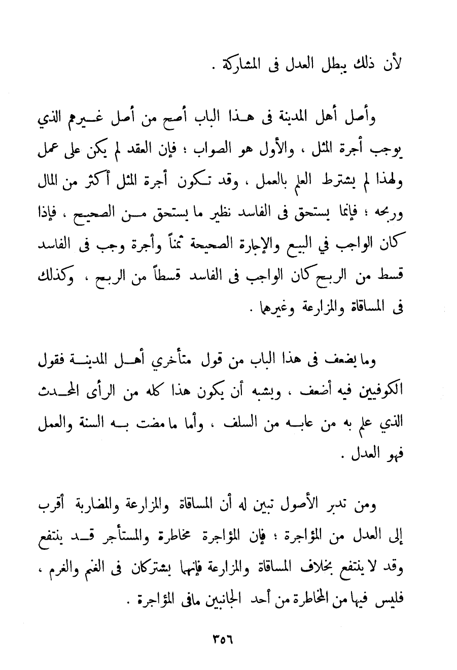 لِأَنَّ ذَلِكَ يُبْطِلُ الْعَدْلَ فِي الْمُشَارَكَةِ. وَأَصْلُ أَهْلِ الْمَدِينَةِ فِي هَذَا الْبَابِ أَصَحُّ مِنْ أَصْلِ غَيْرِهِمْ الَّذِي يُوجِبُ أُجْرَةَ الْمِثْلِ وَالْأَوَّلُ هُوَ الصَّوَابُ؛ فَإِنَّ الْعَقْدَ لَمْ يَكُنْ عَلَى عَمَلٍ وَلِهَذَا لَمْ يُشْتَرَطْ الْعِلْمُ بِالْعَمَلِ وَقَدْ تَكُونُ أُجْرَةُ الْمِثْلِ أَكْثَرَ مِنْ الْمَالِ وَرِبْحِهِ: فَإِنَّمَا يَسْتَحِقُّ فِي الْفَاسِدِ نَظِيرَ مَا يَسْتَحِقُّ مِنْ الصَّحِيحِ فَإِذَا كَانَ الْوَاجِبُ فِي الْبَيْعِ وَالْإِجَارَةِ الصَّحِيحَةِ ثَمَنًا وَأُجْرَةً وَجَبَ فِي الْفَاسِدِ قِسْطٌ مِنْ الرِّبْحِ كَانَ الْوَاجِبُ فِي الْفَاسِدِ قِسْطًا مِنْ الرِّبْحِ وَكَذَلِكَ فِي الْمُسَاقَاةِ وَالْمُزَارَعَةِ وَغَيْرِهِمَا. وَمَا يَضْعُفُ فِي هَذَا الْبَابِ مِنْ قَوْلِ مُتَأَخِّرِي أَهْلِ الْمَدِينَةِ فَقَوْلُ الْكُوفِيِّينَ فِيهِ أَضْعَفُ وَيُشْبِهُ أَنْ يَكُونَ هَذَا كُلُّهُ مِنْ الرَّأْيِ الْمُحْدَثِ الَّذِي عَلِمَ بِهِ مَنْ عَابَهُ مِنْ السَّلَفِ وَأَمَّا مَا مَضَتْ بِهِ السُّنَّةُ وَالْعَمَلُ فَهُوَ الْعَدْلُ. وَمَنْ تَدَبَّرَ الْأُصُولَ تَبَيَّنَ لَهُ أَنَّ الْمُسَاقَاةَ وَالْمُزَارَعَةَ وَالْمُضَارَبَةَ أَقْرَبُ إلَى الْعَدْلِ مِنْ الْمُؤَاجَرَةِ؛ فَإِنَّ الْمُؤَاجَرَةَ مُخَاطَرَةٌ وَالْمُسْتَأْجِرَ قَدْ يَنْتَفِعُ وَقَدْ لَا يَنْتَفِعُ بِخِلَافِ الْمُسَاقَاةِ وَالْمُزَارَعَةِ فَإِنَّهُمَا يَشْتَرِكَانِ فِي الْغُنْمِ وَالْغُرْمِ فَلَيْسَ فِيهَا مِنْ الْمُخَاطَرَةِ مِنْ أَحَدِ الْجَانِبَيْنِ مَا فِي الْمُؤَاجَرَةِ.