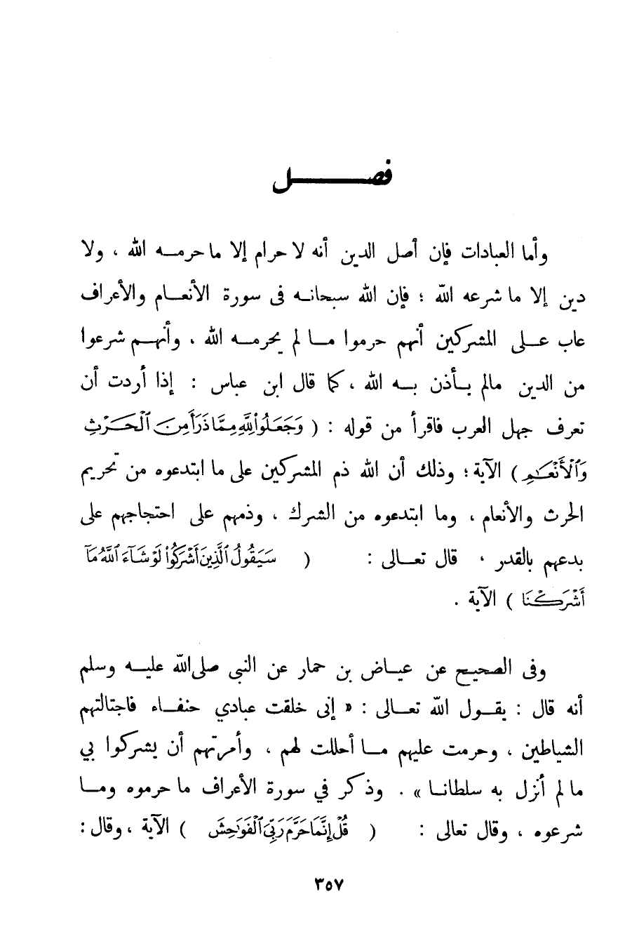 وَأَمَّا الْعِبَادَاتُ فَإِنَّ أَصْلَ الدِّينِ أَنَّهُ لَا حَرَامَ إلَّا مَا حَرَّمَهُ اللَّهُ وَلَا دِينَ إلَّا مَا شَرَعَهُ اللَّهُ؛ فَإِنَّ اللَّهَ سُبْحَانَهُ فِي سُورَةِ الْأَنْعَامِ وَالْأَعْرَافِ عَابَ عَلَى الْمُشْرِكِينَ أَنَّهُمْ حَرَّمُوا مَا لَمْ يُحَرِّمْهُ اللَّهُ وَأَنَّهُمْ شَرَعُوا مِنْ الدِّينِ مَا لَمْ يَأْذَنْ بِهِ اللَّهُ كَمَا قَالَ ابْنُ عَبَّاسٍ: إذَا أَرَدْت أَنْ تَعْرِفَ جَهْلَ الْعَرَبِ فَاقْرَأْ مِنْ قَوْلِهِ: {وَجَعَلُوا لِلَّهِ مِمَّا ذَرَأَ مِنَ الْحَرْثِ وَالْأَنْعَامِ} الْآيَةَ؛ وَذَلِكَ أَنَّ اللَّهَ ذَمَّ الْمُشْرِكِينَ عَلَى مَا ابْتَدَعُوهُ مِنْ تَحْرِيمِ الْحَرْثِ وَالْأَنْعَامِ وَمَا ابْتَدَعُوهُ مِنْ الشِّرْكِ وَذَمَّهُمْ عَلَى احْتِجَاجِهِمْ عَلَى بِدَعِهِمْ بِالْقَدَرِ قَالَ تَعَالَى: {سَيَقُولُ الَّذِينَ أَشْرَكُوا لَوْ شَاءَ اللَّهُ مَا أَشْرَكْنَا} الْآيَةَ. وَفِي الصَّحِيحِ عَنْ عِيَاضِ بْنِ حِمَارٍ {عَنْ النَّبِيِّ صَلَّى اللَّهُ عَلَيْهِ وَسَلَّمَ أَنَّهُ قَالَ: يَقُولُ اللَّهُ تَعَالَى: إنِّي خَلَقْت عِبَادِي حُنَفَاءَ فَاجْتَالَتْهُمْ الشَّيَاطِينُ وَحَرَّمَتْ عَلَيْهِمْ مَا أَحْلَلْت لَهُمْ وَأَمَرَتْهُمْ أَنْ يُشْرِكُوا بِي مَا لَمْ أُنَزِّلْ بِهِ سُلْطَانًا} وَذَكَرَ فِي سُورَةِ الْأَعْرَافِ مَا حَرَّمُوهُ وَمَا شَرَعُوهُ وَقَالَ تَعَالَى: {قُلْ إنَّمَا حَرَّمَ رَبِّيَ الْفَوَاحِشَ} الْآيَةَ وَقَالَ: