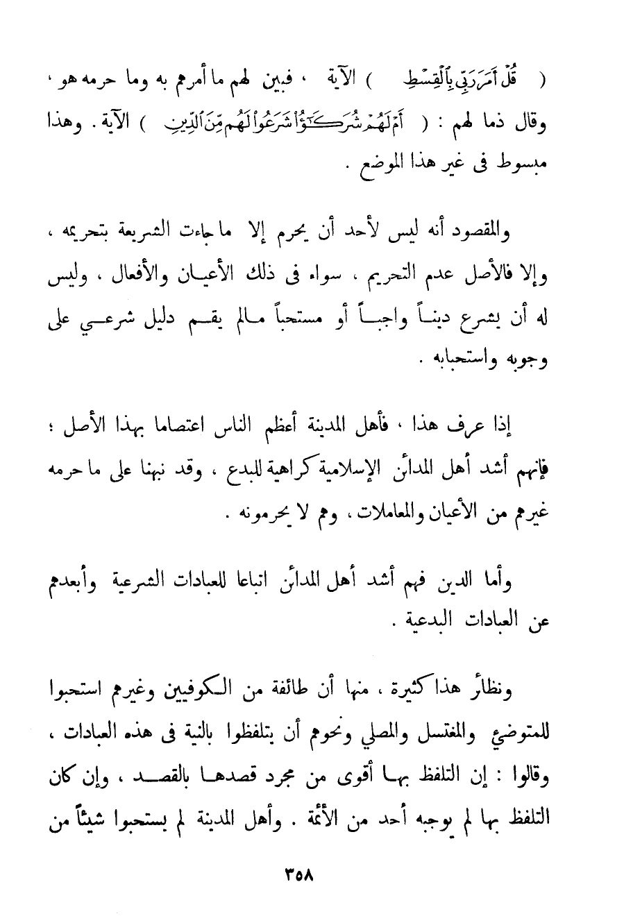 {قُلْ أَمَرَ رَبِّي بِالْقِسْطِ} الْآيَةَ فَبَيَّنَ لَهُمْ مَا أَمَرَهُمْ بِهِ وَمَا حَرَّمَهُ هُوَ وَقَالَ ذَمًّا لَهُمْ: {أَمْ لَهُمْ شُرَكَاءُ شَرَعُوا لَهُمْ مِنَ الدِّينِ} الْآيَةَ. وَهَذَا مَبْسُوطٌ فِي غَيْرِ هَذَا الْمَوْضِعِ. وَالْمَقْصُودُ أَنَّهُ لَيْسَ لِأَحَدِ أَنْ يُحَرِّمَ إلَّا مَا جَاءَتْ الشَّرِيعَةُ بِتَحْرِيمِهِ وَإِلَّا فَالْأَصْلُ عَدَمُ التَّحْرِيمِ. سَوَاءٌ فِي ذَلِكَ الْأَعْيَانُ وَالْأَفْعَالُ وَلَيْسَ لَهُ أَنْ يَشْرَعَ دِينًا وَاجِبًا أَوْ مُسْتَحَبًّا مَا لَمْ يَقُمْ دَلِيلٌ شَرْعِيٌّ عَلَى وُجُوبِهِ وَاسْتِحْبَابِهِ. إذَا عُرِفَ هَذَا فَأَهْلُ الْمَدِينَةِ أَعْظَمُ النَّاسِ اعْتِصَامًا بِهَذَا الْأَصْلِ؛ فَإِنَّهُمْ أَشَدُّ أَهْلِ الْمَدَائِنِ الْإِسْلَامِيَّةِ كَرَاهِيَةً لِلْبِدَعِ وَقَدْ نَبَّهْنَا عَلَى مَا حَرَّمَهُ غَيْرُهُمْ مِنْ الْأَعْيَانِ وَالْمُعَامَلَاتِ وَهُمْ لَا يُحَرِّمُونَهُ. وَأَمَّا الدِّينُ فَهُمْ أَشَدُّ أَهْلِ الْمَدَائِنِ اتِّبَاعًا لِلْعِبَادَاتِ الشَّرْعِيَّةِ وَأَبْعَدُهُمْ عَنْ الْعِبَادَاتِ الْبِدْعِيَّةِ. وَنَظَائِرُ هَذَا كَثِيرَةٌ مِنْهَا أَنَّ طَائِفَةً مِنْ الْكُوفِيِّينَ وَغَيْرِهِمْ اسْتَحَبُّوا لِلْمُتَوَضِّئِ وَالْمُغْتَسِلِ وَالْمُصَلِّي وَنَحْوِهِمْ أَنْ يَتَلَفَّظُوا بِالنِّيَّةِ فِي هَذِهِ الْعِبَادَاتِ وَقَالُوا: إنَّ التَّلَفُّظَ بِهَا أَقْوَى مِنْ مُجَرَّدِ قَصْدِهَا بِالْقَصْدِ وَإِنْ كَانَ التَّلَفُّظُ بِهَا لَمْ يُوجِبْهُ أَحَدٌ مِنْ الْأَئِمَّةِ. وَأَهْلُ الْمَدِينَةِ لَمْ يَسْتَحِبُّوا شَيْئًا مِنْ