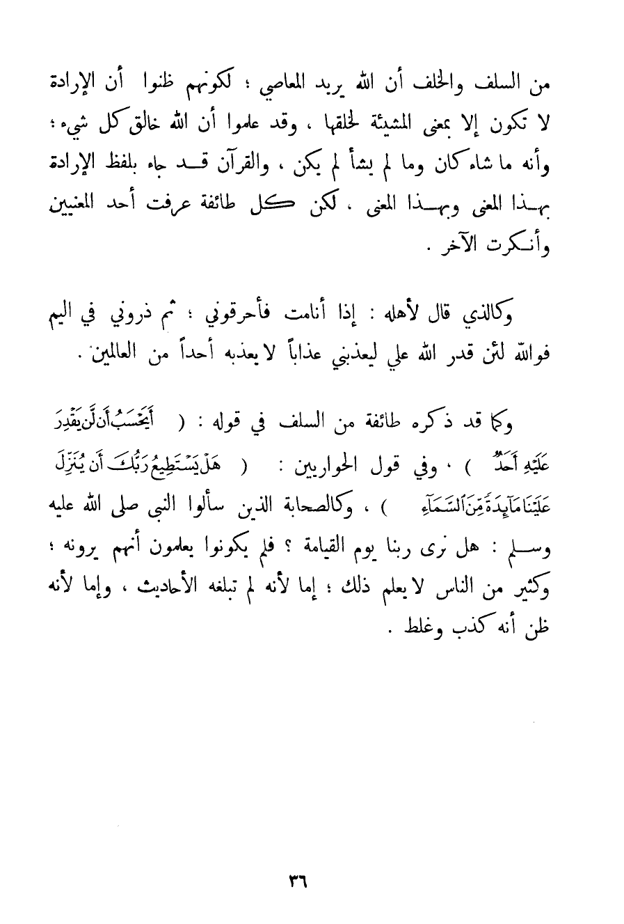 مِنْ السَّلَفِ وَالْخَلَفِ أَنَّ اللَّهَ يُرِيدُ الْمَعَاصِيَ؛ لِكَوْنِهِمْ ظَنُّوا أَنَّ الْإِرَادَةَ لَا تَكُونُ إلَّا بِمَعْنَى الْمَشِيئَةِ لِخَلْقِهَا وَقَدْ عَلِمُوا أَنَّ اللَّهَ خَالِقُ كُلِّ شَيْءٍ؛ وَأَنَّهُ مَا شَاءَ كَانَ وَمَا لَمْ يَشَأْ لَمْ يَكُنْ وَالْقُرْآنُ قَدْ جَاءَ بِلَفْظِ الْإِرَادَةِ بِهَذَا الْمَعْنَى وَبِهَذَا الْمَعْنَى لَكِنَّ كُلَّ طَائِفَةٍ عَرَفَتْ أَحَدَ الْمَعْنَيَيْنِ وَأَنْكَرَتْ الْآخَرَ. وَكَاَلَّذِي قَالَ لِأَهْلِهِ: إذَا أَنَا مُتّ فَأَحْرِقُونِي: ثُمَّ ذَرُونِي فِي الْيَمِّ فَوَاَللَّهِ لَئِنْ قَدَرَ اللَّهُ عَلَيَّ لَيُعَذِّبَنِي عَذَابًا لَا يُعَذِّبُهُ أَحَدًا مِنْ الْعَالَمِينَ. وَكَمَا قَدْ ذَكَرَهُ طَائِفَةٌ مِنْ السَّلَفِ فِي قَوْلِهِ: {أَيَحْسَبُ أَنْ لَنْ يَقْدِرَ عَلَيْهِ أَحَدٌ} وَفِي قَوْلِ الْحَوَارِيِّينَ: {هَلْ يَسْتَطِيعُ رَبُّكَ أَنْ يُنَزِّلَ عَلَيْنَا مَائِدَةً مِنَ السَّمَاءِ} وَكَالصَّحَابَةِ الَّذِينَ سَأَلُوا النَّبِيَّ صَلَّى اللَّهُ عَلَيْهِ وَسَلَّمَ هَلْ نَرَى رَبَّنَا يَوْمَ الْقِيَامَةِ؟ فَلَمْ يَكُونُوا يَعْلَمُونَ أَنَّهُمْ يَرَوْنَهُ؛ وَكَثِيرٌ مِنْ النَّاسِ لَا يَعْلَمُ ذَلِكَ؛ إمَّا لِأَنَّهُ لَمْ تَبْلُغْهُ الْأَحَادِيثُ وَإِمَّا لِأَنَّهُ ظَنَّ أَنَّهُ كَذِبٌ وَغَلَطٌ.