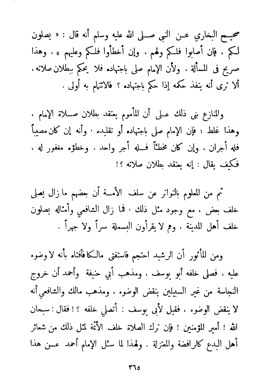 صِحَّتِهِ؛ فَقَدْ ثَبَتَ فِي صَحِيحِ الْبُخَارِيِّ {عَنْ النَّبِيِّ صَلَّى اللَّهُ عَلَيْهِ وَسَلَّمَ أَنَّهُ قَالَ: يُصَلُّونَ لَكُمْ فَإِنْ أَصَابُوا فَلَكُمْ وَلَهُمْ وَإِنْ أَخْطَئُوا فَلَكُمْ وَعَلَيْهِمْ} وَهَذَا صَرِيحٌ فِي الْمَسْأَلَةِ وَلِأَنَّ الْإِمَامَ صَلَّى بِاجْتِهَادِهِ فَلَا يُحْكَمُ بِبُطْلَانِ صَلَاتِهِ أَلَا تَرَى أَنَّهُ يُنَفِّذُ حُكْمَهُ إذَا حَكَمَ بِاجْتِهَادِهِ؟ فالائتمام بِهِ أَوْلَى. وَالْمُنَازِعُ بَنَى ذَلِكَ عَلَى أَنَّ الْمَأْمُومَ يَعْتَقِدُ بُطْلَانَ صَلَاةِ الْإِمَامِ وَهَذَا غَلَطٌ؛ فَإِنَّ الْإِمَامَ صَلَّى بِاجْتِهَادِهِ أَوْ تَقْلِيدِهِ وَأَنَّهُ إنْ كَانَ مُصِيبًا فَلَهُ أَجْرَانِ وَإِنْ كَانَ مُخْطِئًا فَلَهُ أَجْرٌ وَاحِدٌ وَخَطَؤُهُ مَغْفُورٌ لَهُ فَكَيْفَ يُقَالُ: إنَّهُ يَعْتَقِدُ بُطْلَانَ صَلَاتِهِ ثُمَّ مِنْ الْمَعْلُومِ بِالتَّوَاتُرِ عَنْ سَلَفِ الْأُمَّةِ أَنَّ بَعْضَهُمْ مَا زَالَ يُصَلِّي خَلْفَ بَعْضٍ مَعَ وُجُودِ مِثْلِ ذَلِكَ فَمَا زَالَ الشَّافِعِيُّ وَأَمْثَالُهُ يُصَلُّونَ خَلْفَ أَهْلِ الْمَدِينَةِ وَهُمْ لَا يَقْرَءُونَ الْبَسْمَلَةَ سِرًّا وَلَا جَهْرًا. وَمِنْ الْمَأْثُورِ أَنَّ الرَّشِيدَ احْتَجَمَ فَاسْتَفْتَى مَالِكًا فَأَفْتَاهُ بِأَنَّهُ لَا وُضُوءَ عَلَيْهِ فَصَلَّى خَلْفَهُ أَبُو يُوسُفَ وَمَذْهَبُ أَبِي حَنِيفَةَ وَأَحْمَد أَنَّ خُرُوجَ النَّجَاسَةِ مِنْ غَيْرِ السَّبِيلَيْنِ يَنْقُضُ الْوُضُوءَ وَمَذْهَبُ مَالِكٍ وَالشَّافِعِيِّ أَنَّهُ لَا يَنْقُضُ الْوُضُوءَ فَقِيلَ لِأَبِي يُوسُفَ: أَتُصَلِّي خَلْفَهُ فَقَالَ: سُبْحَانَ اللَّهِ أَمِيرُ الْمُؤْمِنِينَ فَإِنَّ تَرْكَ الصَّلَاةِ خَلْفَ الْأَئِمَّةِ لِمِثْلِ ذَلِكَ مِنْ شَعَائِرِ أَهْلِ الْبِدَعِ كَالرَّافِضَةِ وَالْمُعْتَزِلَةِ. وَلِهَذَا لَمَّا سُئِلَ الْإِمَامُ أَحْمَد عَنْ هَذَا