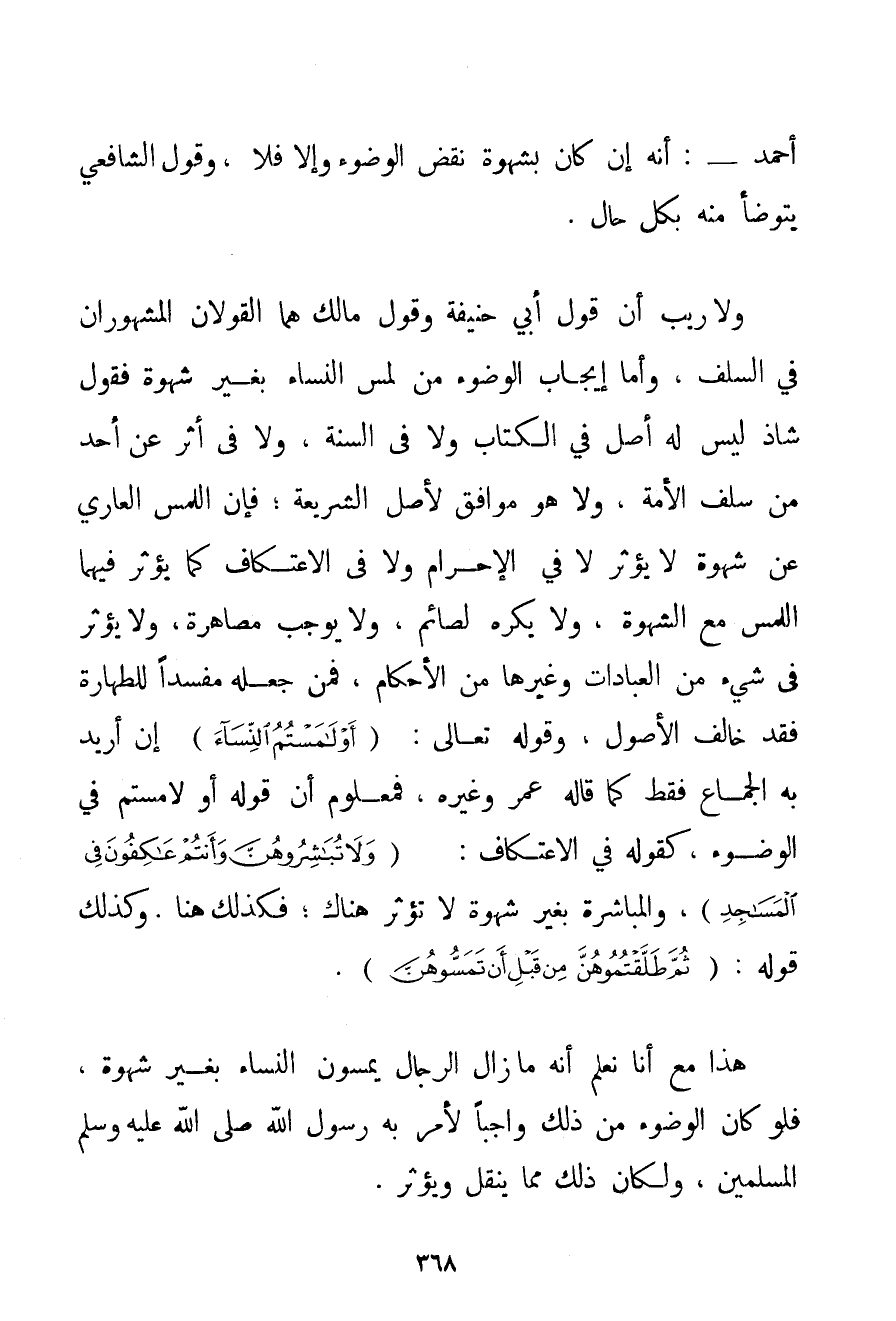 أَحْمَد -: أَنَّهُ إنْ كَانَ بِشَهْوَةِ نَقَضَ الْوُضُوءَ وَإِلَّا فَلَا وَقَوْلُ الشَّافِعِيِّ يَتَوَضَّأُ مِنْهُ بِكُلِّ حَالٍ. وَلَا رَيْبَ أَنَّ قَوْلَ أَبِي حَنِيفَةَ وَقَوْلَ مَالِكٍ هُمَا الْقَوْلَانِ الْمَشْهُورَانِ فِي السَّلَفِ وَأَمَّا إيجَابُ الْوُضُوءِ مِنْ لَمْسِ النِّسَاءِ بِغَيْرِ شَهْوَةٍ فَقَوْلٌ شَاذٌّ لَيْسَ لَهُ أَصْلٌ فِي الْكِتَابِ وَلَا فِي السُّنَّةِ وَلَا فِي أَثَرٍ عَنْ أَحَدٍ مِنْ سَلَفِ الْأُمَّةِ وَلَا هُوَ مُوَافِقٌ لِأَصْلِ الشَّرِيعَةِ؛ فَإِنَّ اللَّمْسَ الْعَارِيَ عَنْ شَهْوَةٍ لَا يُؤَثِّرُ لَا فِي الْإِحْرَامِ وَلَا فِي الِاعْتِكَافِ كَمَا يُؤَثِّرُ فِيهِمَا اللَّمْسُ مَعَ الشَّهْوَةِ وَلَا يُكْرَهُ لِصَائِمِ وَلَا يُوجِبُ مُصَاهَرَةً وَلَا يُؤَثِّرُ فِي شَيْءٍ مِنْ الْعِبَادَاتِ وَغَيْرِهَا مِنْ الْأَحْكَامِ فَمَنْ جَعَلَهُ مُفْسِدًا لِلطَّهَارَةِ فَقَدْ خَالَفَ الْأُصُولَ وقَوْله تَعَالَى {أَوْ لَامَسْتُمُ النِّسَاءَ} إنْ أُرِيدَ بِهِ الْجِمَاعُ فَقَطْ كَمَا قَالَهُ عُمَرُ وَغَيْرُهُ فَمَعْلُومٌ أَنَّ قَوْلَهُ أَوْ لَامَسْتُمْ فِي الْوُضُوءِ كَقَوْلِهِ فِي الِاعْتِكَافِ: {وَلَا تُبَاشِرُوهُنَّ وَأَنْتُمْ عَاكِفُونَ فِي الْمَسَاجِدِ} وَالْمُبَاشَرَةُ بِغَيْرِ شَهْوَةٍ لَا تُؤَثِّرُ هُنَاكَ؛ فَكَذَلِكَ هُنَا. وَكَذَلِكَ قَوْلُهُ: {ثُمَّ طَلَّقْتُمُوهُنَّ مِنْ قَبْلِ أَنْ تَمَسُّوهُنَّ} . هَذَا مَعَ أَنَّا نَعْلَمُ أَنَّهُ مَا زَالَ الرِّجَالُ يَمَسُّونَ النِّسَاءَ بِغَيْرِ شَهْوَةٍ فَلَوْ كَانَ الْوُضُوءُ مِنْ ذَلِكَ وَاجِبًا لَأَمَرَ بِهِ رَسُولُ اللَّهِ صَلَّى اللَّهُ عَلَيْهِ وَسَلَّمَ الْمُسْلِمِينَ وَلَكَانَ ذَلِكَ مِمَّا يُنْقَلُ وَيُؤْثَرُ.