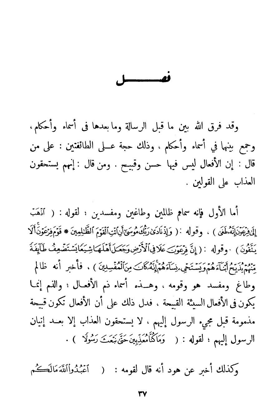 وَقَدْ فَرَّقَ اللَّهُ بَيْنَ مَا قَبْلَ الرِّسَالَةِ وَمَا بَعْدَهَا فِي أَسْمَاءَ وَأَحْكَامٍ وَجَمَعَ بَيْنَهُمَا فِي أَسْمَاءَ وَأَحْكَامٍ وَذَلِكَ حُجَّةٌ عَلَى الطَّائِفَتَيْنِ: عَلَى مَنْ قَالَ: إنَّ الْأَفْعَالَ لَيْسَ فِيهَا حَسَنٌ وَقَبِيحٌ. وَمَنْ قَالَ: إنَّهُمْ يَسْتَحِقُّونَ الْعَذَابَ عَلَى الْقَوْلَيْنِ. أَمَّا الْأَوَّلُ فَإِنَّهُ سَمَّاهُمْ ظَالِمِينَ وَطَاغِينَ وَمُفْسِدِينَ؛ لِقَوْلِهِ: {اذْهَبْ إلَى فِرْعَوْنَ إنَّهُ طَغَى} وَقَوْلِهِ: {وَإِذْ نَادَى رَبُّكَ مُوسَى أَنِ ائْتِ الْقَوْمَ الظَّالِمِينَ} {قَوْمَ فِرْعَوْنَ أَلَا يَتَّقُونَ} وَقَوْلِهِ: {إنَّ فِرْعَوْنَ عَلَا فِي الْأَرْضِ وَجَعَلَ أَهْلَهَا شِيَعًا يَسْتَضْعِفُ طَائِفَةً مِنْهُمْ يُذَبِّحُ أَبْنَاءَهُمْ وَيَسْتَحْيِي نِسَاءَهُمْ إنَّهُ كَانَ مِنَ الْمُفْسِدِينَ} فَأَخْبَرَ أَنَّهُ ظَالِمٌ وَطَاغٍ وَمُفْسِدٌ هُوَ وَقَوْمُهُ وَهَذِهِ أَسْمَاءُ ذَمِّ الْأَفْعَالِ؛ وَالذَّمُّ إنَّمَا. يَكُونُ فِي الْأَفْعَالِ السَّيِّئَةِ الْقَبِيحَةِ فَدَلَّ ذَلِكَ عَلَى أَنَّ الْأَفْعَالَ تَكُونُ قَبِيحَةً مَذْمُومَةً قَبْلَ مَجِيءِ الرَّسُولِ إلَيْهِمْ لَا يَسْتَحِقُّونَ الْعَذَابَ إلَّا بَعْدَ إتْيَانِ الرَّسُولِ إلَيْهِمْ؛ لِقَوْلِهِ: {وَمَا كُنَّا مُعَذِّبِينَ حَتَّى نَبْعَثَ رَسُولًا} . وَكَذَلِكَ أَخْبَرَ عَنْ هُودَ أَنَّهُ قَالَ لِقَوْمِهِ: {اعْبُدُوا اللَّهَ مَا لَكُمْ مِنْ