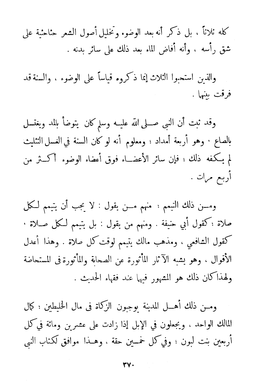 وَمِنْ ذَلِكَ التَّيَمُّمُ؛ مِنْهُمْ مَنْ يَقُولُ: لَا يَجِبُ أَنْ يَتَيَمَّمَ لِكُلِّ صَلَاةٍ؛ كَقَوْلِ أَبِي حَنِيفَةَ. وَمِنْهُمْ مَنْ يَقُولُ: بَلْ يَتَيَمَّمُ لِكُلِّ صَلَاةٍ كَقَوْلِ الشَّافِعِيِّ وَمَذْهَبُ مَالِكٍ يَتَيَمَّمُ لِوَقْتِ كُلِّ صَلَاةٍ. وَهَذَا أَعْدَلُ الْأَقْوَالِ وَهُوَ يُشْبِهُ الْآثَارَ الْمَأْثُورَةَ عَنْ الصَّحَابَةِ وَالْمَأْثُورَةَ فِي الْمُسْتَحَاضَةِ وَلِهَذَا كَانَ ذَلِكَ هُوَ الْمَشْهُورُ فِيهِمَا عِنْدَ فُقَهَاءِ الْحَدِيثِ.