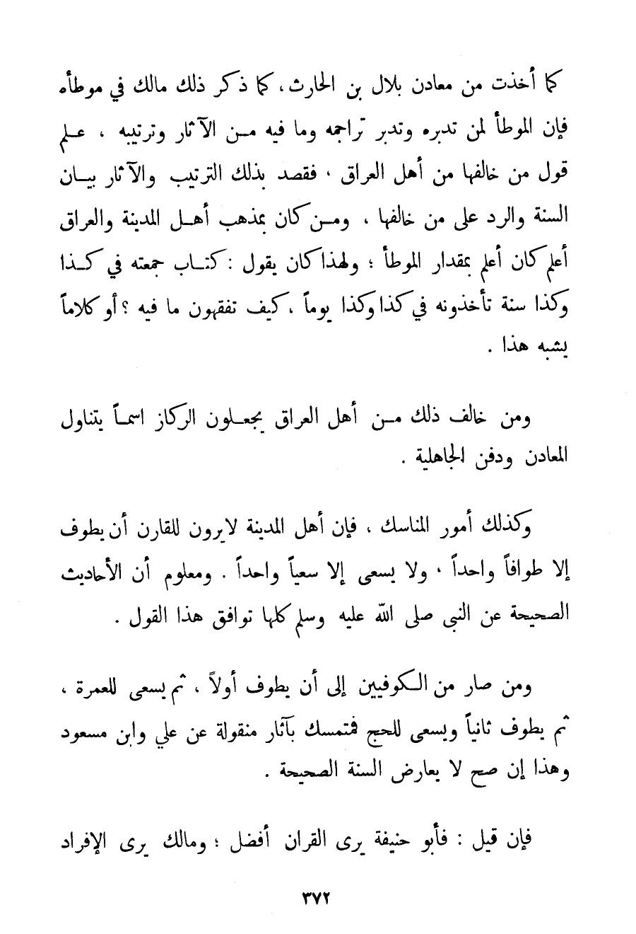 وَكَذَلِكَ أُمُورُ الْمَنَاسِكِ فَإِنَّ أَهْلَ الْمَدِينَةِ لَا يَرَوْنَ لِلْقَارِنِ أَنْ يَطُوفَ إلَّا طَوَافًا وَاحِدًا وَلَا يَسْعَى إلَّا سَعْيًا وَاحِدًا. وَمَعْلُومٌ أَنَّ الْأَحَادِيثَ الصَّحِيحَةَ عَنْ النَّبِيِّ صَلَّى اللَّهُ عَلَيْهِ وَسَلَّمَ كُلَّهَا تُوَافِقُ هَذَا الْقَوْلَ. وَمَنْ صَارَ مِنْ الْكُوفِيِّينَ إلَى أَنْ يَطُوفَ أَوَّلًا ثُمَّ يَسْعَى لِلْعُمْرَةِ ثُمَّ يَطُوفَ ثَانِيًا وَيَسْعَى لِلْحَجِّ فَمُتَمَسِّكٌ بِآثَارِ مَنْقُولَةٍ عَنْ عَلِيٍّ وَابْنِ مَسْعُودٍ وَهَذَا إنْ صَحَّ لَا يُعَارِضُ السُّنَّةَ الصَّحِيحَةَ. فَإِنْ قِيلَ: فَأَبُو حَنِيفَةَ يَرَى الْقِرَانَ أَفْضَلَ؛ وَمَالِكٌ يَرَى الْإِفْرَادَ
