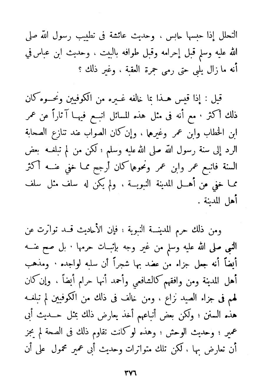 وَمِنْ ذَلِكَ حَرَمُ الْمَدِينَةِ النَّبَوِيَّةِ؛ فَإِنَّ الْأَحَادِيثَ قَدْ تَوَاتَرَتْ عَنْ النَّبِيِّ صَلَّى اللَّهُ عَلَيْهِ وَسَلَّمَ مِنْ غَيْرِ وَجْهٍ بِإِثْبَاتِ حَرَمِهَا بَلْ صَحَّ عَنْهُ أَيْضًا أَنَّهُ جَعَلَ جَزَاءَ مَنْ عَضَدَ بِهَا شَجَرًا أَنَّ سَلَبَهُ لِوَاجِدِهِ وَمَذْهَبُ أَهْلِ الْمَدِينَةِ وَمَنْ وَافَقَهُمْ كَالشَّافِعِيِّ وَأَحْمَد أَنَّهَا حَرَامٌ أَيْضًا وَإِنْ كَانَ لَهُمْ فِي جَزَاءِ الصَّيْدِ نِزَاعٌ وَمَنْ خَالَفَ فِي ذَلِكَ مِنْ الْكُوفِيِّينَ لَمْ تَبْلُغْهُ هَذِهِ السُّنَنُ؛ وَلَكِنَّ بَعْضَ أَتْبَاعِهِمْ أَخَذَ يُعَارِضُ ذَلِكَ بِمِثْلِ حَدِيثِ أَبِي عُمَيْرٍ؛ وَحَدِيثِ الْوَحْشِ؛ وَهَذِهِ لَوْ كَانَتْ تُقَاوِمُ ذَلِكَ فِي الصِّحَّةِ لَمْ يَجُزْ أَنْ تُعَارَضَ بِهَا لَكِنَّ تِلْكَ مُتَوَاتِرَاتٌ وَحَدِيثُ أَبِي عُمَيْرٍ مَحْمُولٌ عَلَى أَنَّ