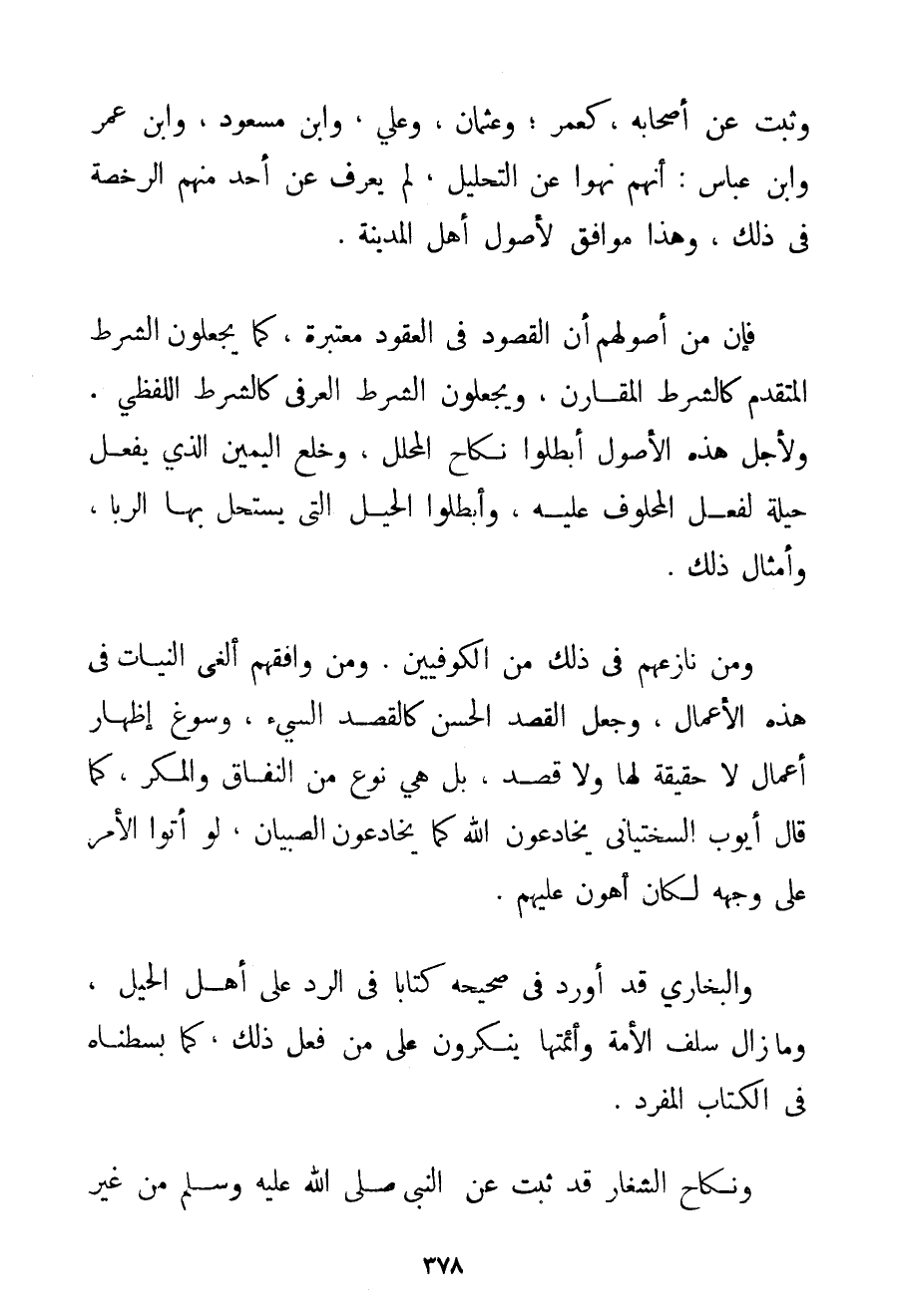 وَثَبَتَ عَنْ أَصْحَابِهِ كَعُمَرِ وَعُثْمَانَ وَعَلِيٍّ وَابْنِ مَسْعُودٍ وَابْنِ عُمَرَ وَابْنِ عَبَّاسٍ: أَنَّهُمْ نَهَوْا عَنْ التَّحْلِيلِ لَمْ يُعْرَفْ عَنْ أَحَدٍ مِنْهُمْ الرُّخْصَةُ فِي ذَلِكَ وَهَذَا مُوَافِقٌ لِأُصُولِ أَهْلِ الْمَدِينَةِ. فَإِنَّ مِنْ أُصُولِهِمْ أَنَّ القصود فِي الْعُقُودِ مُعْتَبَرَةٌ كَمَا يَجْعَلُونَ الشَّرْطَ الْمُتَقَدِّمَ كَالشَّرْطِ الْمُقَارَنِ وَيَجْعَلُونَ الشَّرْطَ الْعُرْفِيَّ كَالشَّرْطِ اللَّفْظِيِّ. وَلِأَجْلِ هَذِهِ الْأُصُولِ أَبْطَلُوا نِكَاحَ الْمُحَلِّلِ وَخُلْعَ الْيَمِينِ الَّذِي يُفْعَلُ حِيلَةً لِفِعْلِ الْمَحْلُوفِ عَلَيْهِ وَأَبْطَلُوا الْحِيَلَ الَّتِي يُسْتَحَلَّ بِهَا الرِّبَا وَأَمْثَالَ ذَلِكَ. وَمَنْ نَازَعَهُمْ فِي ذَلِكَ مِنْ الْكُوفِيِّينَ. وَمَنْ وَافَقَهُمْ أَلْغَى النِّيَّاتِ فِي هَذِهِ الْأَعْمَالِ وَجَعَلَ الْقَصْدَ الْحَسَنَ كَالْقَصْدِ السَّيِّئِ وَسَوَّغَ إظْهَارَ أَعْمَالٍ لَا حَقِيقَةَ لَهَا وَلَا قَصْدٍ بَلْ هِيَ نَوْعٌ مِنْ النِّفَاقِ وَالْمَكْرِ كَمَا قَالَ أَيُّوبُ السختياني يُخَادِعُونَ اللَّهَ كَمَا يُخَادِعُونَ الصِّبْيَانَ لَوْ أَتَوْا الْأَمْرَ عَلَى وَجْهِهِ لَكَانَ أَهْوَنَ عَلَيْهِمْ. وَالْبُخَارِيُّ قَدْ أَوْرَدَ فِي صَحِيحِهِ كِتَابًا فِي الرَّدِّ عَلَى أَهْلِ الْحِيَلِ وَمَا زَالَ سَلَفُ الْأُمَّةِ وَأَئِمَّتُهَا يُنْكِرُونَ عَلَى مَنْ فَعَلَ ذَلِكَ كَمَا بَسَطْنَاهُ فِي الْكِتَابِ الْمُفْرَدِ. وَنِكَاحُ الشِّغَارِ قَدْ ثَبَتَ عَنْ النَّبِيِّ صَلَّى اللَّهُ عَلَيْهِ وَسَلَّمَ مِنْ غَيْرِ