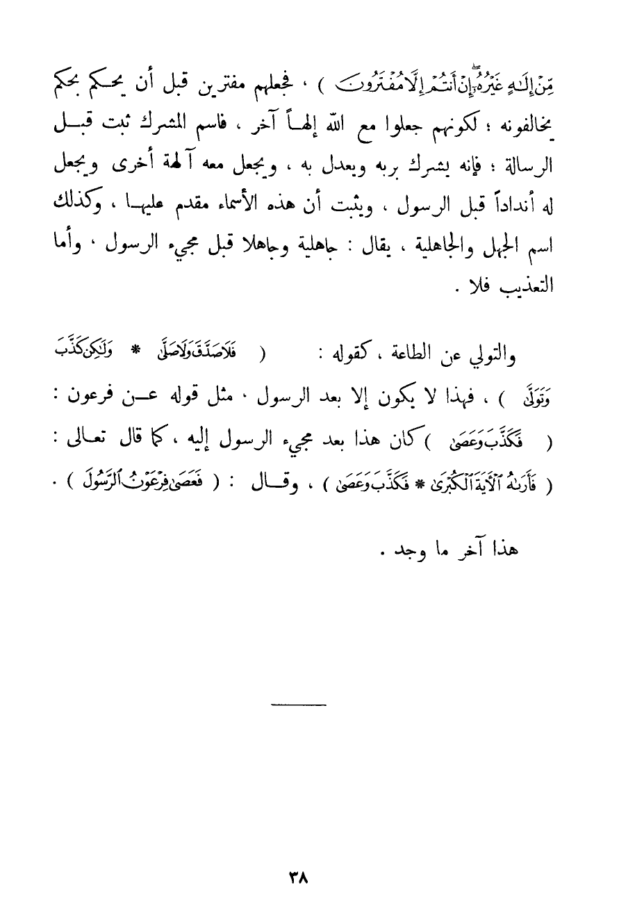 إلَهٍ غَيْرُهُ إنْ أَنْتُمْ إلَّا مُفْتَرُونَ} فَجَعَلَهُمْ مُفْتَرِينَ قَبْلَ أَنْ يَحْكُمَ بِحُكْمِ يُخَالِفُونَهُ؛ لِكَوْنِهِمْ جَعَلُوا مَعَ اللَّهِ إلَهًا آخَرَ فَاسْمُ الْمُشْرِكِ ثَبَتَ قَبْلَ الرِّسَالَةِ؛ فَإِنَّهُ يُشْرِكُ بِرَبِّهِ وَيَعْدِلُ بِهِ وَيَجْعَلُ مَعَهُ آلِهَةً أُخْرَى وَيَجْعَلُ لَهُ أَنْدَادًا قَبْلَ الرَّسُولِ وَيُثْبِتُ أَنَّ هَذِهِ الْأَسْمَاءَ مُقَدَّمٌ عَلَيْهَا وَكَذَلِكَ اسْمُ الْجَهْلِ وَالْجَاهِلِيَّةِ يُقَالُ: جَاهِلِيَّةً وَجَاهِلًا قَبْلَ مَجِيءِ الرَّسُولِ وَأَمَّا التَّعْذِيبُ فَلَا. وَالتَّوَلِّي عَنْ الطَّاعَةِ كَقَوْلِهِ: {فَلَا صَدَّقَ وَلَا صَلَّى} {وَلَكِنْ كَذَّبَ وَتَوَلَّى} فَهَذَا لَا يَكُونُ إلَّا بَعْدَ الرَّسُولِ مِثْلَ قَوْلِهِ عَنْ فِرْعَوْنَ. {فَكَذَّبَ وَعَصَى} كَانَ هَذَا بَعْدَ مَجِيءِ الرَّسُولِ إلَيْهِ كَمَا قَالَ تَعَالَى. {فَأَرَاهُ الْآيَةَ الْكُبْرَى} {فَكَذَّبَ وَعَصَى} وَقَالَ: {فَعَصَى فِرْعَوْنُ الرَّسُولَ} (1) .