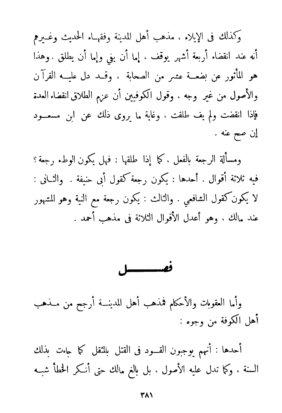 وَأَمَّا الْعُقُوبَاتُ وَالْأَحْكَامُ فَمَذْهَبُ أَهْلِ الْمَدِينَةِ أَرْجَحُ مِنْ مَذْهَبِ أَهْلِ الْكُوفَةِ مِنْ وُجُوهٍ: أَحَدُهَا: أَنَّهُمْ يُوجِبُونَ الْقَوَدَ فِي الْقَتْلِ بِالْمُثْقَلِ كَمَا جَاءَتْ بِذَلِكَ السُّنَّةُ وَكَمَا تَدُلُّ عَلَيْهِ الْأُصُولُ بَلْ بَالَغَ مَالِكٌ حَتَّى أَنْكَرَ الْخَطَأَ شِبْهَ