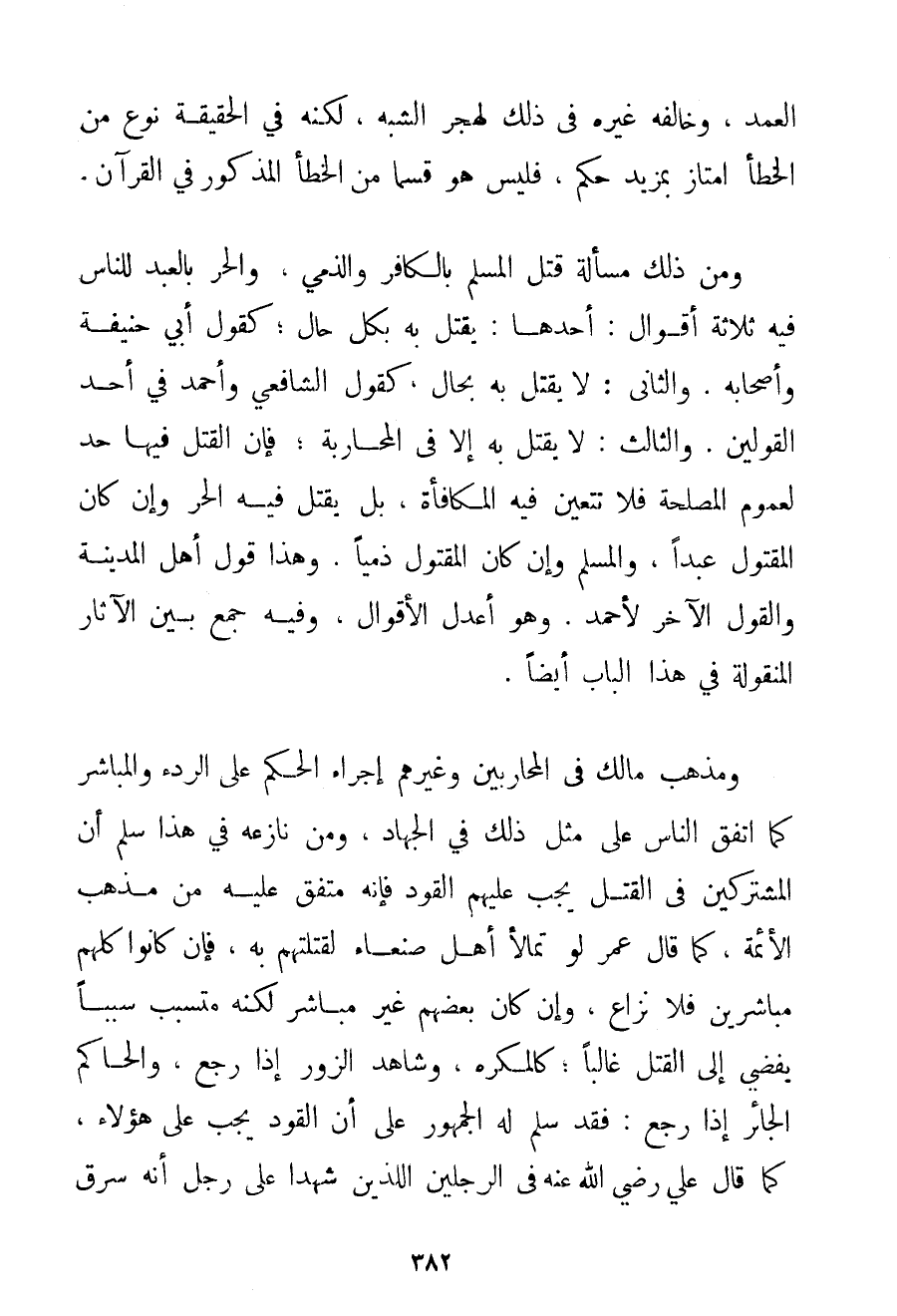 الْعَمْدِ وَخَالَفَهُ غَيْرُهُ فِي ذَلِكَ لِهَجْرِ الشِّبْهِ لَكِنَّهُ فِي الْحَقِيقَةِ نَوْعٌ مِنْ الْخَطَأِ امْتَازَ بِمَزِيدِ حُكْمٍ فَلَيْسَ هُوَ قِسْمًا مِنْ الْخَطَأِ الْمَذْكُورِ فِي الْقُرْآنِ. وَمِنْ ذَلِكَ مَسْأَلَةُ قَتْلِ الْمُسْلِمِ بِالْكَافِرِ وَالذِّمِّيِّ وَالْحُرِّ بِالْعَبْدِ لِلنَّاسِ فِيهِ ثَلَاثَةُ أَقْوَالٍ: أَحَدُهَا: يُقْتَلُ بِهِ بِكُلِّ حَالٍ؛ كَقَوْلِ أَبِي حَنِيفَةَ وَأَصْحَابِهِ. وَالثَّانِي: لَا يُقْتَلُ بِهِ بِحَالِ كَقَوْلِ الشَّافِعِيِّ وَأَحْمَد فِي أَحَدِ الْقَوْلَيْنِ. وَالثَّالِثُ: لَا يُقْتَلُ بِهِ إلَّا فِي الْمُحَارَبَةِ؛ فَإِنَّ الْقَتْلَ فِيهَا حَدٌّ لِعُمُومِ الْمَصْلَحَةِ فَلَا تَتَعَيَّنُ فِيهِ الْمُكَافَأَةُ بَلْ يُقْتَلُ فِيهِ الْحُرُّ وَإِنْ كَانَ الْمَقْتُولُ عَبْدًا وَالْمُسْلِمُ وَإِنْ كَانَ الْمَقْتُولُ ذِمِّيًّا. وَهَذَا قَوْلُ أَهْلِ الْمَدِينَةِ وَالْقَوْلُ الْآخَرُ لِأَحْمَدَ وَهُوَ أَعْدَلُ الْأَقْوَالِ وَفِيهِ جَمْعٌ بَيْنَ الْآثَارِ الْمَنْقُولَةِ فِي هَذَا الْبَابِ أَيْضًا. وَمَذْهَبُ مَالِكٍ فِي الْمُحَارَبِينَ وَغَيْرِهِمْ إجْرَاءُ الْحُكْمِ عَلَى الرَّدْءِ وَالْمُبَاشِرِ كَمَا اتَّفَقَ النَّاسُ عَلَى مِثْلِ ذَلِكَ فِي الْجِهَادِ. وَمَنْ نَازَعَهُ فِي هَذَا سَلَّمَ أَنَّ الْمُشْتَرِكِينَ فِي الْقَتْلِ يَجِبُ عَلَيْهِمْ الْقَوَدُ فَإِنَّهُ مُتَّفَقٌ عَلَيْهِ مِنْ مَذْهَبِ الْأَئِمَّةِ كَمَا قَالَ عُمَرُ لَوْ تَمَالَأَ أَهْلُ صَنْعَاءَ لَقَتَلْتهمْ بِهِ فَإِنْ كَانُوا كُلُّهُمْ مُبَاشِرِينَ فَلَا نِزَاعَ وَإِنْ كَانَ بَعْضُهُمْ غَيْرَ مُبَاشِرٍ لَكِنَّهُ مُتَسَبِّبٌ سَبَبًا يُفْضِي إلَى الْقَتْلِ غَالِبًا: كَالْمُكْرَهِ وَشَاهِدِ الزُّورِ إذَا رَجَعَ وَالْحَاكِمِ الْجَائِرِ إذَا رَجَعَ: فَقَدْ سَلَّمَ لَهُ الْجُمْهُورُ عَلَى أَنَّ الْقَوَدَ يَجِبُ عَلَى هَؤُلَاءِ كَمَا قَالَ عَلِيٌّ رَضِيَ اللَّهُ عَنْهُ فِي الرَّجُلَيْنِ اللَّذَيْنِ شَهِدَا عَلَى رَجُلٍ أَنَّهُ سَرَقَ