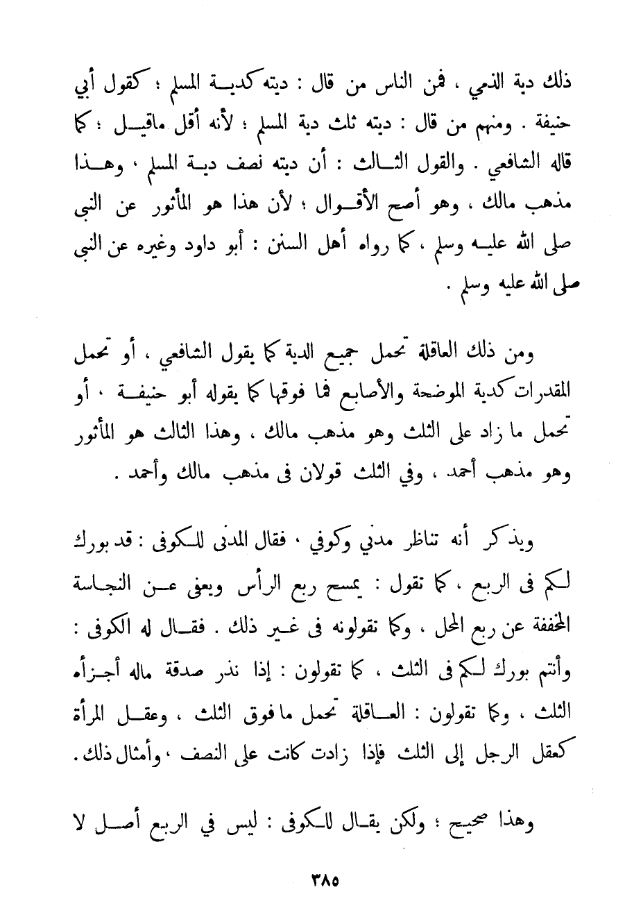 ذَلِكَ دِيَةُ الذِّمِّيِّ فَمِنْ النَّاسِ مَنْ قَالَ: دِيَتُهُ كَدِيَةِ الْمُسْلِمِ؛ كَقَوْلِ أَبِي حَنِيفَةَ. وَمِنْهُمْ مَنْ قَالَ: دِيَتُهُ ثُلُثُ دِيَةِ الْمُسْلِمِ؛ لِأَنَّهُ أَقَلُّ مَا قِيلَ؛ كَمَا قَالَهُ الشَّافِعِيُّ. وَالْقَوْلُ الثَّالِثُ: أَنَّ دِيَتَهُ نِصْفُ دِيَةِ الْمُسْلِمِ وَهَذَا مَذْهَبُ مَالِكٍ وَهُوَ أَصَحُّ الْأَقْوَالِ؛ لِأَنَّ هَذَا هُوَ الْمَأْثُورُ عَنْ النَّبِيِّ صَلَّى اللَّهُ عَلَيْهِ وَسَلَّمَ كَمَا رَوَاهُ أَهْلُ السُّنَنِ: أَبُو دَاوُد وَغَيْرُهُ عَنْ النَّبِيِّ صَلَّى اللَّهُ عَلَيْهِ وَسَلَّمَ. وَمِنْ ذَلِكَ الْعَاقِلَةُ تَحْمِلُ جَمِيعَ الدِّيَةِ كَمَا يَقُولُ الشَّافِعِيُّ أَوْ تَحْمِلُ الْمُقَدَّرَاتِ كَدِيَةِ الْمُوضِحَةِ وَالْأَصَابِعِ فَمَا فَوْقَهَا كَمَا يَقُولُهُ أَبُو حَنِيفَةَ أَوْ تَحْمِلُ مَا زَادَ عَلَى الثُّلُثِ وَهُوَ مَذْهَبُ مَالِكٍ وَهَذَا الثَّالِثُ هُوَ الْمَأْثُورُ وَهُوَ مَذْهَبُ أَحْمَد وَفِي الثُّلُثِ قَوْلَانِ فِي مَذْهَبِ مَالِكٍ وَأَحْمَد. وَيُذْكَرُ أَنَّهُ تَنَاظَرَ مَدَنِيٌّ وَكُوفِيٌّ فَقَالَ الْمَدَنِيُّ لِلْكُوفِيِّ: قَدْ بُورِكَ لَكُمْ فِي الرُّبُعِ كَمَا تَقُولُ: يُمْسَحُ رُبُعُ الرَّأْسِ وَيُعْفَى عَنْ النَّجَاسَةِ الْمُخَفَّفَةِ عَنْ رُبُعِ الْمَحَلِّ وَكَمَا تَقُولُونَهُ فِي غَيْرِ ذَلِكَ. فَقَالَ لَهُ الْكُوفِيُّ: وَأَنْتُمْ بُورِكَ لَكُمْ فِي الثُّلُثِ كَمَا تَقُولُونَ: إذَا نَذَرَ صَدَقَةَ مَالِهِ أَجْزَأَهُ الثُّلُثُ؛ وَكَمَا تَقُولُونَ: الْعَاقِلَةُ تَحْمِلُ مَا فَوْقَ الثُّلُثِ وَعَقْلُ الْمَرْأَةِ كَعَقْلِ الرَّجُلِ إلَى الثُّلُثِ فَإِذَا زَادَتْ كَانَتْ عَلَى النِّصْفِ وَأَمْثَالِ ذَلِكَ. وَهَذَا صَحِيحٌ؛ وَلَكِنْ يُقَالُ لِلْكُوفِيِّ: لَيْسَ فِي الرُّبُعِ أَصْلٌ لَا