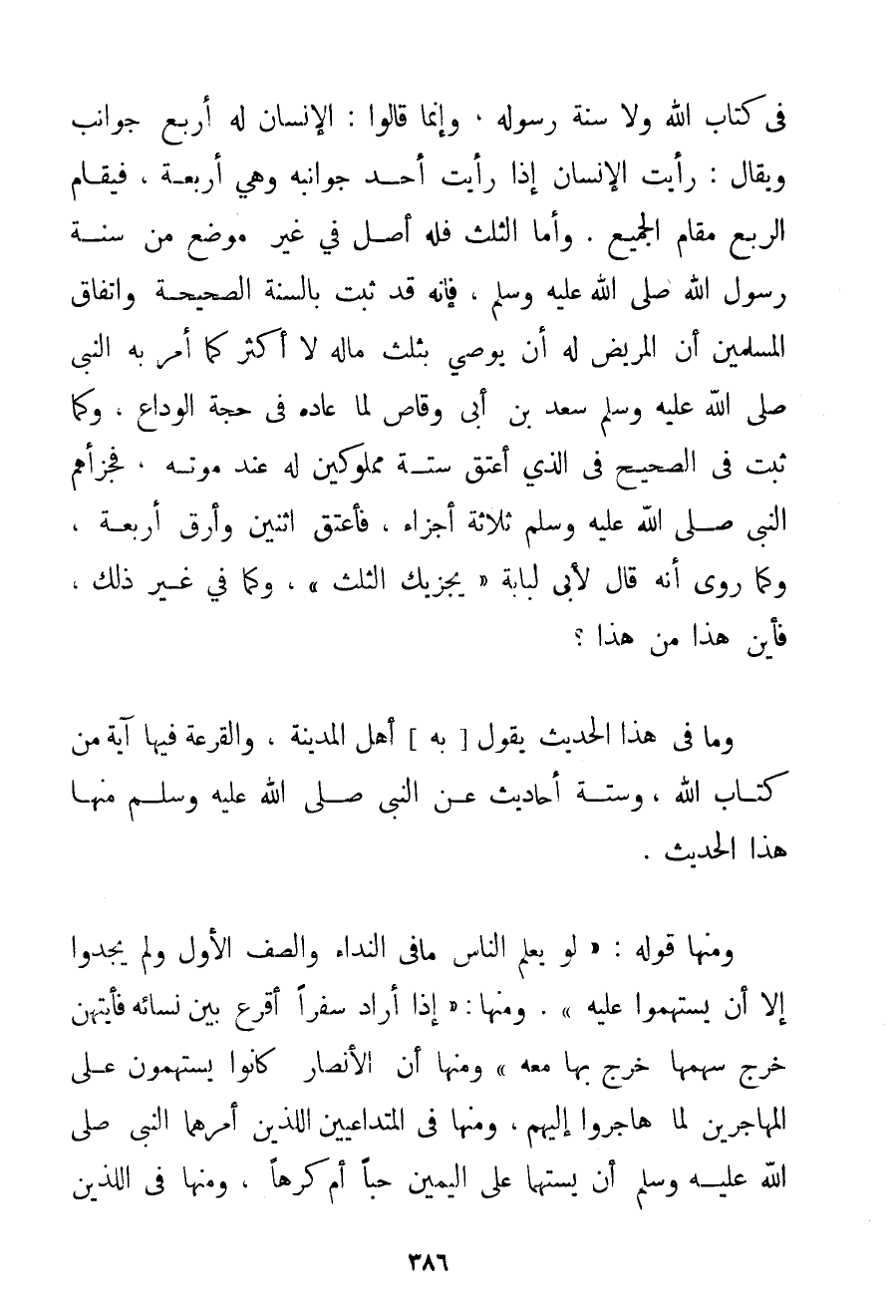 فِي كِتَابِ اللَّهِ وَلَا سُنَّةِ رَسُولِهِ وَإِنَّمَا قَالُوا: الْإِنْسَانُ لَهُ أَرْبَعُ جَوَانِبَ وَيُقَالُ: رَأَيْت الْإِنْسَانَ إذَا رَأَيْت أَحَدَ جَوَانِبِهِ وَهِيَ أَرْبَعَةٌ فَيُقَامُ الرُّبُعُ مَقَامَ الْجَمِيعِ. وَأَمَّا الثُّلُثُ فَلَهُ أَصْلٌ فِي غَيْرِ مَوْضِعٍ مِنْ سُنَّةِ رَسُولِ اللَّهِ صَلَّى اللَّهُ عَلَيْهِ وَسَلَّمَ فَإِنَّهُ قَدْ ثَبَتَ بِالسُّنَّةِ الصَّحِيحَةِ وَاتِّفَاقِ الْمُسْلِمِينَ أَنَّ الْمَرِيضَ لَهُ أَنْ يُوصِيَ بِثُلُثِ مَالِهِ لَا أَكْثَرَ كَمَا أَمَرَ بِهِ النَّبِيُّ صَلَّى اللَّهُ عَلَيْهِ وَسَلَّمَ سَعْدَ بْنَ أَبِي وَقَّاصٍ لَمَّا عَادَهُ فِي حَجَّةِ الْوَدَاعِ وَكَمَا ثَبَتَ فِي الصَّحِيحِ فِي الَّذِي أَعْتَقَ سِتَّةً مَمْلُوكِينَ لَهُ عِنْدَ مَوْتِهِ فَجَزَّأَهُمْ النَّبِيُّ صَلَّى اللَّهُ عَلَيْهِ وَسَلَّمَ ثَلَاثَةَ أَجْزَاءٍ فَأَعْتَقَ اثْنَيْنِ وَأَرَقَّ أَرْبَعَةً وَكَمَا رُوِيَ أَنَّهُ قَالَ لِأَبِي لُبَابَةَ " يَجْزِيك الثُّلُثُ " وَكَمَا فِي غَيْرِ ذَلِكَ فَأَيْنَ هَذَا مِنْ هَذَا؟ وَمَا فِي هَذَا الْحَدِيثِ يَقُولُ بِهِ أَهْلُ الْمَدِينَةِ وَالْقُرْعَةُ فِيهَا آيَةٌ مِنْ كِتَابِ اللَّهِ وَسِتَّةُ أَحَادِيثَ عَنْ النَّبِيِّ صَلَّى اللَّهُ عَلَيْهِ وَسَلَّمَ مِنْهَا هَذَا الْحَدِيثُ. وَمِنْهَا قَوْلُهُ: {لَوْ يَعْلَمُ النَّاسُ مَا فِي النِّدَاءِ وَالصَّفِّ الْأَوَّلِ وَلَمْ يَجِدُوا إلَّا أَنْ يستهموا عَلَيْهِ} . وَمِنْهَا: {إذَا أَرَادَ سَفَرًا أَقْرَعَ بَيْنَ نِسَائِهِ فَأَيَّتُهُنَّ خَرَجَ سَهْمُهَا خَرَجَ بِهَا مَعَهُ} وَمِنْهَا أَنَّ الْأَنْصَارَ كَانُوا يستهمون عَلَى الْمُهَاجِرِينَ لَمَّا هَاجَرُوا إلَيْهِمْ وَمِنْهَا فِي الْمُتَدَاعِيَيْنِ اللَّذَيْنِ أَمَرَهُمَا النَّبِيُّ صَلَّى اللَّهُ عَلَيْهِ وَسَلَّمَ أَنْ يَسْتَهِمَا عَلَى الْيَمِينِ حَبَّا أَمْ كَرِهَا وَمِنْهَا فِي {اللَّذَيْنِ