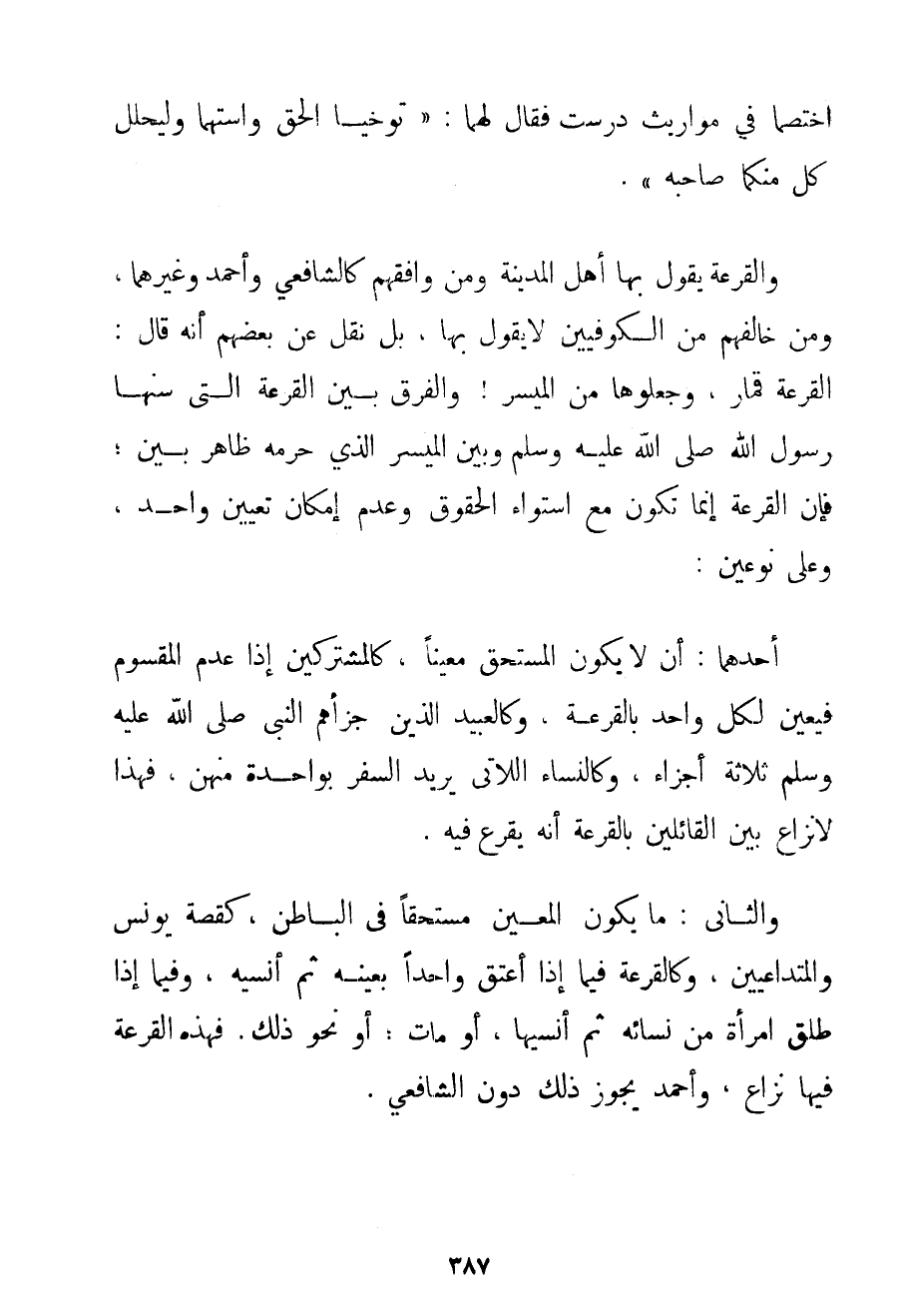 اخْتَصَمَا فِي مَوَارِيثَ دُرِسَتْ فَقَالَ لَهُمَا: تَوَخَّيَا الْحَقَّ وَاسْتَهِمَا وَلْيَحْلِلْ كُلٌّ مِنْكُمَا صَاحِبَهُ} . وَالْقُرْعَةُ يَقُولُ بِهَا أَهْلُ الْمَدِينَةِ وَمَنْ وَافَقَهُمْ كَالشَّافِعِيِّ وَأَحْمَد وَغَيْرِهِمَا وَمَنْ خَالَفَهُمْ مِنْ الْكُوفِيِّينَ لَا يَقُولُ بِهَا بَلْ نُقِلَ عَنْ بَعْضِهِمْ أَنَّهُ قَالَ: الْقُرْعَةُ قِمَارٌ وَجَعَلُوهَا مِنْ الْمَيْسِرِ وَالْفَرْقُ بَيْنَ الْقُرْعَةِ الَّتِي سَنَّهَا رَسُولُ اللَّهِ صَلَّى اللَّهُ عَلَيْهِ وَسَلَّمَ وَبَيْنَ الْمَيْسِرِ الَّذِي حَرَّمَهُ ظَاهِرٌ بَيِّنٌ؛ فَإِنَّ الْقُرْعَةَ إنَّمَا تَكُونُ مَعَ اسْتِوَاءِ الْحُقُوقِ وَعَدَمِ إمْكَانِ تَعْيِينِ وَاحِدٍ وَعَلَى نَوْعَيْنِ: أَحَدُهُمَا: أَنْ لَا يَكُونَ الْمُسْتَحَقُّ مُعَيَّنًا كَالْمُشْتَرَكِينَ إذَا عُدِمَ الْمَقْسُومُ فَيُعَيَّنُ لِكُلِّ وَاحِدٍ بِالْقَرْعَةِ وَكَالْعَبِيدِ الَّذِينَ جَزَّأَهُمْ النَّبِيُّ صَلَّى اللَّهُ عَلَيْهِ وَسَلَّمَ ثَلَاثَةَ أَجْزَاءٍ وَكَالنِّسَاءِ اللَّاتِي يُرِيدُ السَّفَرَ بِوَاحِدَةٍ مِنْهُنَّ فَهَذَا لَا نِزَاعَ بَيْنَ الْقَائِلِينَ بِالْقُرْعَةِ أَنَّهُ يُقْرَعُ فِيهِ. وَالثَّانِي: مَا يَكُونُ الْمُعَيَّنُ مُسْتَحَقًّا فِي الْبَاطِنِ كَقِصَّةِ يُونُسَ والمتداعيين وَكَالْقُرْعَةِ فِيمَا إذَا أَعْتَقَ وَاحِدًا بِعَيْنِهِ ثُمَّ أُنْسِيَهُ وَفِيمَا إذَا طَلَّقَ امْرَأَةً مِنْ نِسَائِهِ ثُمَّ أُنْسِيَهَا أَوْ مَاتَ: أَوْ نَحْوَ ذَلِكَ. فَهَذِهِ الْقُرْعَةُ فِيهَا نِزَاعٌ وَأَحْمَد يُجَوِّزُ ذَلِكَ دُونَ الشَّافِعِيِّ.