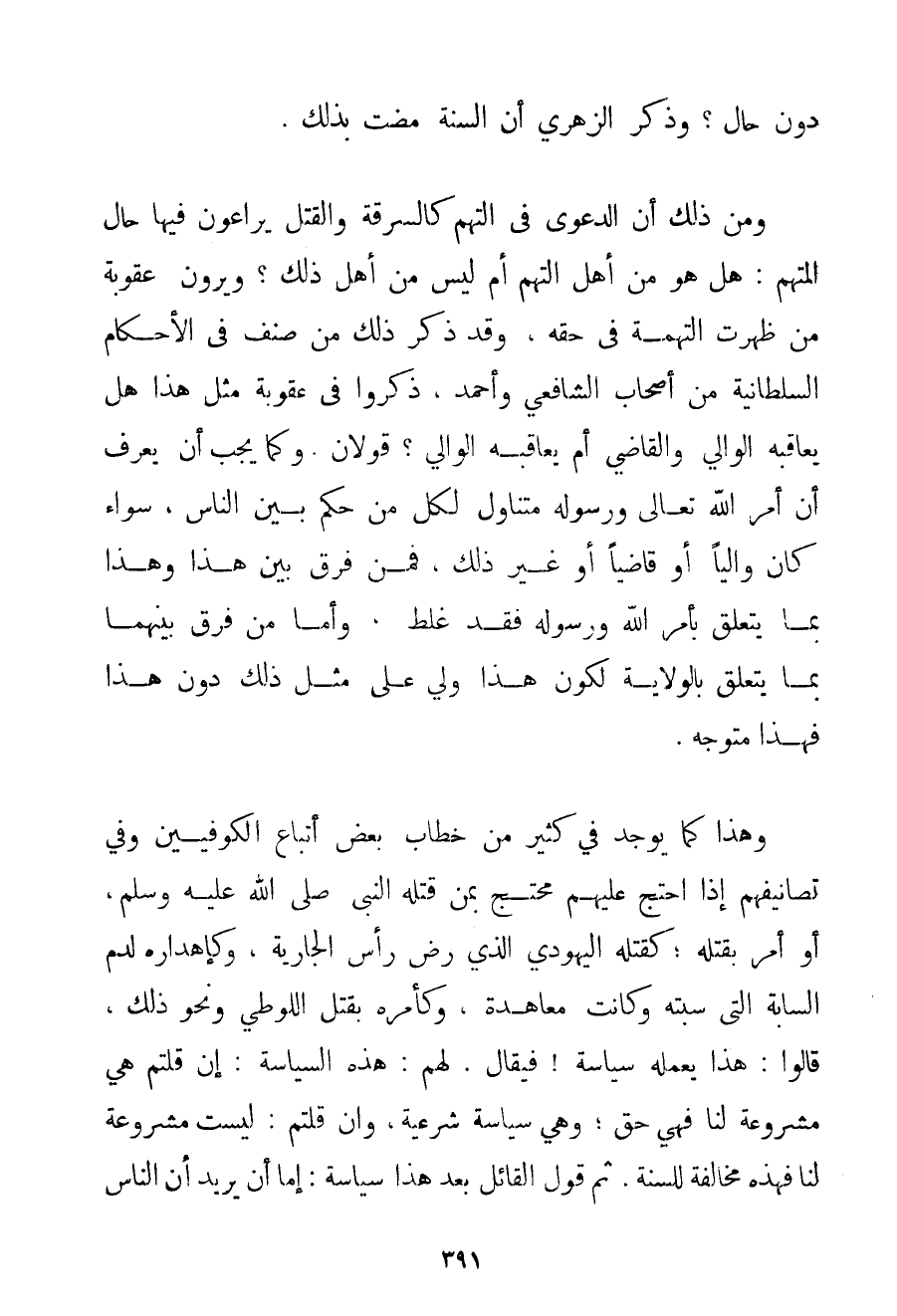 وَمِنْ ذَلِكَ أَنَّ الدَّعْوَى فِي التُّهَمِ كَالسَّرِقَةِ وَالْقَتْلِ يُرَاعُونَ فِيهَا حَالَ الْمُتَّهَمِ: هَلْ هُوَ مِنْ أَهْلِ التُّهَمِ أَمْ لَيْسَ مِنْ أَهْلِ ذَلِكَ؟ وَيَرَوْنَ عُقُوبَةَ مَنْ ظَهَرَتْ التُّهْمَةُ فِي حَقِّهِ وَقَدْ ذَكَرَ ذَلِكَ مَنْ صَنَّفَ فِي الْأَحْكَامِ السُّلْطَانِيَّةِ مِنْ أَصْحَابِ الشَّافِعِيِّ وَأَحْمَد ذَكَرُوا فِي عُقُوبَةِ مِثْلَ هَذَا هَلْ يُعَاقِبُهُ الْوَالِي وَالْقَاضِي أَمْ يُعَاقِبُهُ الْوَالِي؟ قَوْلَانِ. وَكَمَا يَجِبُ أَنْ يُعْرَفَ أَنَّ أَمْرَ اللَّهِ تَعَالَى وَرَسُولِهِ مُتَنَاوِلٌ لِكُلِّ مَنْ حَكَمَ بَيْنَ النَّاسِ سَوَاءٌ كَانَ وَالِيًا أَوْ قَاضِيًا أَوْ غَيْرَ ذَلِكَ فَمَنْ فَرَّقَ بَيْنَ هَذَا وَهَذَا بِمَا يَتَعَلَّقُ بِأَمْرِ اللَّهِ وَرَسُولِهِ فَقَدْ غَلِطَ وَأَمَّا مَنْ فَرَّقَ بَيْنَهُمَا بِمَا يَتَعَلَّقُ بِالْوِلَايَةِ لِكَوْنِ هَذَا وَلِيٍّ عَلَى مِثْلِ ذَلِكَ دُونَ هَذَا فَهَذَا مُتَوَجِّهٌ. وَهَذَا كَمَا يُوجَدُ فِي كَثِيرٍ مِنْ خِطَابِ بَعْضِ أَتْبَاعِ الْكُوفِيِّينَ وَفِي تَصَانِيفِهِمْ إذَا احْتَجَّ عَلَيْهِمْ مُحْتَجٌّ بِمَنْ قَتَلَهُ النَّبِيُّ صَلَّى اللَّهُ عَلَيْهِ وَسَلَّمَ أَوْ أَمَرَ بِقَتْلِهِ؛ كَقَتْلِهِ الْيَهُودِيَّ الَّذِي رَضَّ رَأْسَ الْجَارِيَةِ وَكَإِهْدَارِهِ لِدَمِ السَّابَّةِ الَّتِي سَبَّتْهُ وَكَانَتْ مُعَاهَدَةً وَكَأَمْرِهِ بِقَتْلِ اللُّوطِيِّ وَنَحْوِ ذَلِكَ. قَالُوا: هَذَا يَعْمَلُهُ سِيَاسَةً فَيُقَالُ. لَهُمْ: هَذِهِ السِّيَاسَةُ: إنْ قُلْتُمْ هِيَ مَشْرُوعَةٌ لَنَا فَهِيَ حَقٌّ؛ وَهِيَ سِيَاسَةٌ شَرْعِيَّةٌ وَإِنْ قُلْتُمْ: لَيْسَتْ مَشْرُوعَةً لَنَا فَهَذِهِ مُخَالِفَةٌ لِلسُّنَّةِ. ثُمَّ قَوْلُ الْقَائِلِ بَعْدَ هَذَا سِيَاسَةٌ: إمَّا أَنْ يُرِيدَ أَنَّ النَّاسَ