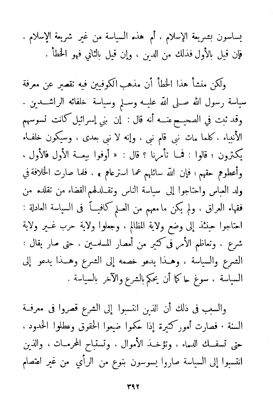 يُسَاسُونَ بِشَرِيعَةِ الْإِسْلَامِ أَمْ هَذِهِ السِّيَاسَةُ مِنْ غَيْرِ شَرِيعَةِ الْإِسْلَامِ. فَإِنْ قِيلَ بِالْأَوَّلِ فَذَلِكَ مِنْ الدِّينِ وَإِنْ قِيلَ بِالثَّانِي فَهُوَ الْخَطَأُ. وَلَكِنَّ مَنْشَأَ هَذَا الْخَطَأِ أَنَّ مَذْهَبَ الْكُوفِيِّينَ فِيهِ تَقْصِيرٌ عَنْ مَعْرِفَةِ سِيَاسَةِ رَسُولِ اللَّهِ صَلَّى اللَّهُ عَلَيْهِ وَسَلَّمَ وَسِيَاسَةِ خُلَفَائِهِ الرَّاشِدِينَ. وَقَدْ ثَبَتَ فِي الصَّحِيحِ عَنْهُ أَنَّهُ قَالَ: {إنَّ بَنِي إسْرَائِيلَ كَانَتْ تَسُوسُهُمْ الْأَنْبِيَاءُ كُلَّمَا مَاتَ نَبِيٌّ قَامَ نَبِيٌّ. وَإِنَّهُ لَا نَبِيَّ بَعْدِي وَسَيَكُونُ خُلَفَاءُ يَكْثُرُونَ؛ قَالُوا: فَمَا تَأْمُرُنَا؟ قَالَ: أَوْفُوا بَيْعَةَ الْأَوَّلِ فَالْأَوَّلَ وَأَعْطُوهُمْ حَقَّهُمْ؛ فَإِنَّ اللَّهَ سَائِلُهُمْ عَمَّا اسْتَرْعَاهُمْ} فَلَمَّا صَارَتْ الْخِلَافَةُ فِي وَلَدِ الْعَبَّاسِ وَاحْتَاجُوا إلَى سِيَاسَةِ النَّاسِ وَتَقَلَّدَ لَهُمْ الْقَضَاءَ مَنْ تَقَلَّدَهُ مِنْ فُقَهَاءِ الْعِرَاقِ وَلَمْ يَكُنْ مَا مَعَهُمْ مِنْ الْعِلْمِ كَافِيًا فِي السِّيَاسَةِ الْعَادِلَةِ: احْتَاجُوا حِينَئِذٍ إلَى وَضْعِ وِلَايَةِ الْمَظَالِمِ وَجَعَلُوا وِلَايَةَ حَرْبٍ غَيْرَ وِلَايَةِ شَرْعٍ وَتَعَاظَمَ الْأَمْرُ فِي كَثِيرٍ مِنْ أَمْصَارِ الْمُسْلِمِينَ حَتَّى صَارَ يُقَالُ: الشَّرْعُ وَالسِّيَاسَةُ وَهَذَا يَدْعُو خَصْمَهُ إلَى الشَّرْعِ وَهَذَا يَدْعُو إلَى السِّيَاسَةِ سَوَّغَ حَاكِمًا أَنْ يَحْكُمَ بِالشَّرْعِ وَالْآخَرُ بِالسِّيَاسَةِ. وَالسَّبَبُ فِي ذَلِكَ أَنَّ الَّذِينَ انْتَسَبُوا إلَى الشَّرْعِ قَصَّرُوا فِي مَعْرِفَةِ السُّنَّةِ فَصَارَتْ أُمُورٌ كَثِيرَةٌ إذَا حَكَمُوا ضَيَّعُوا الْحُقُوقَ وَعَطَّلُوا الْحُدُودَ حَتَّى تُسْفَكَ الدِّمَاءُ وَتُؤْخَذَ الْأَمْوَالُ وَتُسْتَبَاحَ الْمُحَرَّمَاتُ؟ وَاَلَّذِينَ انْتَسَبُوا إلَى السِّيَاسَةِ صَارُوا يَسُوسُونَ بِنَوْعِ مِنْ الرَّأْيِ مِنْ غَيْرِ اعْتِصَامٍ