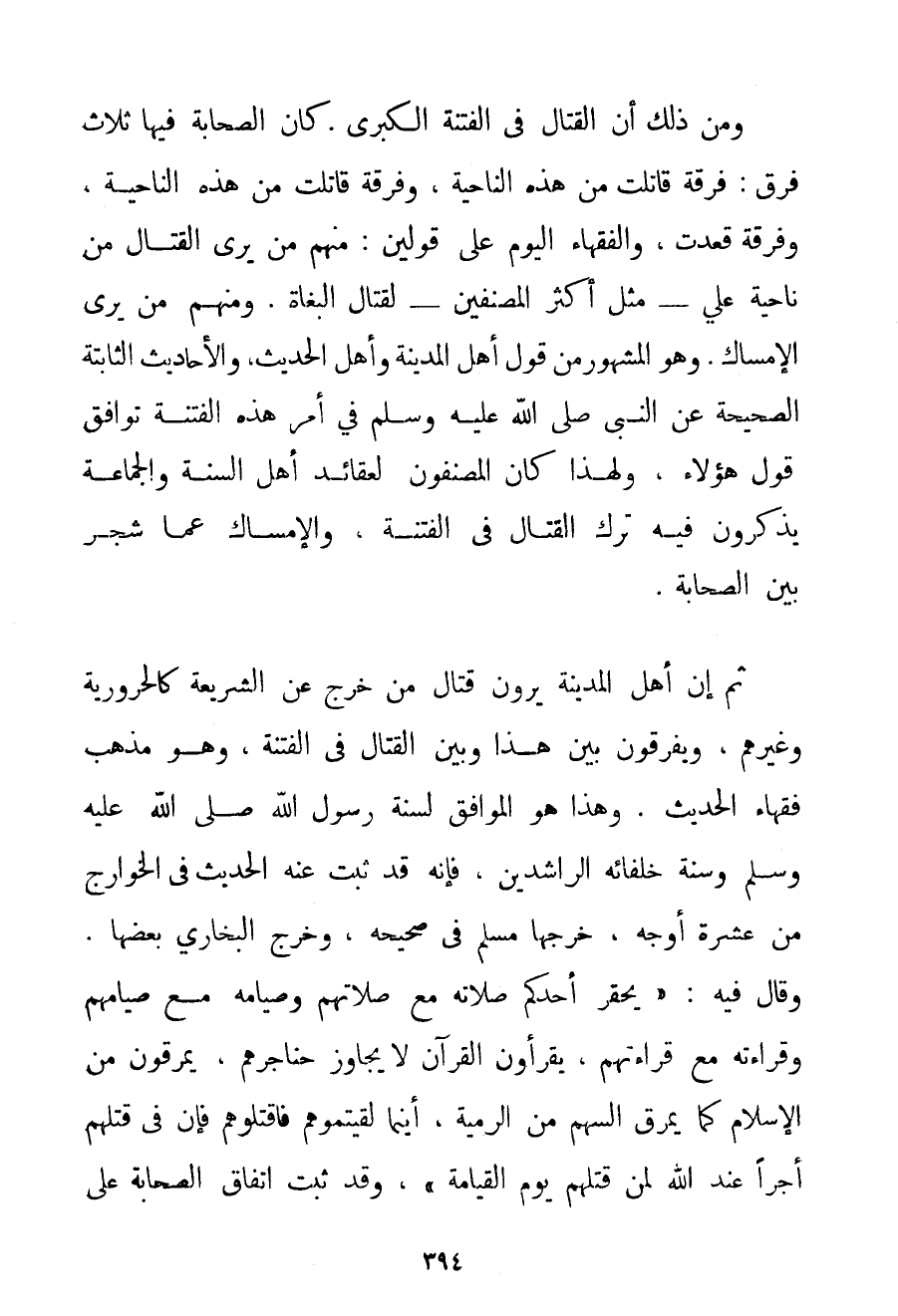 وَمِنْ ذَلِكَ أَنَّ الْقِتَالَ فِي الْفِتْنَةِ الْكُبْرَى. كَانَ الصَّحَابَةُ فِيهَا ثَلَاثَ فِرَقٍ: فِرْقَةٌ قَاتَلَتْ مِنْ هَذِهِ النَّاحِيَةِ وَفِرْقَةٌ قَاتَلَتْ مِنْ هَذِهِ النَّاحِيَةِ وَفِرْقَةٌ قَعَدَتْ وَالْفُقَهَاءُ الْيَوْمَ عَلَى قَوْلَيْنِ: مِنْهُمْ مَنْ يَرَى الْقِتَالَ مِنْ نَاحِيَةِ عَلِيٍّ - مِثْلَ أَكْثَرِ الْمُصَنِّفِينَ - لِقِتَالِ الْبُغَاةِ. وَمِنْهُمْ مَنْ يَرَى الْإِمْسَاكَ. وَهُوَ الْمَشْهُورُ مِنْ قَوْلِ أَهْلِ الْمَدِينَةِ وَأَهْلِ الْحَدِيثِ وَالْأَحَادِيثُ الثَّابِتَةُ الصَّحِيحَةُ عَنْ النَّبِيِّ صَلَّى اللَّهُ عَلَيْهِ وَسَلَّمَ فِي أَمْرِ هَذِهِ الْفِتْنَةِ تُوَافِقُ قَوْلَ هَؤُلَاءِ وَلِهَذَا كَانَ الْمُصَنِّفُونَ لِعَقَائِدِ أَهْلِ السُّنَّةِ وَالْجَمَاعَةِ يَذْكُرُونَ فِيهِ تَرْكَ الْقِتَالِ فِي الْفِتْنَةِ وَالْإِمْسَاكَ عَمَّا شَجَرَ بَيْنَ الصَّحَابَةِ.