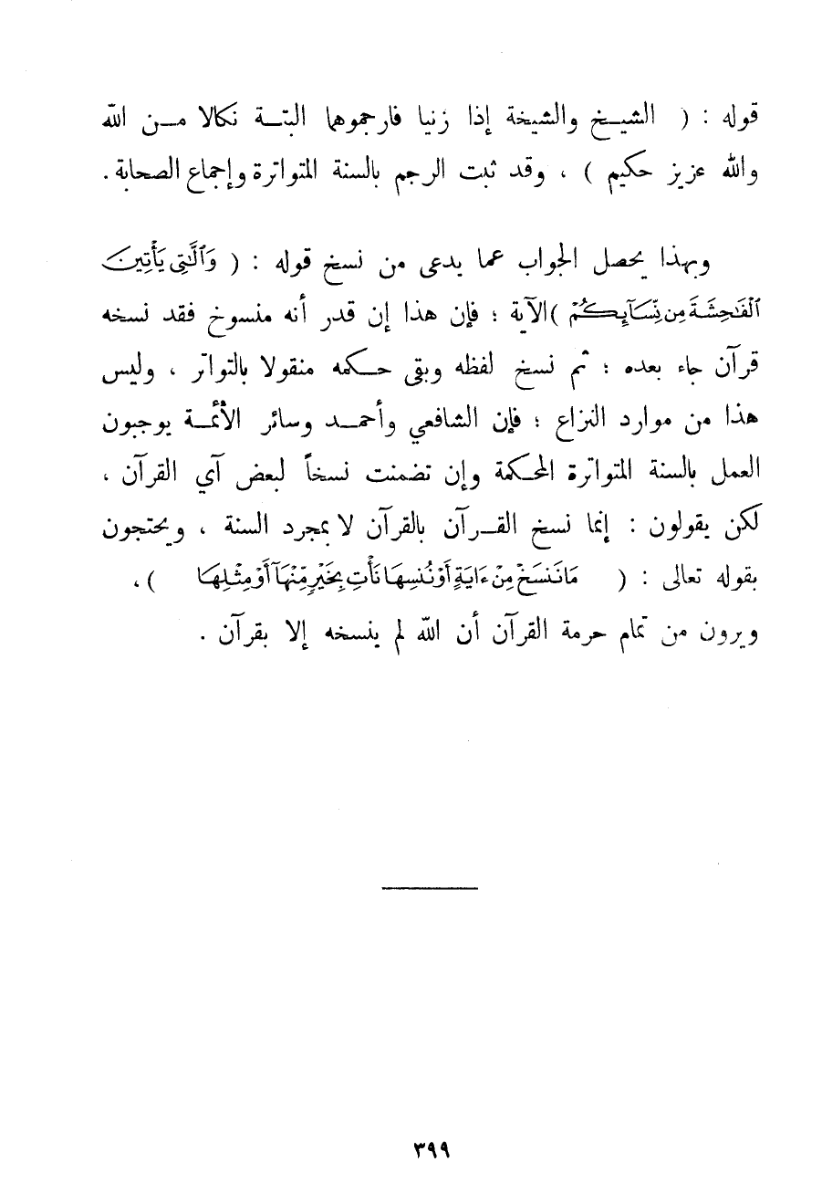 قَوْلُهُ: وَالشَّيْخُ وَالشَّيْخَةُ إذَا زَنَيَا فَارْجُمُوهُمَا أَلْبَتَّةَ نَكَالًا مِنْ اللَّهِ وَاَللَّهُ عَزِيزٌ حَكِيمٌ وَقَدْ ثَبَتَ الرَّجْمُ بِالسُّنَّةِ الْمُتَوَاتِرَةِ وَإِجْمَاعِ الصَّحَابَةِ. وَبِهَذَا يَحْصُلُ الْجَوَابُ عَمَّا يُدَّعَى مِنْ نَسْخِ قَوْلِهِ: {وَاللَّاتِي يَأْتِينَ الْفَاحِشَةَ مِنْ نِسَائِكُمْ} الْآيَةَ؛ فَإِنَّ هَذَا إنْ قَدَرَ أَنَّهُ مَنْسُوخٌ فَقَدْ نَسَخَهُ قُرْآنٌ جَاءَ بَعْدَهُ؛ ثُمَّ نُسِخَ لَفْظُهُ وَبَقِيَ حُكْمُهُ مَنْقُولًا بِالتَّوَاتُرِ وَلَيْسَ هَذَا مِنْ مَوَارِدِ النِّزَاعِ؛ فَإِنَّ الشَّافِعِيَّ وَأَحْمَد وَسَائِرَ الْأَئِمَّةِ يُوجِبُونَ الْعَمَلَ بِالسُّنَّةِ الْمُتَوَاتِرَةِ الْمُحْكَمَةِ وَإِنْ تَضَمَّنَتْ نَسْخًا لِبَعْضِ آيِ الْقُرْآنِ لَكِنْ يَقُولُونَ: إنَّمَا نُسِخَ الْقُرْآنُ بِالْقُرْآنِ لَا بِمُجَرَّدِ السُّنَّةِ وَيَحْتَجُّونَ بِقَوْلِهِ تَعَالَى: {مَا نَنْسَخْ مِنْ آيَةٍ أَوْ نُنْسِهَا نَأْتِ بِخَيْرٍ مِنْهَا أَوْ مِثْلِهَا} وَيَرَوْنَ مِنْ تَمَامِ حُرْمَةِ الْقُرْآنِ أَنَّ اللَّهَ لَمْ يَنْسَخْهُ إلَّا بِقُرْآنِ.